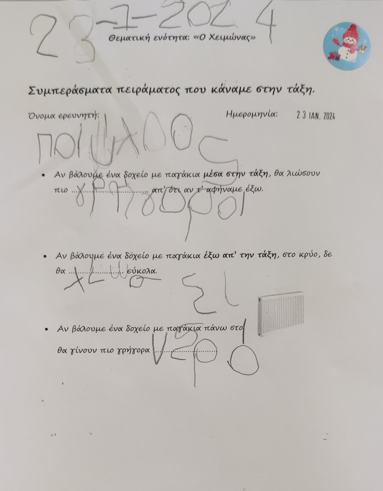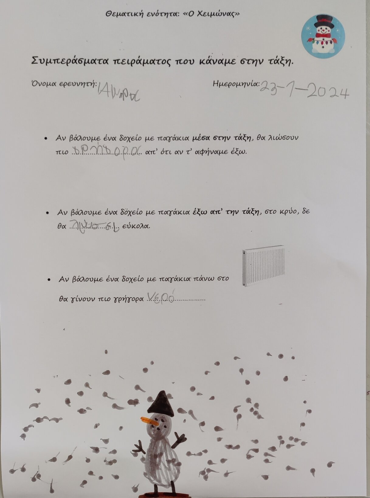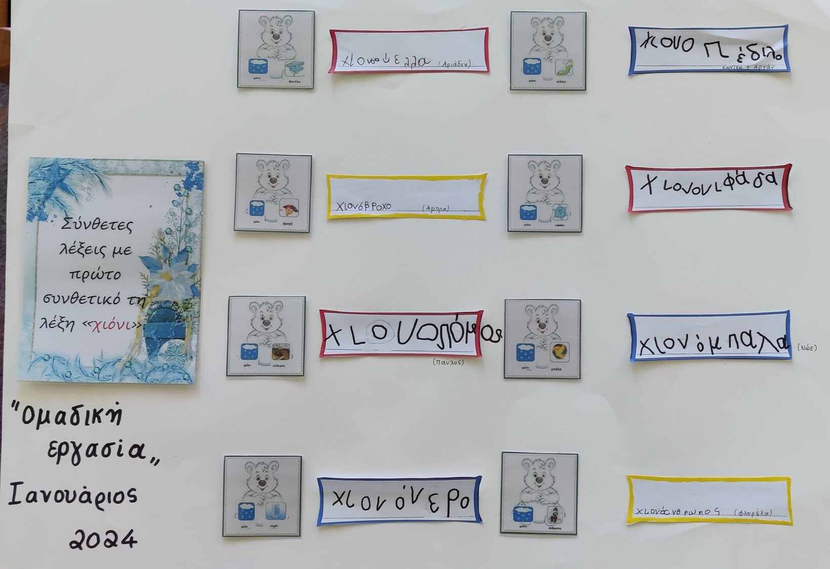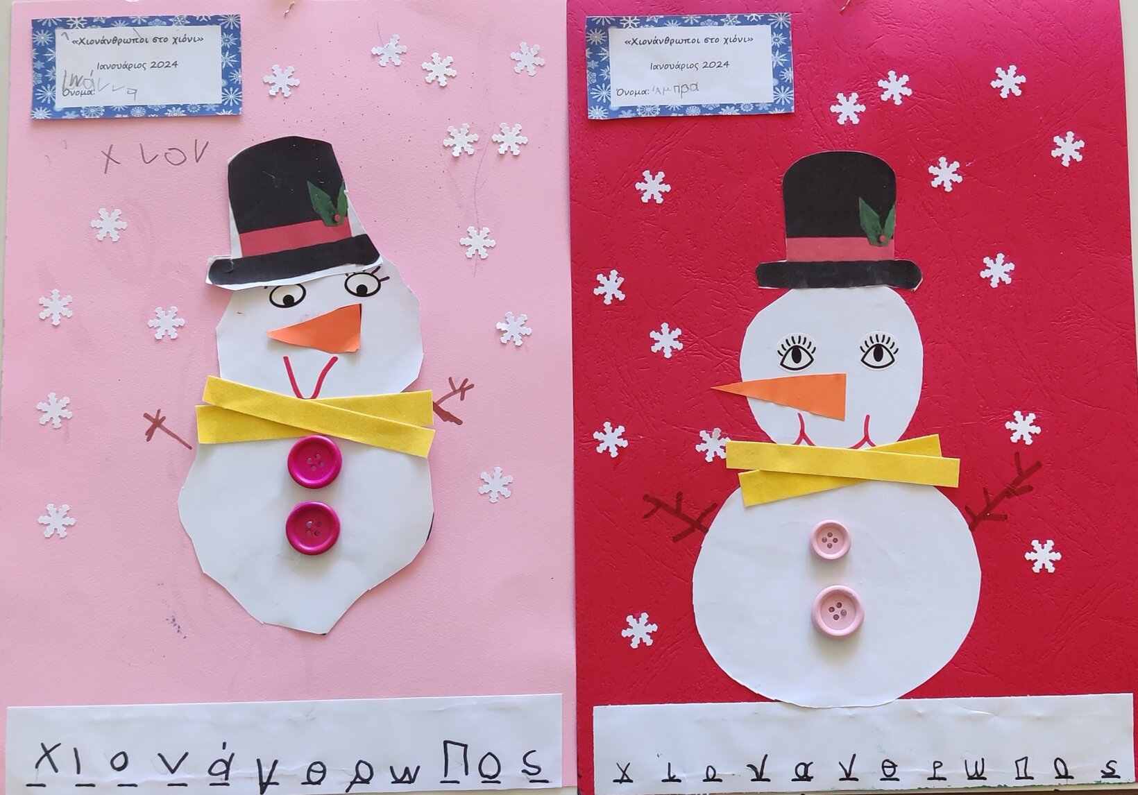 Κόψαμε λευκά χαρτιά και πολύχρωμαγια να σχηματίσουμε έναν χιονάνθρωπο,και τα αξεσουάρ του, γράψαμε και την ονομασία του και έτοιμο το χειμερινό μας καδράκι.Βρήκαμε σύνθετες λέξεις με πρώτο συνθετικό το “χιόνι”και τις γράψαμε στο χαρτόνι.Κάναμε το πείραμα “Τήξης – πήξης”, βάζοντας ένα ποτήρι με πάγο μέσα στην τάξη,ένα ποτήρι στο καλοριφέρκαι ένα έξω από την τάξη.Κάναμε τις υποθέσεις μας, τις καταγράψαμεκαι επαληθεύσαμε τις αρχικές μας προβλέψεις.Προετοιμάσαμε την κατασκευή μας για τη γιορτή των 3 Ιεραρχών.Κόψαμε και ζωγραφίσαμε τον ναόβάλαμε χρυσόσκονη στους σταυρούς και στα φωτοστέφανα των 3 Ιεραρχώνκαι τους τοποθετήσαμε μέσα μαζί με ένα ποιηματάκι.Μάθαμε τον αριθμό 8, συμπληρώσαμε το φύλλο εργασίαςκαι κάναμε τυπώματα με σφουγγάρικαι λευκή μπογιά για να σχηματίσουμε το 8.Το σχηματίσαμε με στεφάνια.