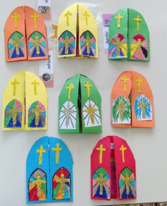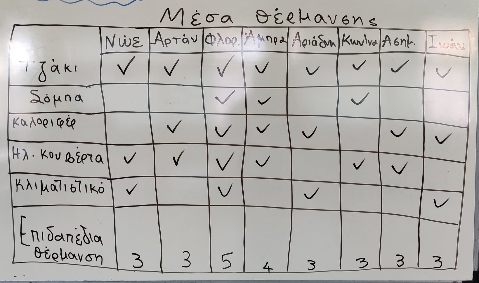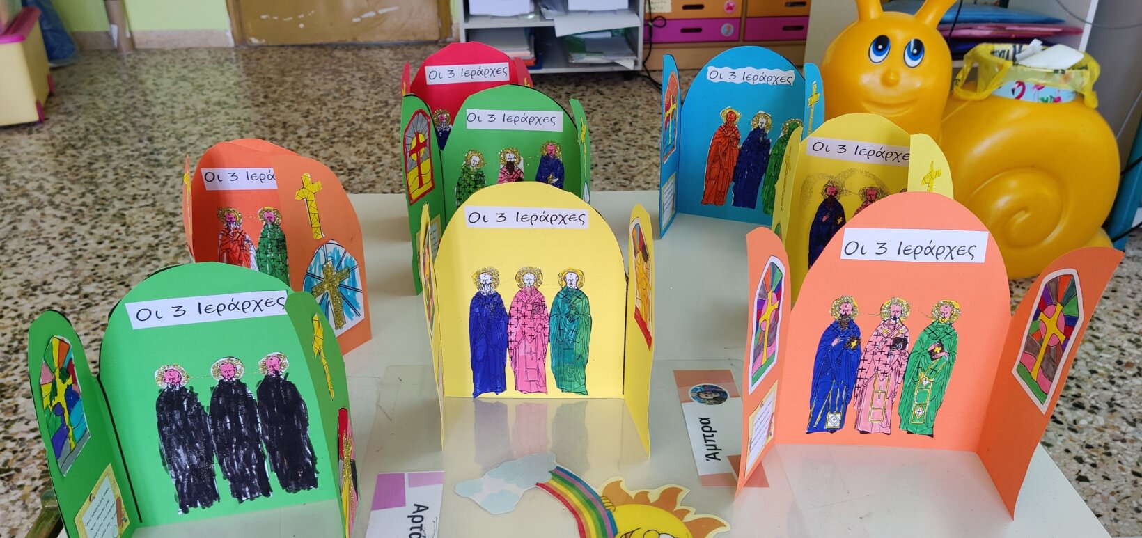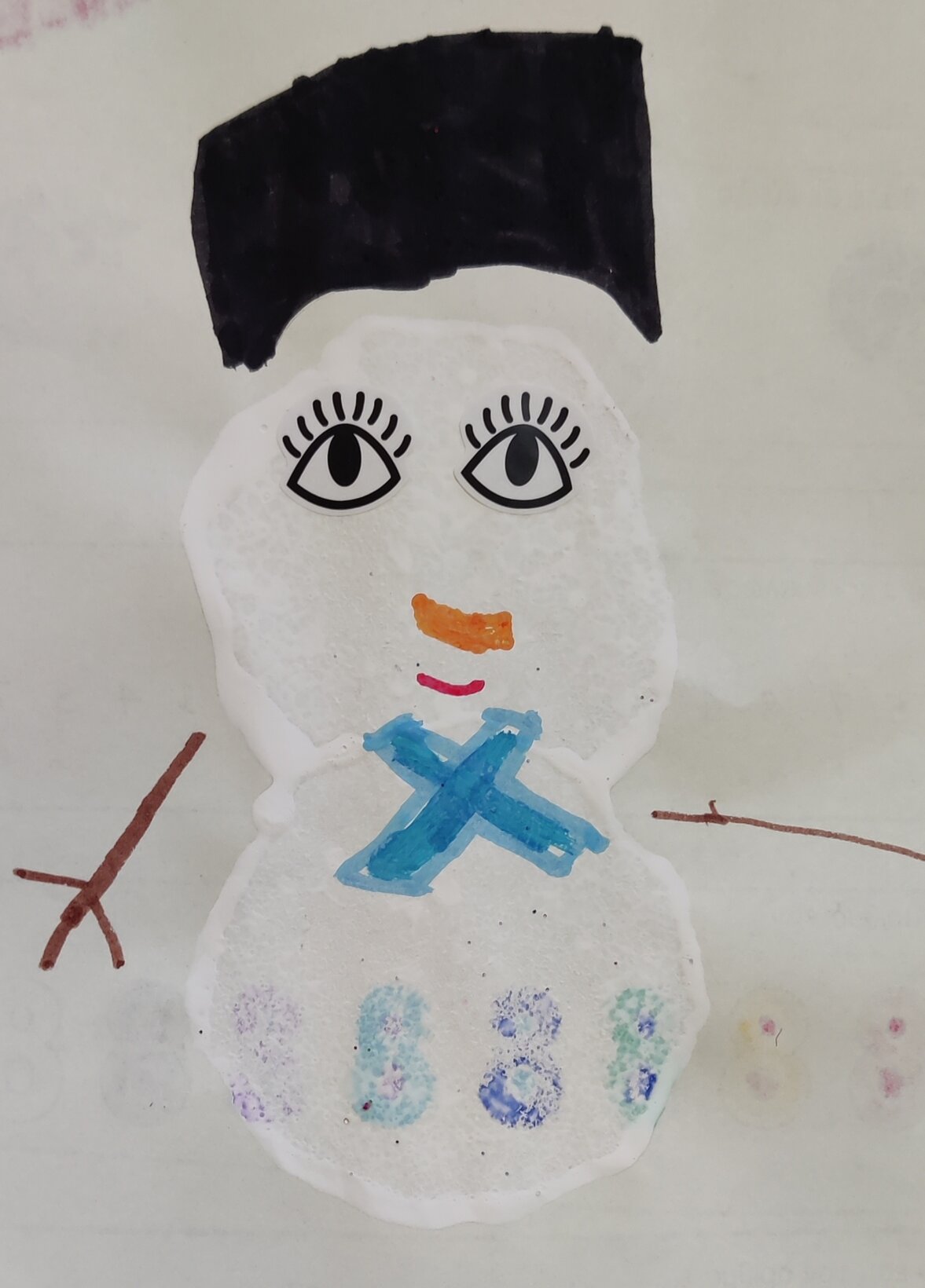 Κόψαμε λευκά χαρτιά και πολύχρωμαγια να σχηματίσουμε έναν χιονάνθρωπο,και τα αξεσουάρ του, γράψαμε και την ονομασία του και έτοιμο το χειμερινό μας καδράκι.Βρήκαμε σύνθετες λέξεις με πρώτο συνθετικό το “χιόνι”και τις γράψαμε στο χαρτόνι.Κάναμε το πείραμα “Τήξης – πήξης”, βάζοντας ένα ποτήρι με πάγο μέσα στην τάξη,ένα ποτήρι στο καλοριφέρκαι ένα έξω από την τάξη.Κάναμε τις υποθέσεις μας, τις καταγράψαμεκαι επαληθεύσαμε τις αρχικές μας προβλέψεις.Προετοιμάσαμε την κατασκευή μας για τη γιορτή των 3 Ιεραρχών.Κόψαμε και ζωγραφίσαμε τον ναόβάλαμε χρυσόσκονη στους σταυρούς και στα φωτοστέφανα των 3 Ιεραρχώνκαι τους τοποθετήσαμε μέσα μαζί με ένα ποιηματάκι.Μάθαμε τον αριθμό 8, συμπληρώσαμε το φύλλο εργασίαςκαι κάναμε τυπώματα με σφουγγάρικαι λευκή μπογιά για να σχηματίσουμε το 8.Το σχηματίσαμε με στεφάνια.