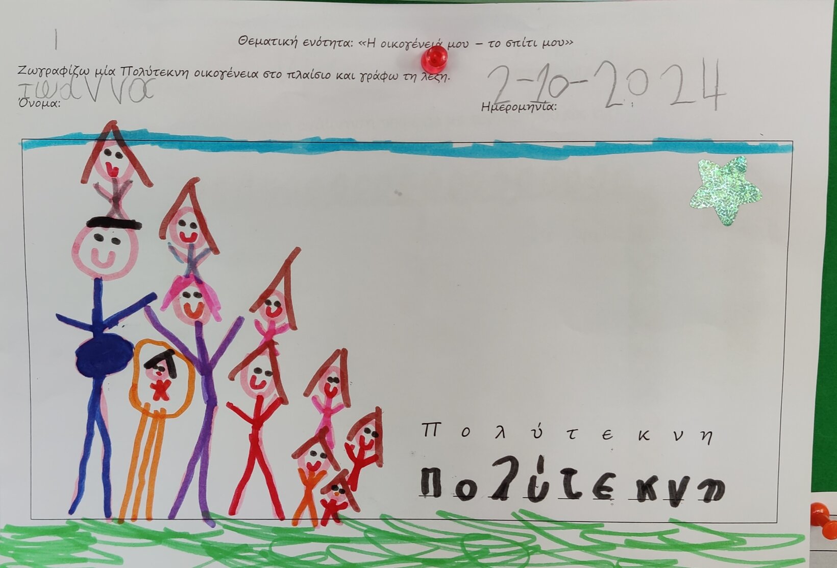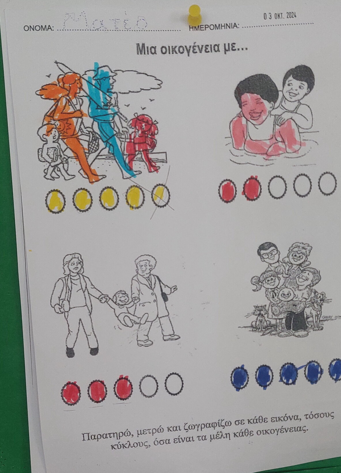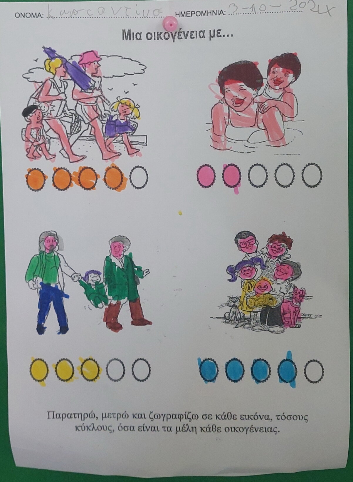 Μιλήσαμε για τα είδη των οικογενειών και αναφέραμε σε ποια κατηγορία ανήκει η οικογένεια του καθένα.Κατόπιν, ζωγραφίσαμε την πολύτεκνη,την πυρηνικήκαι την μονογονεϊκή.Μετρήσαμε τα μέλη της κάθε οικογένειαςκαι ζωγραφίσαμε τόσα μέλη, όσα απεικονίζονται και στην εικόνα.Διαβάσαμε την ιστορία “Η φαντασία του Οκτώβρη” από το βιβλίο της Λότης Πέτροβιτς “Τα παιδιά του Φθινοπώρου” και ζωγραφίσαμε το ανθρωπάκι του Οκτώβρη.