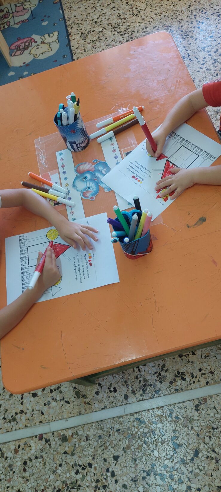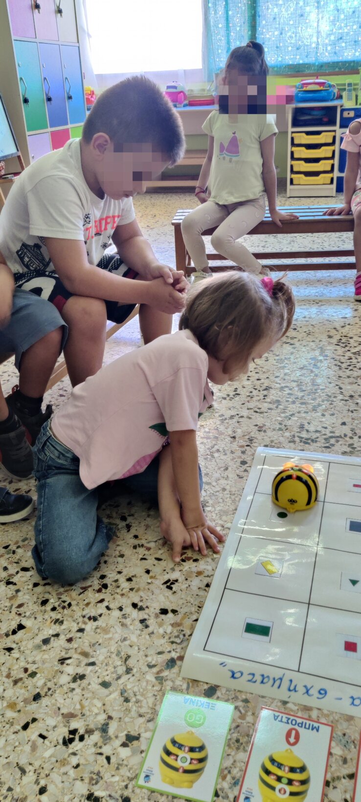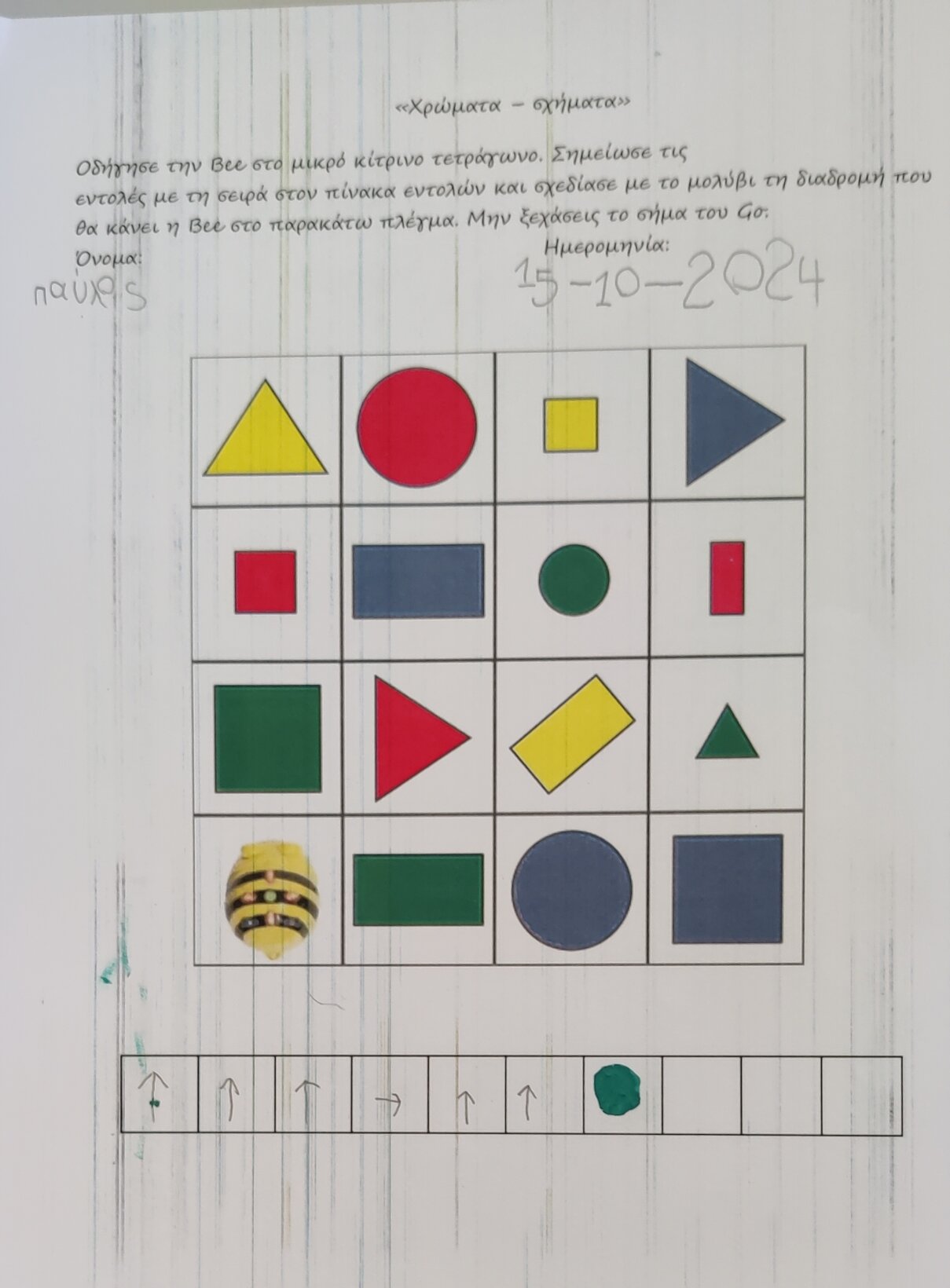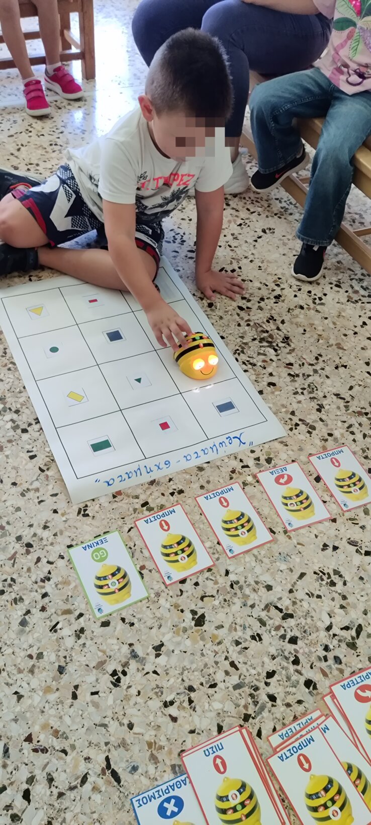 Αφού μάθαμε τον κύβο και τη σφαίρα απ’ τα στερεά, γεωμετρικά σχήματα, προσπαθήσαμενα φτιάξουμε τα μοτίβα που μας ζητήθηκαν.Συνεχίσαμε για εμπέδωσηκαι σε φύλλα εργασίας.Ζωγραφίσαμε ανάλογαοδηγίες που μας δόθηκαν.Βάλαμε ένα πιθανό σενάριο και ζητήσαμε απ’ τα παιδιά να σχεδιάσουν τις οδηγίες που θα δώσουμε στην Bee την μέλισσα προκειμένου να φτάσει στον στόχο.Κατόπιν, βρήκαμε τις κάρτες που θα μας δίνουν τις οδηγίεςκαι προγραμματίσαμε το ρομποτάκι μας για να φτάσει στο στόχο.Λύσαμε τα αινίγματα για τα σχήματα που μας τέθηκαν.Δημιουργήσαμε σε ψηφιακό παζλτο “Κάστρο και Ήλιος” του Πάουλ Κλέε.