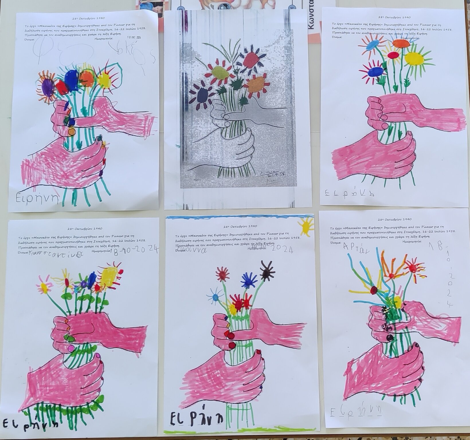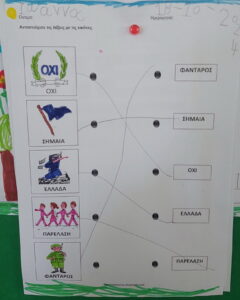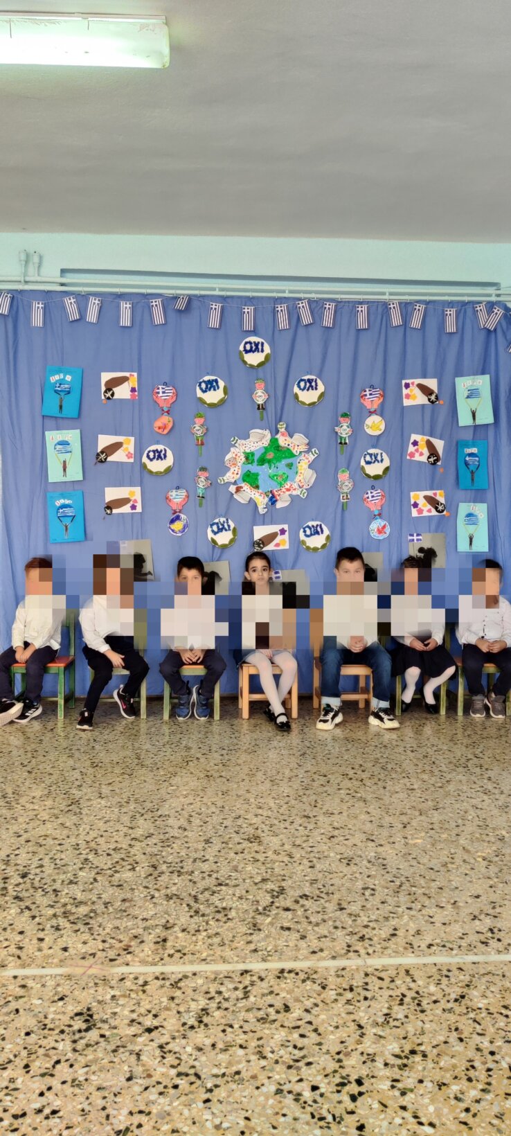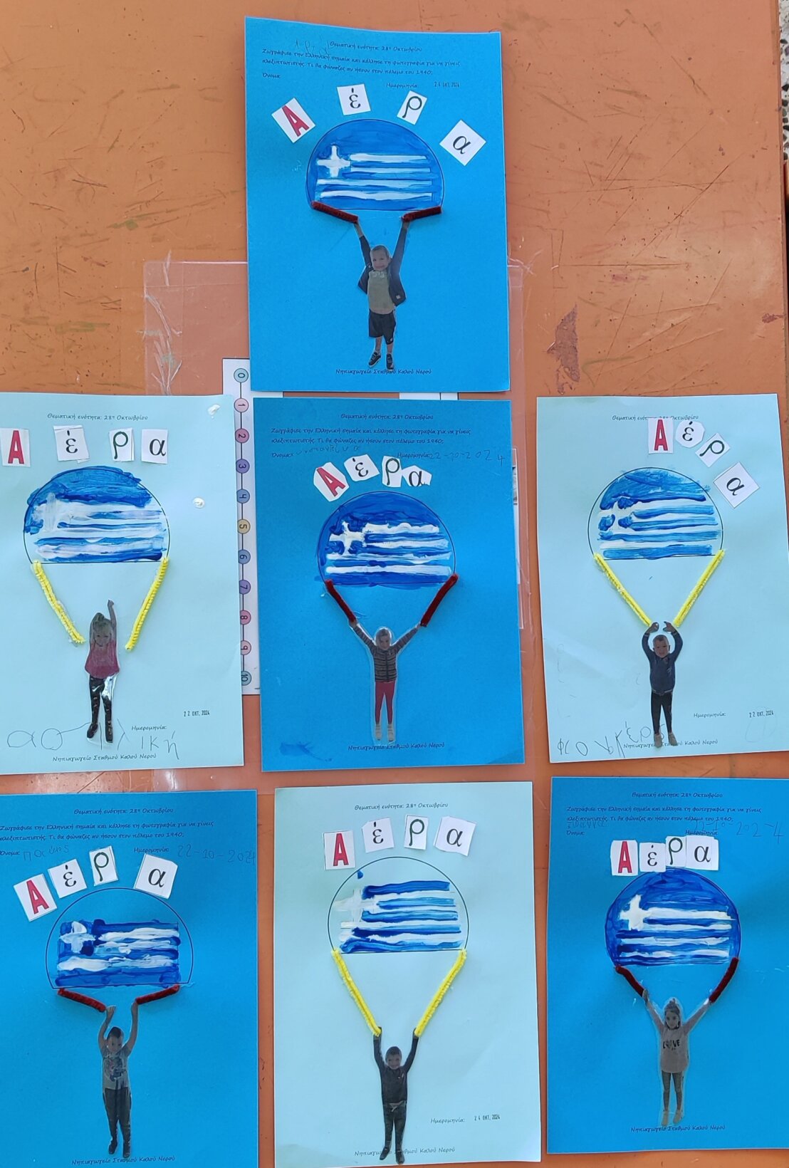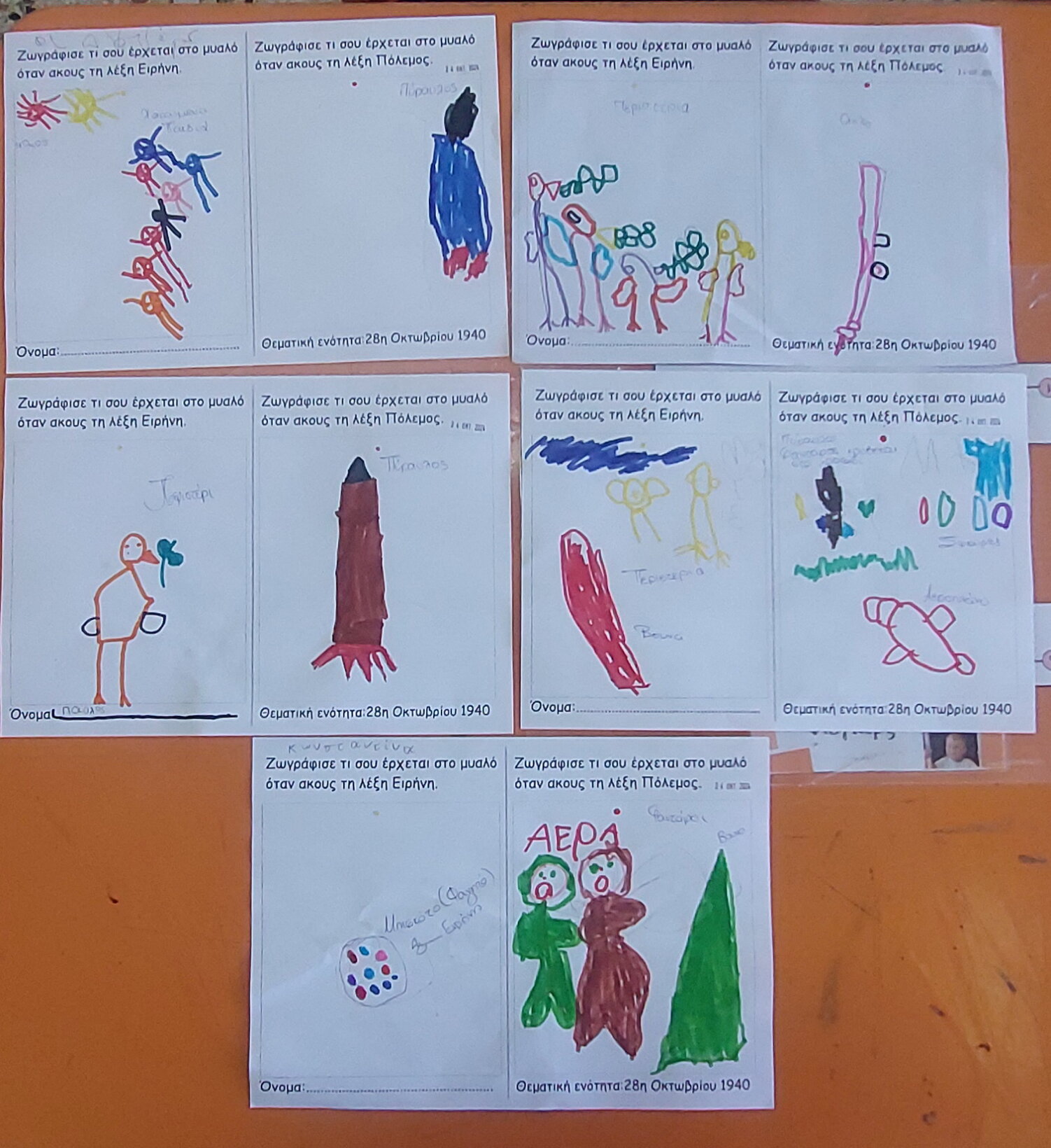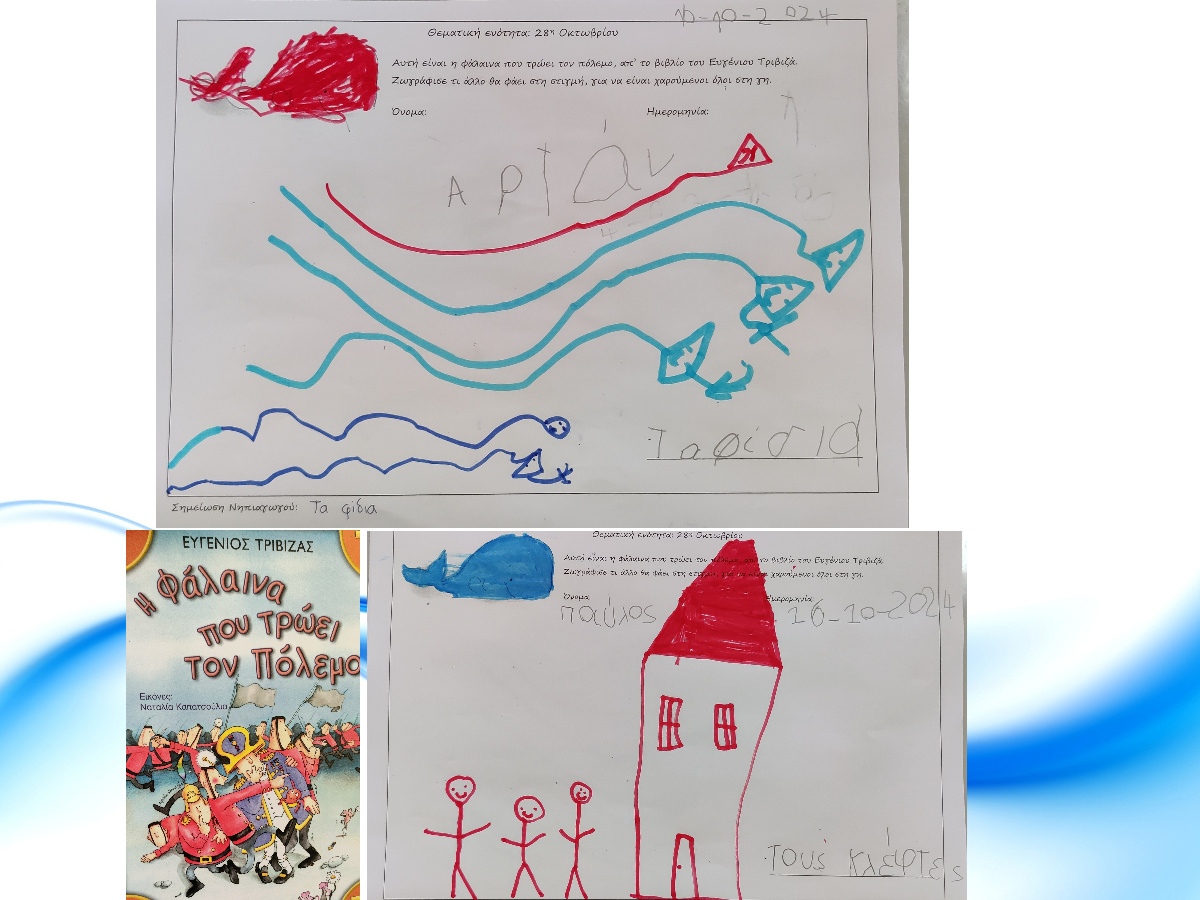Διαβάσαμε τη “Φάλαινα που μισούσε τον πόλεμο“, ζωγραφίσαμε τι θα θέλαμε να φάει η φάλαινα και τα νήπια το έγραψαν.Γράψαμε τα ονόματα των πρωταγωνιστών της ιστορίαςκαι κολλήσαμε φωτογραφίες της περιόδου εκείνης.Το αναρτήσαμε δίπλα στο εποπτικό υλικό μας.Γράψαμε τι είπαν περιφραστικά οι πρωθυπουργοί και οι φαντάροι μας στα βουνά.Μιλήσαμε για την Ελληνική σημαία: από ποια χρώματα αποτελείται, πόσες γραμμές έχει, ποιοι είναι οι συμβολισμοί.Την ζωγραφίσαμε με πινέλο και γίναμε μικροί αλεξιπτωτιστές.Σχηματίσαμε τη λέξη Αέρα και κολλήσαμε τις φωτογραφίες μας.Εντοπίσαμε τη λέξη και προσπαθήσαμε να την γράψουμε και εμείς.Κάναμε παρέλαση στο προαύλιο, μεταφέροντάς τη με τα χέρια μας.Την συγκρίναμε με άλλες σημαίες του κόσμου.Σε καθεμία από αυτές, αντιστοιχήσαμε τα χρώματά της.Αφού το σχολείο μας συμμετέχει στην Code week,ακολουθήσαμε τον κώδικα που μας δόθηκε και καταφέραμε να τον “σπάσουμε” και να αποκαλύψουμε την Ελληνική σημαία.Όλοι οι μαθητές μας πήραν πιστοποιητικό συμμετοχής για την προσπάθειά τους σε αυτό τον ευρωπαϊκό διαγωνισμό, καθώς και η εκπαιδευτικός που έλαβε μέρος στην δράση.Μιλήσαμε για την Ειρήνη και ζωγραφίσαμε τη Γη μας.Με δαχτυλομπογιές επιμεληθήκαμε τα περιστέρια της Ειρήνης και συνθέσαμε την ομαδική μας κατασκευή.Ευχηθήκαμε να έχει όλη η Γη πάντα Ειρήνη.Παρατηρήσαμε τον πίνακα ζωγραφικής του Πικάσο “Τα λουλούδια της Ειρήνης”και προσπαθήσαμε να τον αναδημιουργήσουμε.Αφού ολοκληρώσαμε τις ατομικές μας εργασίες,αναδημιουργήσαμε τον πίνακα και σε ομαδική εργασία,για να κοσμήσουμε τον τοίχο της τέχνης.Ζωγραφίσαμε την Ειρήνη.Ζωγραφίσαμε τους Έλληνες φαντάρουςνα κρατούν το “Όχι”.Μιλήσαμε για τα συσσίτια, τη φτώχεια, την ανέχεια και για λίγο μπήκαμε στη θέση όσων έζησαν εκείνη την εποχή.Πώς άραγε θα ένιωθαν τα παιδιά που δεν είχαν να φάνε; Τους έλειπε μόνο το φαγητό;Και όταν επέστρεφαν οι φαντάροι απ’ τον πόλεμο, πώς αισθάνονταν;Παρακολουθήσαμε ένα βίντεο με τις συνθήκες διαβίωσης στον πόλεμο.Ζωγραφίσαμε με πινέλο τα χρώματα της Ελληνικής σημαίαςκόψαμε και ζωγραφίσαμε φανταράκιακαι δημιουργήσαμε μία ατομική κατασκευή.Ζωγραφίσαμε τον στρατιώτη στο μέτωπομαζί με την πρώτη Ελληνική σημαία ξηράς της Ελλάδας.Φτιάξαμε μπαλίτσες από γκοφρέ χαρτί καιτις χρησιμοποιήσαμε ως ψηφίδες για να συνθέσουμε το “Όχι”.Αντιστοιχήσαμε λέξεις με εικόνεςσχετικές με τη γιορτή.κυκλώσαμε και ζωγραφίσαμε μόνο τις εικόνες που σχετίζονται με τη γιορτή της 28ης Οκτωβρίου.και εντοπίσαμε που υπάρχει η λέξη “Ελλάδα”. Κατόπιν την γράψαμε στο κατάλληλο πλαίσιο.1Κόψαμε και κολλήσαμετο κανόνι της Ειρήνης.Κατόπιν, το παίξαμε και σε κουκλοθέατρο και μας ενθουσίασε.Ζωγραφίσαμε δύο χέρια, την Ελληνική σημαία και το περιστέρι της Ειρήνης.Τα συνθέσαμε και δημιουργήσαμε μία ατομική κατασκευήΚολλήσαμε τις κατασκευές μας και δημιουργήσαμε το σκηνικό για τη γιορτή μας.Σε μία κλειστού τύπου γιορτή, απαγγείλαμε τα ποιήματά μας, τραγουδήσαμε και απαγγείλαμε τον Εθνικό μας ύμνο.Εκκλησιαστήκαμε, κάναμε παρέλαση και καταθέσαμε στεφάνι στη μνήμη των πεσόντων.