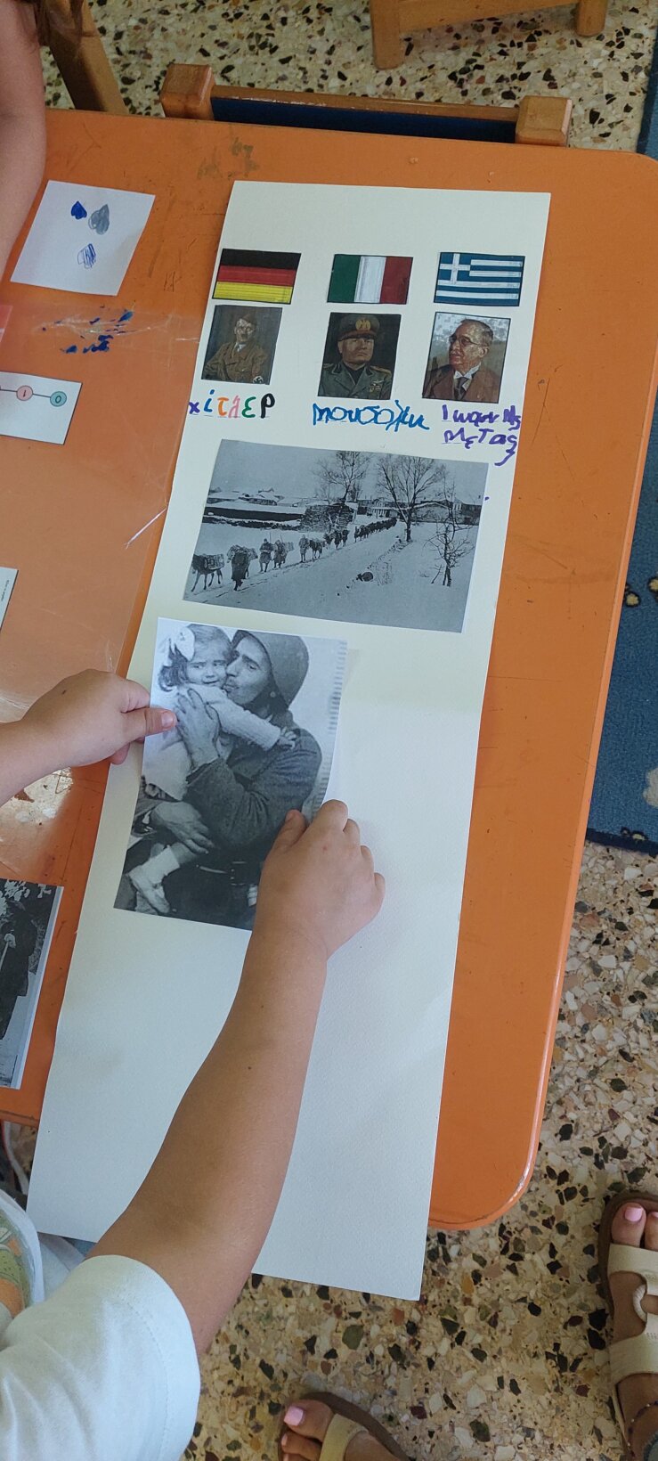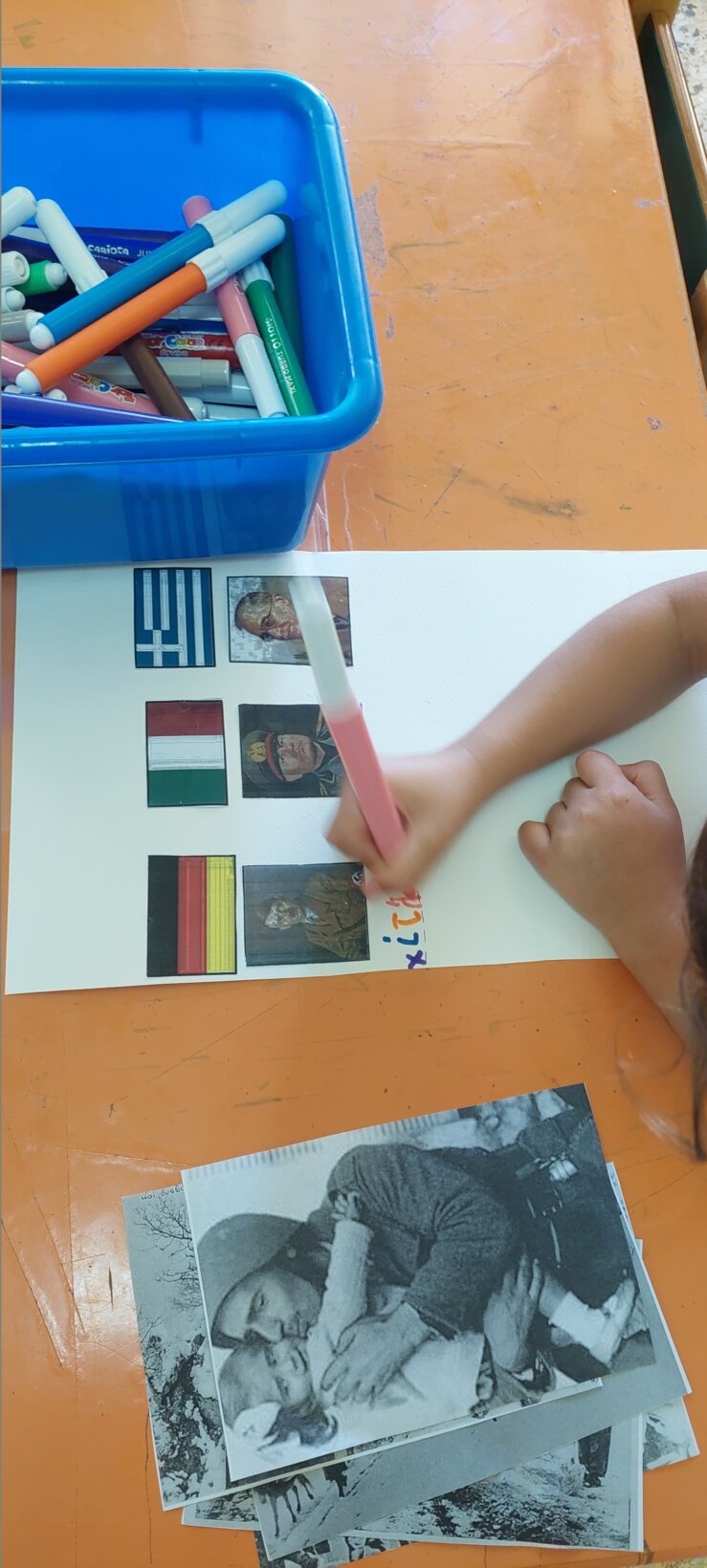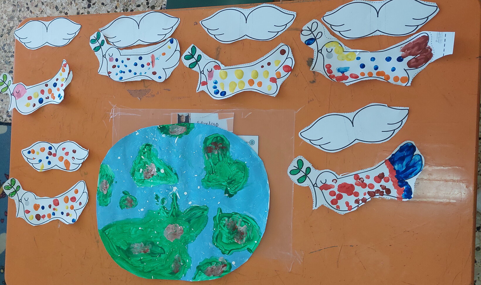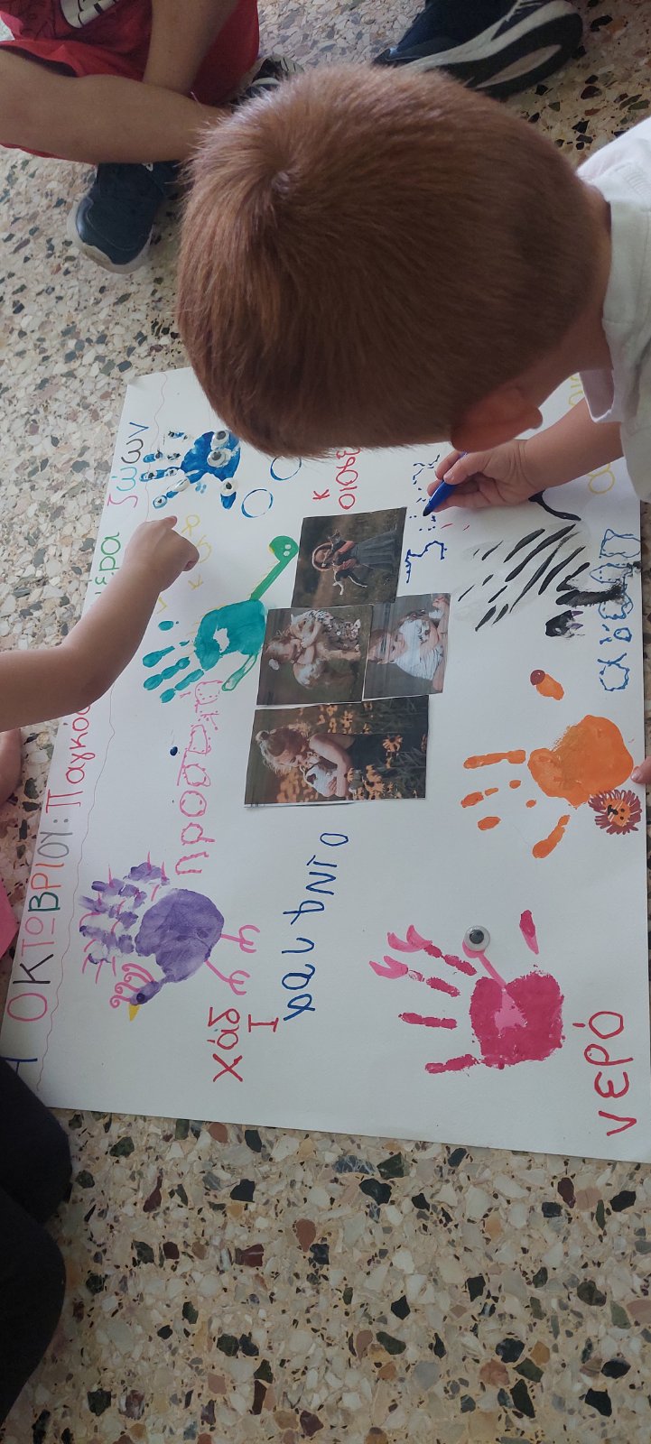 Διαβάσαμε τη “Φάλαινα που μισούσε τον πόλεμο“, ζωγραφίσαμε τι θα θέλαμε να φάει η φάλαινα και τα νήπια το έγραψαν.Γράψαμε τα ονόματα των πρωταγωνιστών της ιστορίαςκαι κολλήσαμε φωτογραφίες της περιόδου εκείνης.Το αναρτήσαμε δίπλα στο εποπτικό υλικό μας.Γράψαμε τι είπαν περιφραστικά οι πρωθυπουργοί και οι φαντάροι μας στα βουνά.Μιλήσαμε για την Ελληνική σημαία: από ποια χρώματα αποτελείται, πόσες γραμμές έχει, ποιοι είναι οι συμβολισμοί.Την ζωγραφίσαμε με πινέλο και γίναμε μικροί αλεξιπτωτιστές.Σχηματίσαμε τη λέξη Αέρα και κολλήσαμε τις φωτογραφίες μας.Εντοπίσαμε τη λέξη και προσπαθήσαμε να την γράψουμε και εμείς.Κάναμε παρέλαση στο προαύλιο, μεταφέροντάς τη με τα χέρια μας.Την συγκρίναμε με άλλες σημαίες του κόσμου.Σε καθεμία από αυτές, αντιστοιχήσαμε τα χρώματά της.Αφού το σχολείο μας συμμετέχει στην Code week,ακολουθήσαμε τον κώδικα που μας δόθηκε και καταφέραμε να τον “σπάσουμε” και να αποκαλύψουμε την Ελληνική σημαία.Όλοι οι μαθητές μας πήραν πιστοποιητικό συμμετοχής για την προσπάθειά τους σε αυτό τον ευρωπαϊκό διαγωνισμό, καθώς και η εκπαιδευτικός που έλαβε μέρος στην δράση.Μιλήσαμε για την Ειρήνη και ζωγραφίσαμε τη Γη μας.Με δαχτυλομπογιές επιμεληθήκαμε τα περιστέρια της Ειρήνης και συνθέσαμε την ομαδική μας κατασκευή.Ευχηθήκαμε να έχει όλη η Γη πάντα Ειρήνη.Παρατηρήσαμε τον πίνακα ζωγραφικής του Πικάσο “Τα λουλούδια της Ειρήνης”και προσπαθήσαμε να τον αναδημιουργήσουμε.Αφού ολοκληρώσαμε τις ατομικές μας εργασίες,αναδημιουργήσαμε τον πίνακα και σε ομαδική εργασία,για να κοσμήσουμε τον τοίχο της τέχνης.Ζωγραφίσαμε την Ειρήνη.Ζωγραφίσαμε τους Έλληνες φαντάρουςνα κρατούν το “Όχι”.Μιλήσαμε για τα συσσίτια, τη φτώχεια, την ανέχεια και για λίγο μπήκαμε στη θέση όσων έζησαν εκείνη την εποχή.Πώς άραγε θα ένιωθαν τα παιδιά που δεν είχαν να φάνε; Τους έλειπε μόνο το φαγητό;Και όταν επέστρεφαν οι φαντάροι απ’ τον πόλεμο, πώς αισθάνονταν;Παρακολουθήσαμε ένα βίντεο με τις συνθήκες διαβίωσης στον πόλεμο.Ζωγραφίσαμε με πινέλο τα χρώματα της Ελληνικής σημαίαςκόψαμε και ζωγραφίσαμε φανταράκιακαι δημιουργήσαμε μία ατομική κατασκευή.Ζωγραφίσαμε τον στρατιώτη στο μέτωπομαζί με την πρώτη Ελληνική σημαία ξηράς της Ελλάδας.Φτιάξαμε μπαλίτσες από γκοφρέ χαρτί καιτις χρησιμοποιήσαμε ως ψηφίδες για να συνθέσουμε το “Όχι”.Αντιστοιχήσαμε λέξεις με εικόνεςσχετικές με τη γιορτή.κυκλώσαμε και ζωγραφίσαμε μόνο τις εικόνες που σχετίζονται με τη γιορτή της 28ης Οκτωβρίου.και εντοπίσαμε που υπάρχει η λέξη “Ελλάδα”. Κατόπιν την γράψαμε στο κατάλληλο πλαίσιο.1Κόψαμε και κολλήσαμετο κανόνι της Ειρήνης.Κατόπιν, το παίξαμε και σε κουκλοθέατρο και μας ενθουσίασε.Ζωγραφίσαμε δύο χέρια, την Ελληνική σημαία και το περιστέρι της Ειρήνης.Τα συνθέσαμε και δημιουργήσαμε μία ατομική κατασκευήΚολλήσαμε τις κατασκευές μας και δημιουργήσαμε το σκηνικό για τη γιορτή μας.Σε μία κλειστού τύπου γιορτή, απαγγείλαμε τα ποιήματά μας, τραγουδήσαμε και απαγγείλαμε τον Εθνικό μας ύμνο.Εκκλησιαστήκαμε, κάναμε παρέλαση και καταθέσαμε στεφάνι στη μνήμη των πεσόντων.