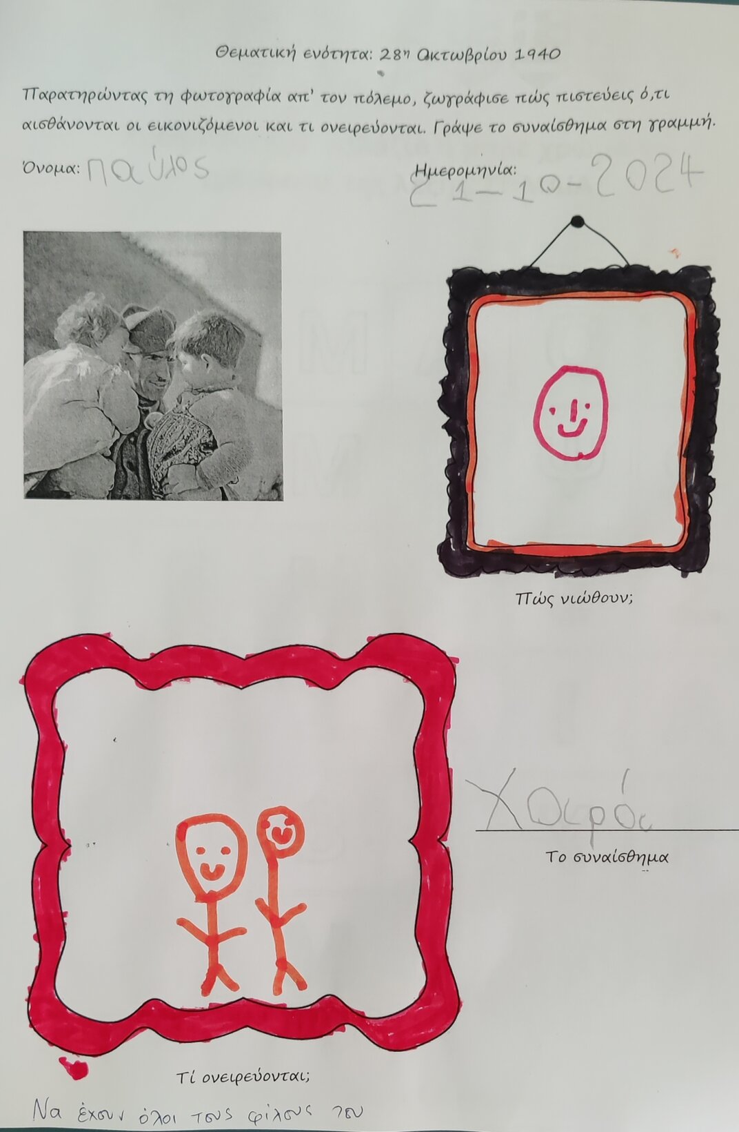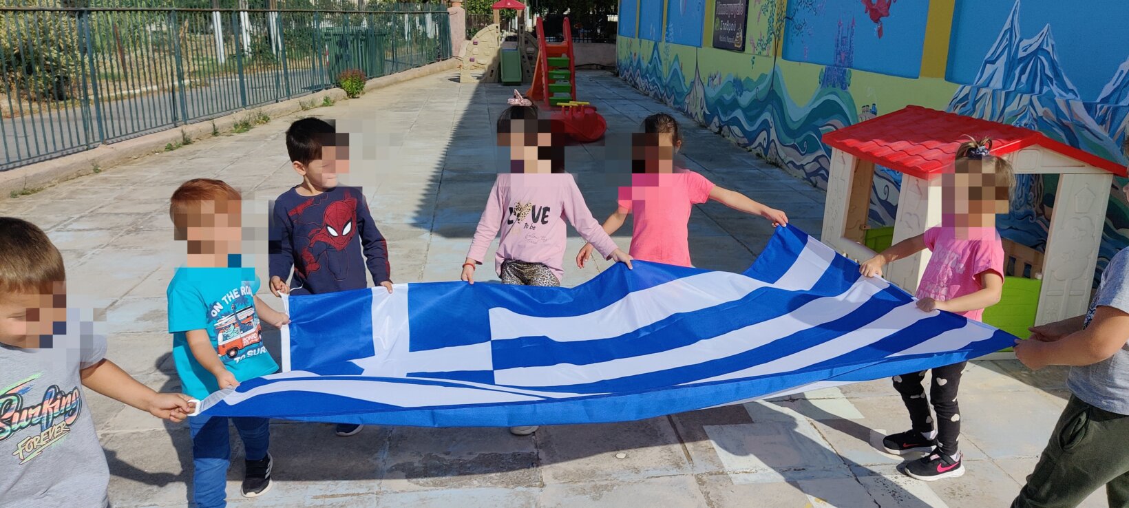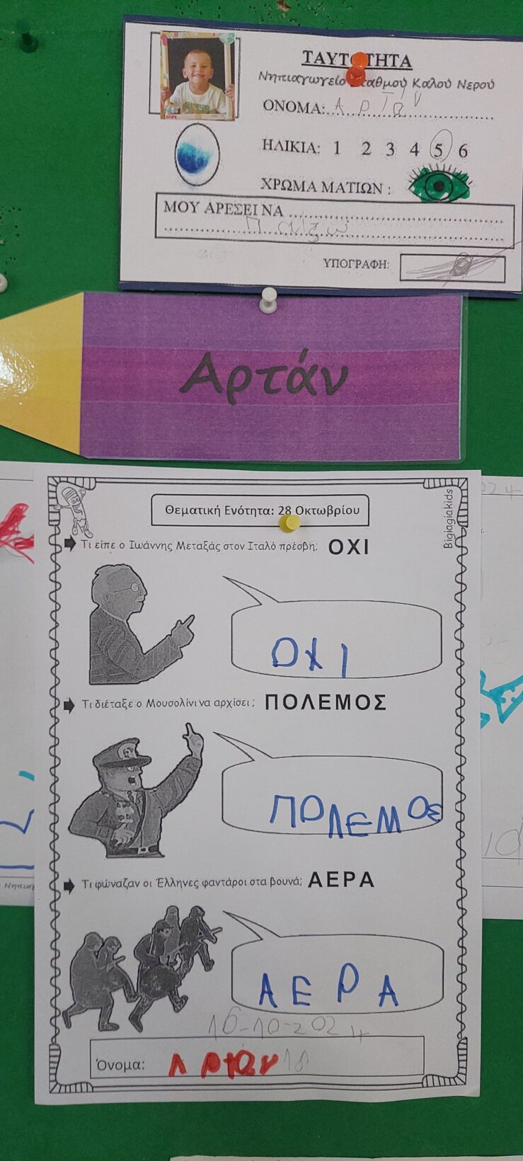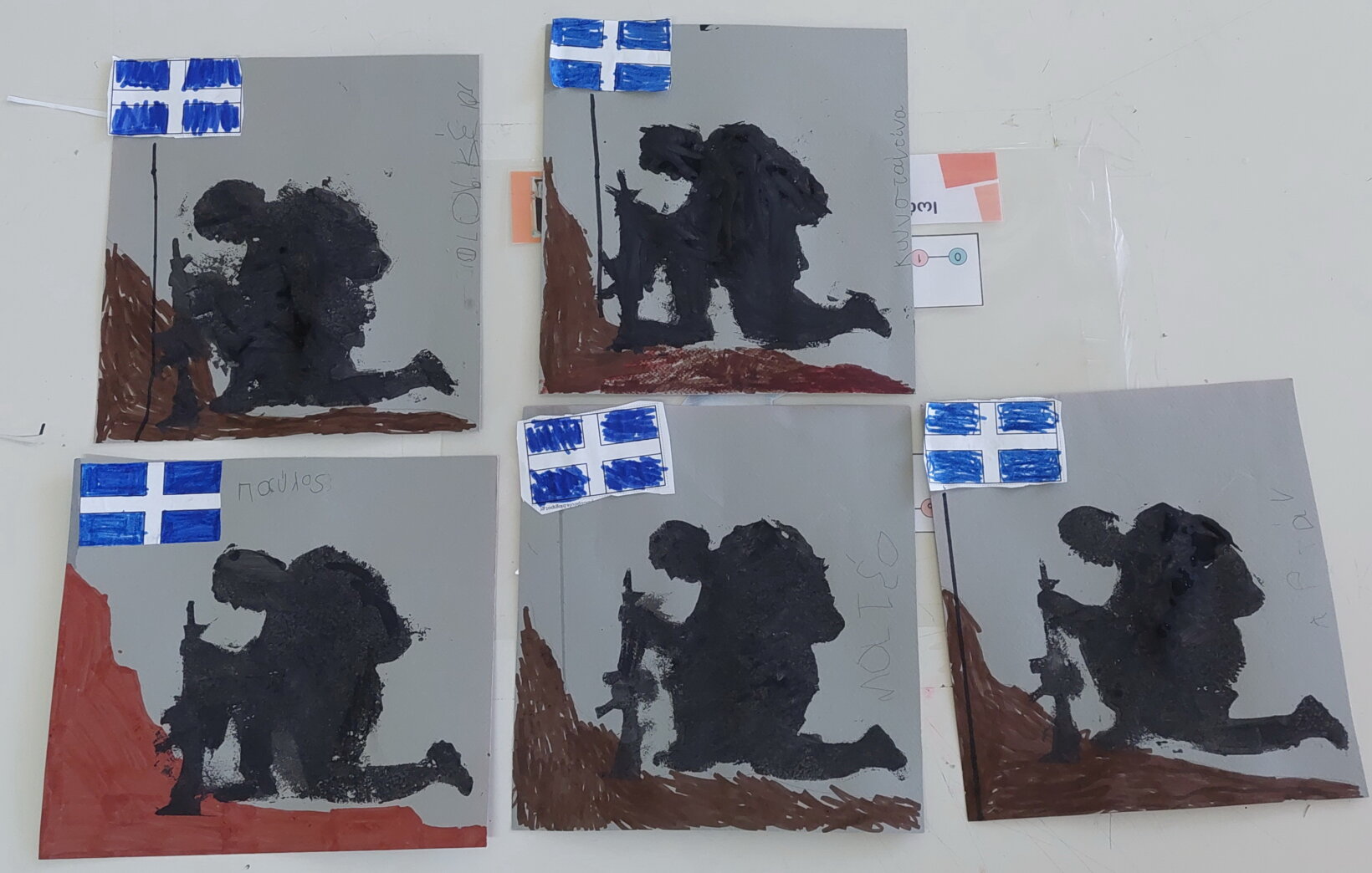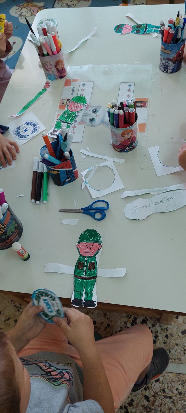 Διαβάσαμε τη “Φάλαινα που μισούσε τον πόλεμο“, ζωγραφίσαμε τι θα θέλαμε να φάει η φάλαινα και τα νήπια το έγραψαν.Γράψαμε τα ονόματα των πρωταγωνιστών της ιστορίαςκαι κολλήσαμε φωτογραφίες της περιόδου εκείνης.Το αναρτήσαμε δίπλα στο εποπτικό υλικό μας.Γράψαμε τι είπαν περιφραστικά οι πρωθυπουργοί και οι φαντάροι μας στα βουνά.Μιλήσαμε για την Ελληνική σημαία: από ποια χρώματα αποτελείται, πόσες γραμμές έχει, ποιοι είναι οι συμβολισμοί.Την ζωγραφίσαμε με πινέλο και γίναμε μικροί αλεξιπτωτιστές.Σχηματίσαμε τη λέξη Αέρα και κολλήσαμε τις φωτογραφίες μας.Εντοπίσαμε τη λέξη και προσπαθήσαμε να την γράψουμε και εμείς.Κάναμε παρέλαση στο προαύλιο, μεταφέροντάς τη με τα χέρια μας.Την συγκρίναμε με άλλες σημαίες του κόσμου.Σε καθεμία από αυτές, αντιστοιχήσαμε τα χρώματά της.Αφού το σχολείο μας συμμετέχει στην Code week,ακολουθήσαμε τον κώδικα που μας δόθηκε και καταφέραμε να τον “σπάσουμε” και να αποκαλύψουμε την Ελληνική σημαία.Όλοι οι μαθητές μας πήραν πιστοποιητικό συμμετοχής για την προσπάθειά τους σε αυτό τον ευρωπαϊκό διαγωνισμό, καθώς και η εκπαιδευτικός που έλαβε μέρος στην δράση.Μιλήσαμε για την Ειρήνη και ζωγραφίσαμε τη Γη μας.Με δαχτυλομπογιές επιμεληθήκαμε τα περιστέρια της Ειρήνης και συνθέσαμε την ομαδική μας κατασκευή.Ευχηθήκαμε να έχει όλη η Γη πάντα Ειρήνη.Παρατηρήσαμε τον πίνακα ζωγραφικής του Πικάσο “Τα λουλούδια της Ειρήνης”και προσπαθήσαμε να τον αναδημιουργήσουμε.Αφού ολοκληρώσαμε τις ατομικές μας εργασίες,αναδημιουργήσαμε τον πίνακα και σε ομαδική εργασία,για να κοσμήσουμε τον τοίχο της τέχνης.Ζωγραφίσαμε την Ειρήνη.Ζωγραφίσαμε τους Έλληνες φαντάρουςνα κρατούν το “Όχι”.Μιλήσαμε για τα συσσίτια, τη φτώχεια, την ανέχεια και για λίγο μπήκαμε στη θέση όσων έζησαν εκείνη την εποχή.Πώς άραγε θα ένιωθαν τα παιδιά που δεν είχαν να φάνε; Τους έλειπε μόνο το φαγητό;Και όταν επέστρεφαν οι φαντάροι απ’ τον πόλεμο, πώς αισθάνονταν;Παρακολουθήσαμε ένα βίντεο με τις συνθήκες διαβίωσης στον πόλεμο.Ζωγραφίσαμε με πινέλο τα χρώματα της Ελληνικής σημαίαςκόψαμε και ζωγραφίσαμε φανταράκιακαι δημιουργήσαμε μία ατομική κατασκευή.Ζωγραφίσαμε τον στρατιώτη στο μέτωπομαζί με την πρώτη Ελληνική σημαία ξηράς της Ελλάδας.Φτιάξαμε μπαλίτσες από γκοφρέ χαρτί καιτις χρησιμοποιήσαμε ως ψηφίδες για να συνθέσουμε το “Όχι”.Αντιστοιχήσαμε λέξεις με εικόνεςσχετικές με τη γιορτή.κυκλώσαμε και ζωγραφίσαμε μόνο τις εικόνες που σχετίζονται με τη γιορτή της 28ης Οκτωβρίου.και εντοπίσαμε που υπάρχει η λέξη “Ελλάδα”. Κατόπιν την γράψαμε στο κατάλληλο πλαίσιο.1Κόψαμε και κολλήσαμετο κανόνι της Ειρήνης.Κατόπιν, το παίξαμε και σε κουκλοθέατρο και μας ενθουσίασε.Ζωγραφίσαμε δύο χέρια, την Ελληνική σημαία και το περιστέρι της Ειρήνης.Τα συνθέσαμε και δημιουργήσαμε μία ατομική κατασκευήΚολλήσαμε τις κατασκευές μας και δημιουργήσαμε το σκηνικό για τη γιορτή μας.Σε μία κλειστού τύπου γιορτή, απαγγείλαμε τα ποιήματά μας, τραγουδήσαμε και απαγγείλαμε τον Εθνικό μας ύμνο.Εκκλησιαστήκαμε, κάναμε παρέλαση και καταθέσαμε στεφάνι στη μνήμη των πεσόντων.