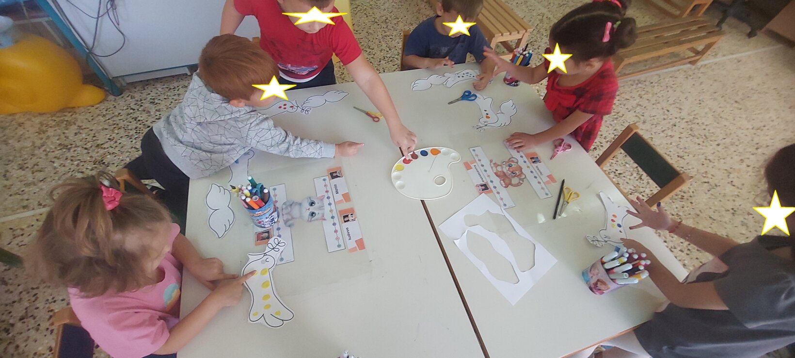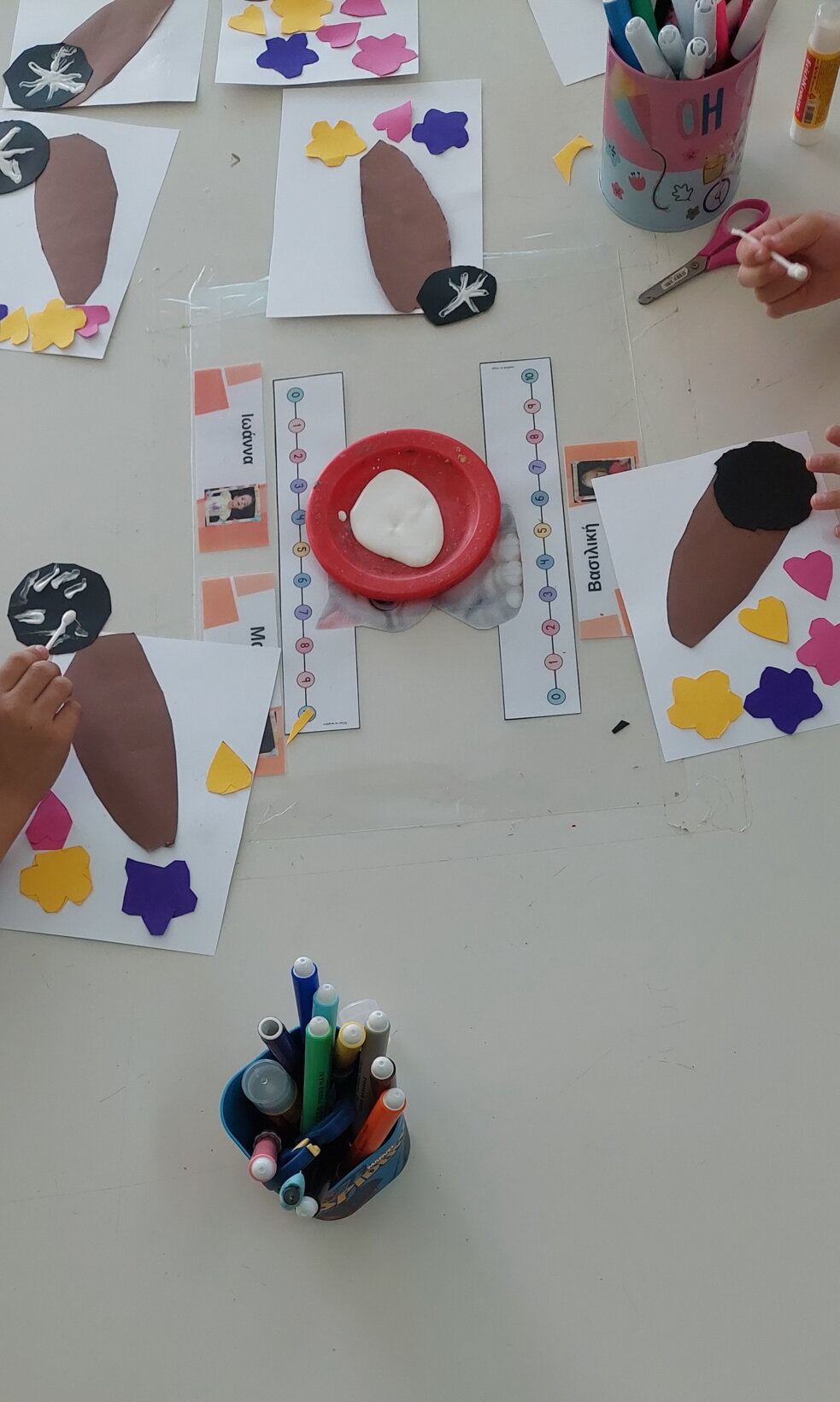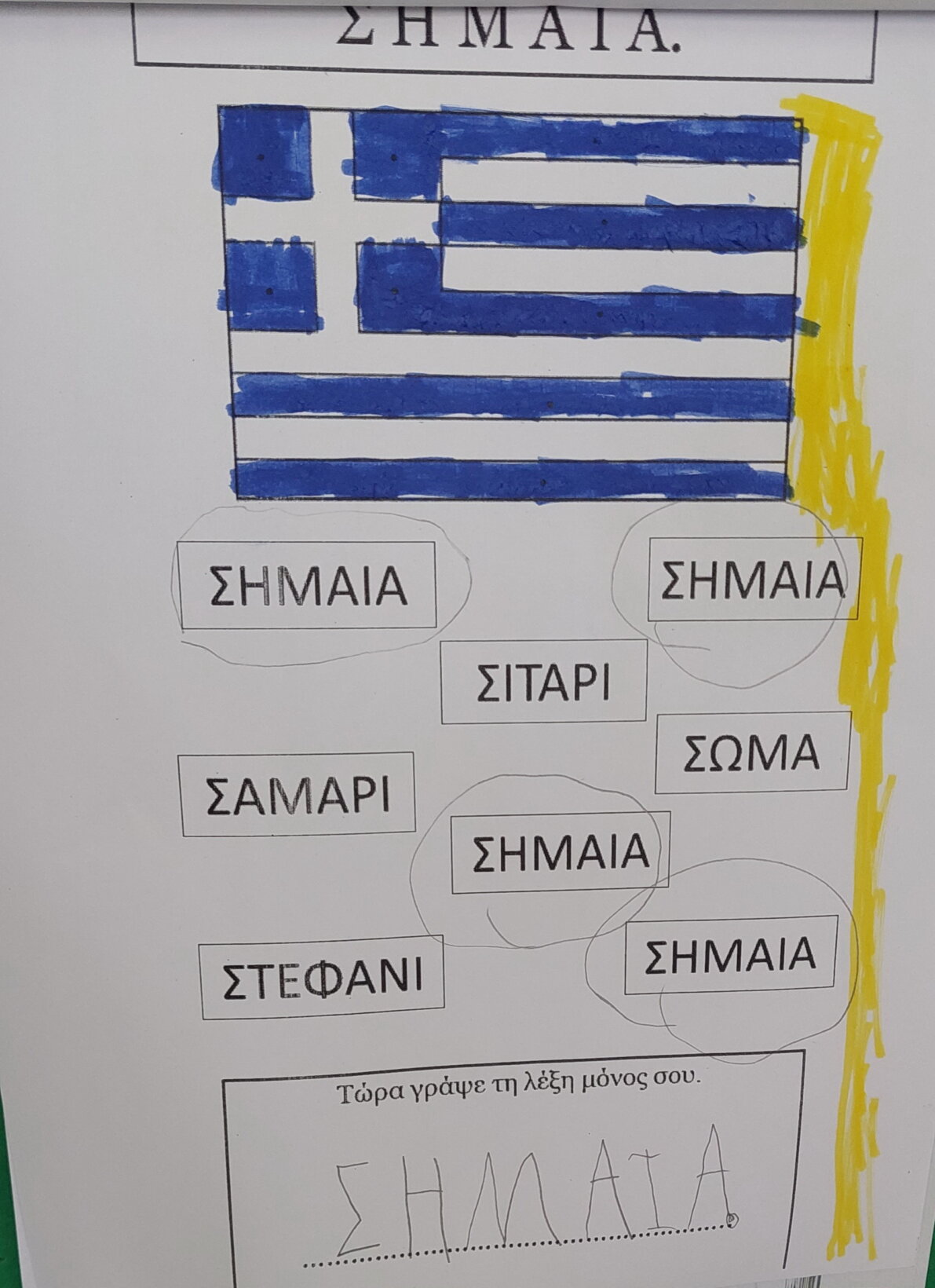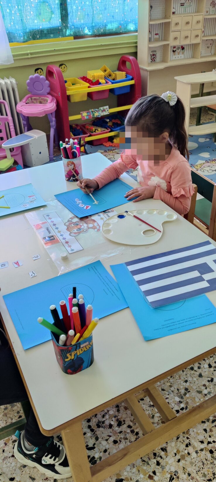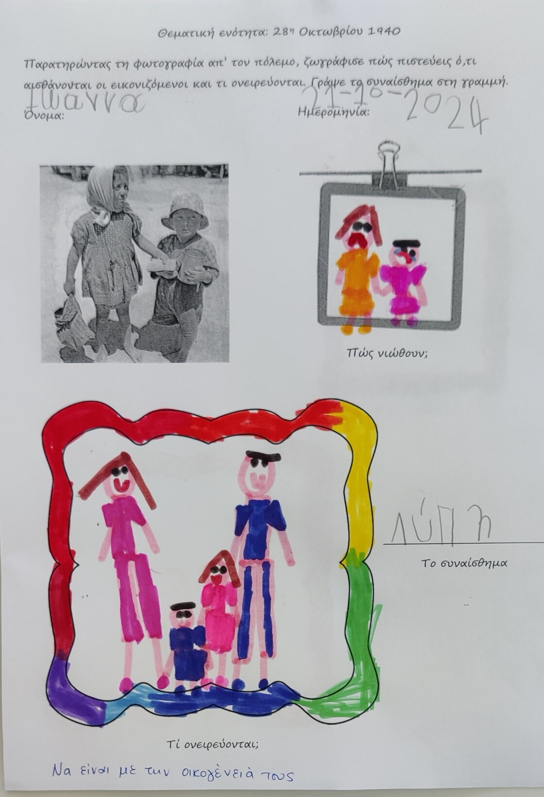 Διαβάσαμε τη “Φάλαινα που μισούσε τον πόλεμο“, ζωγραφίσαμε τι θα θέλαμε να φάει η φάλαινα και τα νήπια το έγραψαν.Γράψαμε τα ονόματα των πρωταγωνιστών της ιστορίαςκαι κολλήσαμε φωτογραφίες της περιόδου εκείνης.Το αναρτήσαμε δίπλα στο εποπτικό υλικό μας.Γράψαμε τι είπαν περιφραστικά οι πρωθυπουργοί και οι φαντάροι μας στα βουνά.Μιλήσαμε για την Ελληνική σημαία: από ποια χρώματα αποτελείται, πόσες γραμμές έχει, ποιοι είναι οι συμβολισμοί.Την ζωγραφίσαμε με πινέλο και γίναμε μικροί αλεξιπτωτιστές.Σχηματίσαμε τη λέξη Αέρα και κολλήσαμε τις φωτογραφίες μας.Εντοπίσαμε τη λέξη και προσπαθήσαμε να την γράψουμε και εμείς.Κάναμε παρέλαση στο προαύλιο, μεταφέροντάς τη με τα χέρια μας.Την συγκρίναμε με άλλες σημαίες του κόσμου.Σε καθεμία από αυτές, αντιστοιχήσαμε τα χρώματά της.Αφού το σχολείο μας συμμετέχει στην Code week,ακολουθήσαμε τον κώδικα που μας δόθηκε και καταφέραμε να τον “σπάσουμε” και να αποκαλύψουμε την Ελληνική σημαία.Όλοι οι μαθητές μας πήραν πιστοποιητικό συμμετοχής για την προσπάθειά τους σε αυτό τον ευρωπαϊκό διαγωνισμό, καθώς και η εκπαιδευτικός που έλαβε μέρος στην δράση.Μιλήσαμε για την Ειρήνη και ζωγραφίσαμε τη Γη μας.Με δαχτυλομπογιές επιμεληθήκαμε τα περιστέρια της Ειρήνης και συνθέσαμε την ομαδική μας κατασκευή.Ευχηθήκαμε να έχει όλη η Γη πάντα Ειρήνη.Παρατηρήσαμε τον πίνακα ζωγραφικής του Πικάσο “Τα λουλούδια της Ειρήνης”και προσπαθήσαμε να τον αναδημιουργήσουμε.Αφού ολοκληρώσαμε τις ατομικές μας εργασίες,αναδημιουργήσαμε τον πίνακα και σε ομαδική εργασία,για να κοσμήσουμε τον τοίχο της τέχνης.Ζωγραφίσαμε την Ειρήνη.Ζωγραφίσαμε τους Έλληνες φαντάρουςνα κρατούν το “Όχι”.Μιλήσαμε για τα συσσίτια, τη φτώχεια, την ανέχεια και για λίγο μπήκαμε στη θέση όσων έζησαν εκείνη την εποχή.Πώς άραγε θα ένιωθαν τα παιδιά που δεν είχαν να φάνε; Τους έλειπε μόνο το φαγητό;Και όταν επέστρεφαν οι φαντάροι απ’ τον πόλεμο, πώς αισθάνονταν;Παρακολουθήσαμε ένα βίντεο με τις συνθήκες διαβίωσης στον πόλεμο.Ζωγραφίσαμε με πινέλο τα χρώματα της Ελληνικής σημαίαςκόψαμε και ζωγραφίσαμε φανταράκιακαι δημιουργήσαμε μία ατομική κατασκευή.Ζωγραφίσαμε τον στρατιώτη στο μέτωπομαζί με την πρώτη Ελληνική σημαία ξηράς της Ελλάδας.Φτιάξαμε μπαλίτσες από γκοφρέ χαρτί καιτις χρησιμοποιήσαμε ως ψηφίδες για να συνθέσουμε το “Όχι”.Αντιστοιχήσαμε λέξεις με εικόνεςσχετικές με τη γιορτή.κυκλώσαμε και ζωγραφίσαμε μόνο τις εικόνες που σχετίζονται με τη γιορτή της 28ης Οκτωβρίου.και εντοπίσαμε που υπάρχει η λέξη “Ελλάδα”. Κατόπιν την γράψαμε στο κατάλληλο πλαίσιο.1Κόψαμε και κολλήσαμετο κανόνι της Ειρήνης.Κατόπιν, το παίξαμε και σε κουκλοθέατρο και μας ενθουσίασε.Ζωγραφίσαμε δύο χέρια, την Ελληνική σημαία και το περιστέρι της Ειρήνης.Τα συνθέσαμε και δημιουργήσαμε μία ατομική κατασκευήΚολλήσαμε τις κατασκευές μας και δημιουργήσαμε το σκηνικό για τη γιορτή μας.Σε μία κλειστού τύπου γιορτή, απαγγείλαμε τα ποιήματά μας, τραγουδήσαμε και απαγγείλαμε τον Εθνικό μας ύμνο.Εκκλησιαστήκαμε, κάναμε παρέλαση και καταθέσαμε στεφάνι στη μνήμη των πεσόντων.