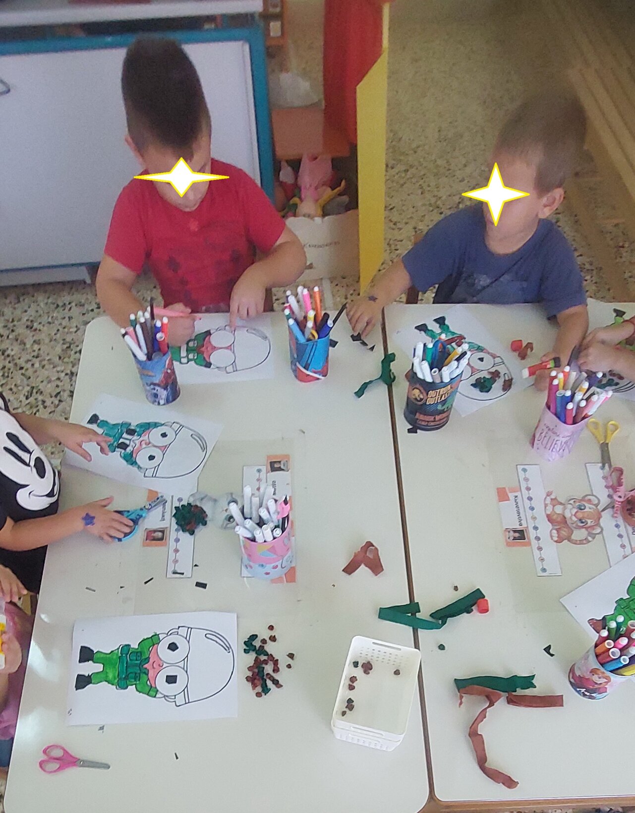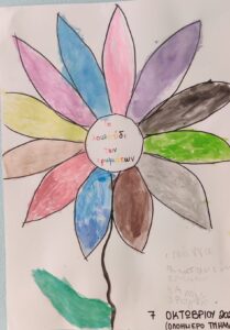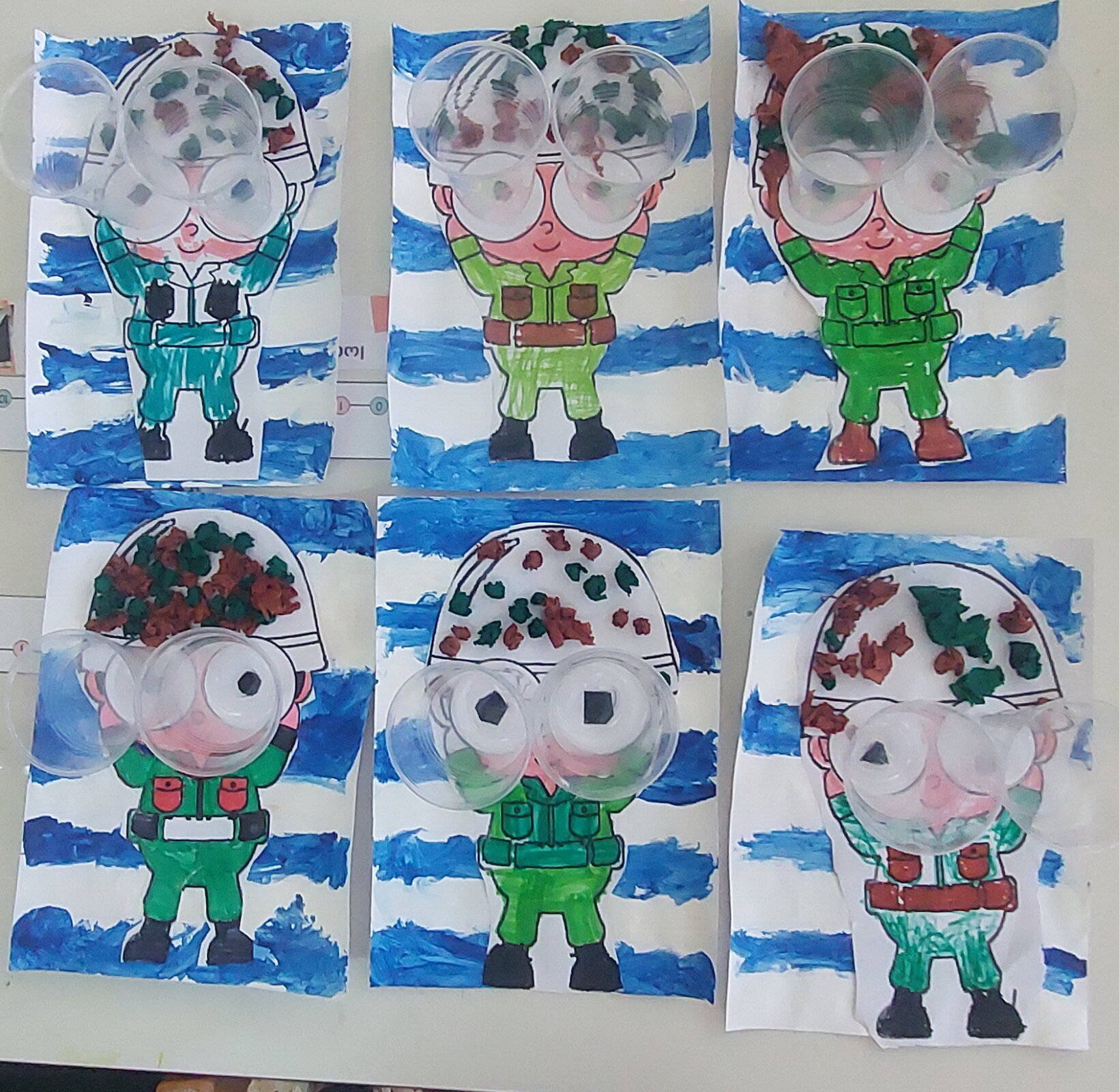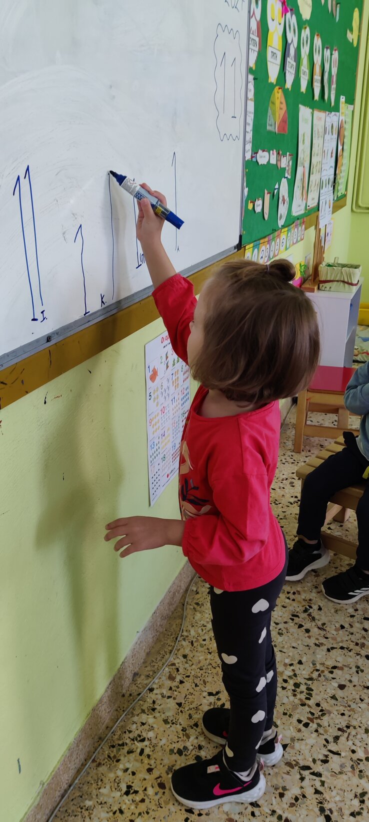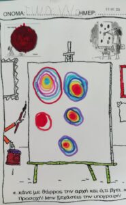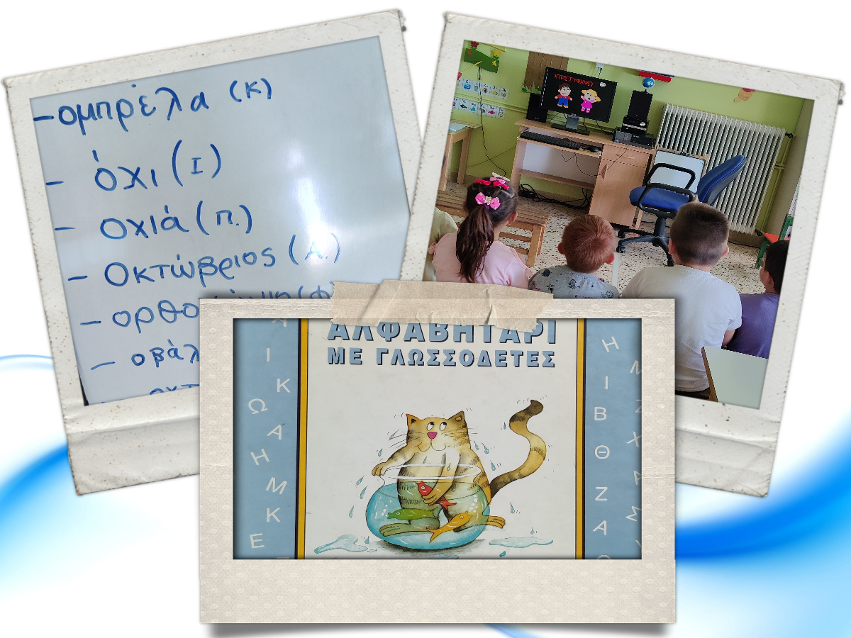 Διαβάσαμε τη “Φάλαινα που μισούσε τον πόλεμο“, ζωγραφίσαμε τι θα θέλαμε να φάει η φάλαινα και τα νήπια το έγραψαν.Γράψαμε τα ονόματα των πρωταγωνιστών της ιστορίαςκαι κολλήσαμε φωτογραφίες της περιόδου εκείνης.Το αναρτήσαμε δίπλα στο εποπτικό υλικό μας.Γράψαμε τι είπαν περιφραστικά οι πρωθυπουργοί και οι φαντάροι μας στα βουνά.Μιλήσαμε για την Ελληνική σημαία: από ποια χρώματα αποτελείται, πόσες γραμμές έχει, ποιοι είναι οι συμβολισμοί.Την ζωγραφίσαμε με πινέλο και γίναμε μικροί αλεξιπτωτιστές.Σχηματίσαμε τη λέξη Αέρα και κολλήσαμε τις φωτογραφίες μας.Εντοπίσαμε τη λέξη και προσπαθήσαμε να την γράψουμε και εμείς.Κάναμε παρέλαση στο προαύλιο, μεταφέροντάς τη με τα χέρια μας.Την συγκρίναμε με άλλες σημαίες του κόσμου.Σε καθεμία από αυτές, αντιστοιχήσαμε τα χρώματά της.Αφού το σχολείο μας συμμετέχει στην Code week,ακολουθήσαμε τον κώδικα που μας δόθηκε και καταφέραμε να τον “σπάσουμε” και να αποκαλύψουμε την Ελληνική σημαία.Όλοι οι μαθητές μας πήραν πιστοποιητικό συμμετοχής για την προσπάθειά τους σε αυτό τον ευρωπαϊκό διαγωνισμό, καθώς και η εκπαιδευτικός που έλαβε μέρος στην δράση.Μιλήσαμε για την Ειρήνη και ζωγραφίσαμε τη Γη μας.Με δαχτυλομπογιές επιμεληθήκαμε τα περιστέρια της Ειρήνης και συνθέσαμε την ομαδική μας κατασκευή.Ευχηθήκαμε να έχει όλη η Γη πάντα Ειρήνη.Παρατηρήσαμε τον πίνακα ζωγραφικής του Πικάσο “Τα λουλούδια της Ειρήνης”και προσπαθήσαμε να τον αναδημιουργήσουμε.Αφού ολοκληρώσαμε τις ατομικές μας εργασίες,αναδημιουργήσαμε τον πίνακα και σε ομαδική εργασία,για να κοσμήσουμε τον τοίχο της τέχνης.Ζωγραφίσαμε την Ειρήνη.Ζωγραφίσαμε τους Έλληνες φαντάρουςνα κρατούν το “Όχι”.Μιλήσαμε για τα συσσίτια, τη φτώχεια, την ανέχεια και για λίγο μπήκαμε στη θέση όσων έζησαν εκείνη την εποχή.Πώς άραγε θα ένιωθαν τα παιδιά που δεν είχαν να φάνε; Τους έλειπε μόνο το φαγητό;Και όταν επέστρεφαν οι φαντάροι απ’ τον πόλεμο, πώς αισθάνονταν;Παρακολουθήσαμε ένα βίντεο με τις συνθήκες διαβίωσης στον πόλεμο.Ζωγραφίσαμε με πινέλο τα χρώματα της Ελληνικής σημαίαςκόψαμε και ζωγραφίσαμε φανταράκιακαι δημιουργήσαμε μία ατομική κατασκευή.Ζωγραφίσαμε τον στρατιώτη στο μέτωπομαζί με την πρώτη Ελληνική σημαία ξηράς της Ελλάδας.Φτιάξαμε μπαλίτσες από γκοφρέ χαρτί καιτις χρησιμοποιήσαμε ως ψηφίδες για να συνθέσουμε το “Όχι”.Αντιστοιχήσαμε λέξεις με εικόνεςσχετικές με τη γιορτή.κυκλώσαμε και ζωγραφίσαμε μόνο τις εικόνες που σχετίζονται με τη γιορτή της 28ης Οκτωβρίου.και εντοπίσαμε που υπάρχει η λέξη “Ελλάδα”. Κατόπιν την γράψαμε στο κατάλληλο πλαίσιο.1Κόψαμε και κολλήσαμετο κανόνι της Ειρήνης.Κατόπιν, το παίξαμε και σε κουκλοθέατρο και μας ενθουσίασε.Ζωγραφίσαμε δύο χέρια, την Ελληνική σημαία και το περιστέρι της Ειρήνης.Τα συνθέσαμε και δημιουργήσαμε μία ατομική κατασκευήΚολλήσαμε τις κατασκευές μας και δημιουργήσαμε το σκηνικό για τη γιορτή μας.Σε μία κλειστού τύπου γιορτή, απαγγείλαμε τα ποιήματά μας, τραγουδήσαμε και απαγγείλαμε τον Εθνικό μας ύμνο.Εκκλησιαστήκαμε, κάναμε παρέλαση και καταθέσαμε στεφάνι στη μνήμη των πεσόντων.