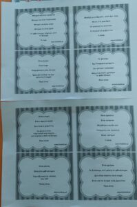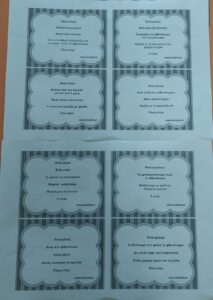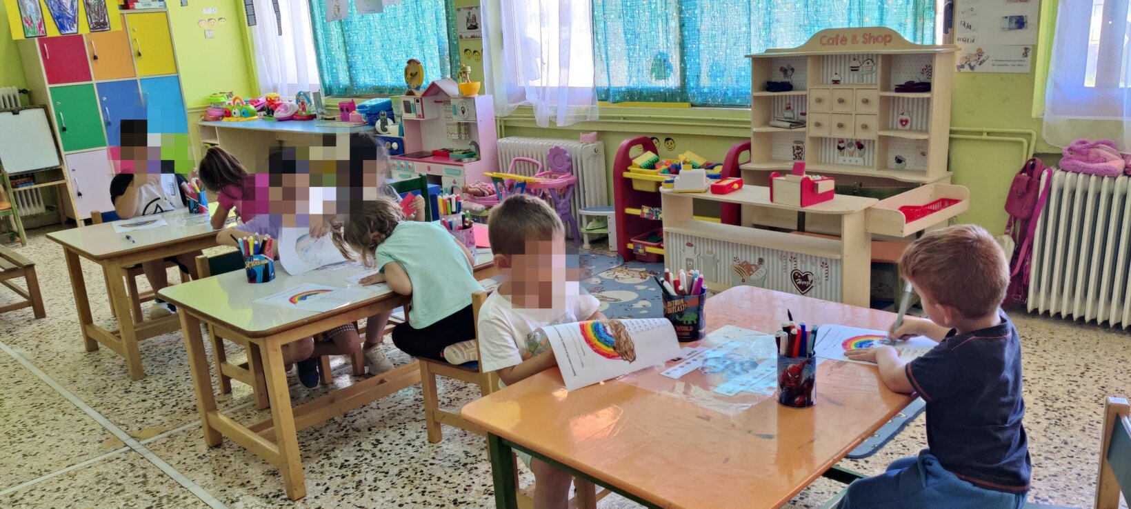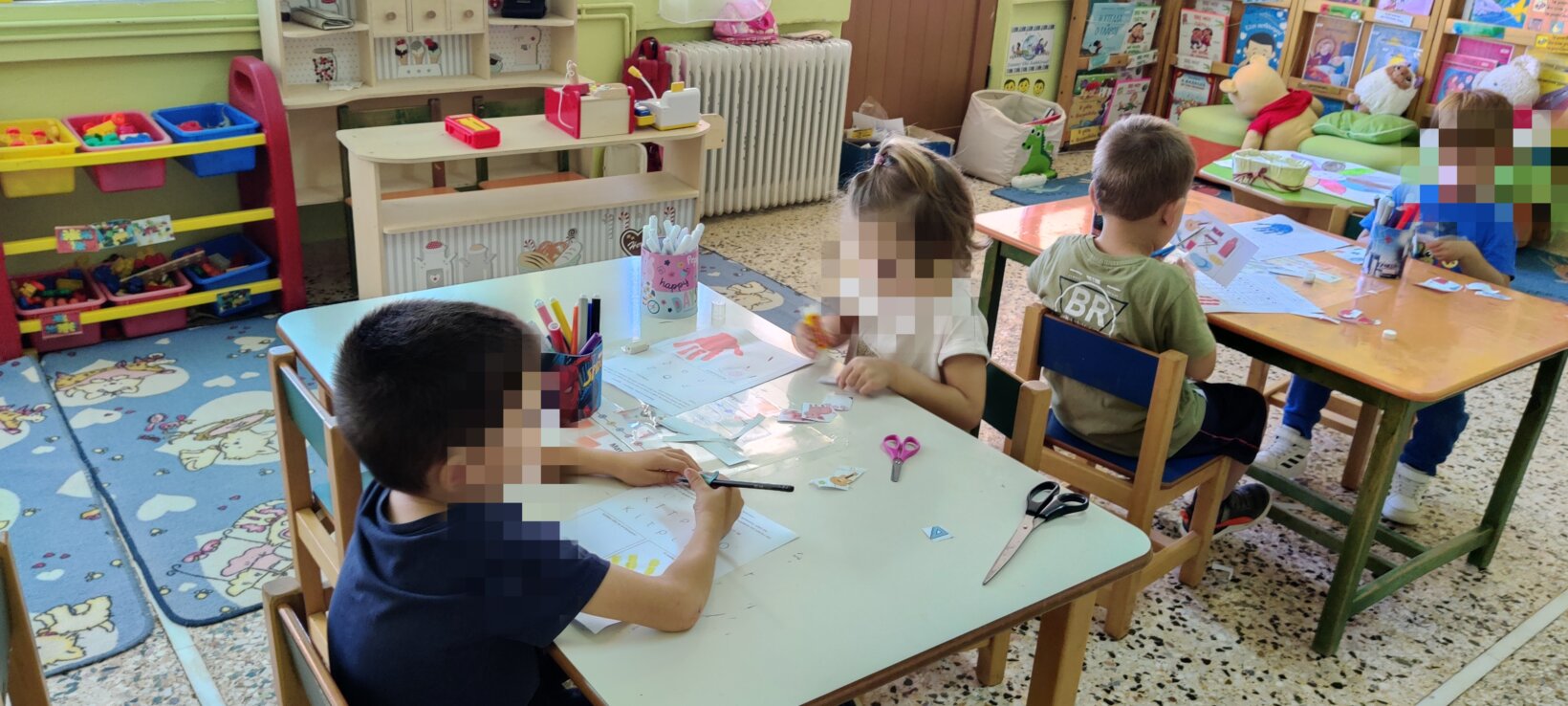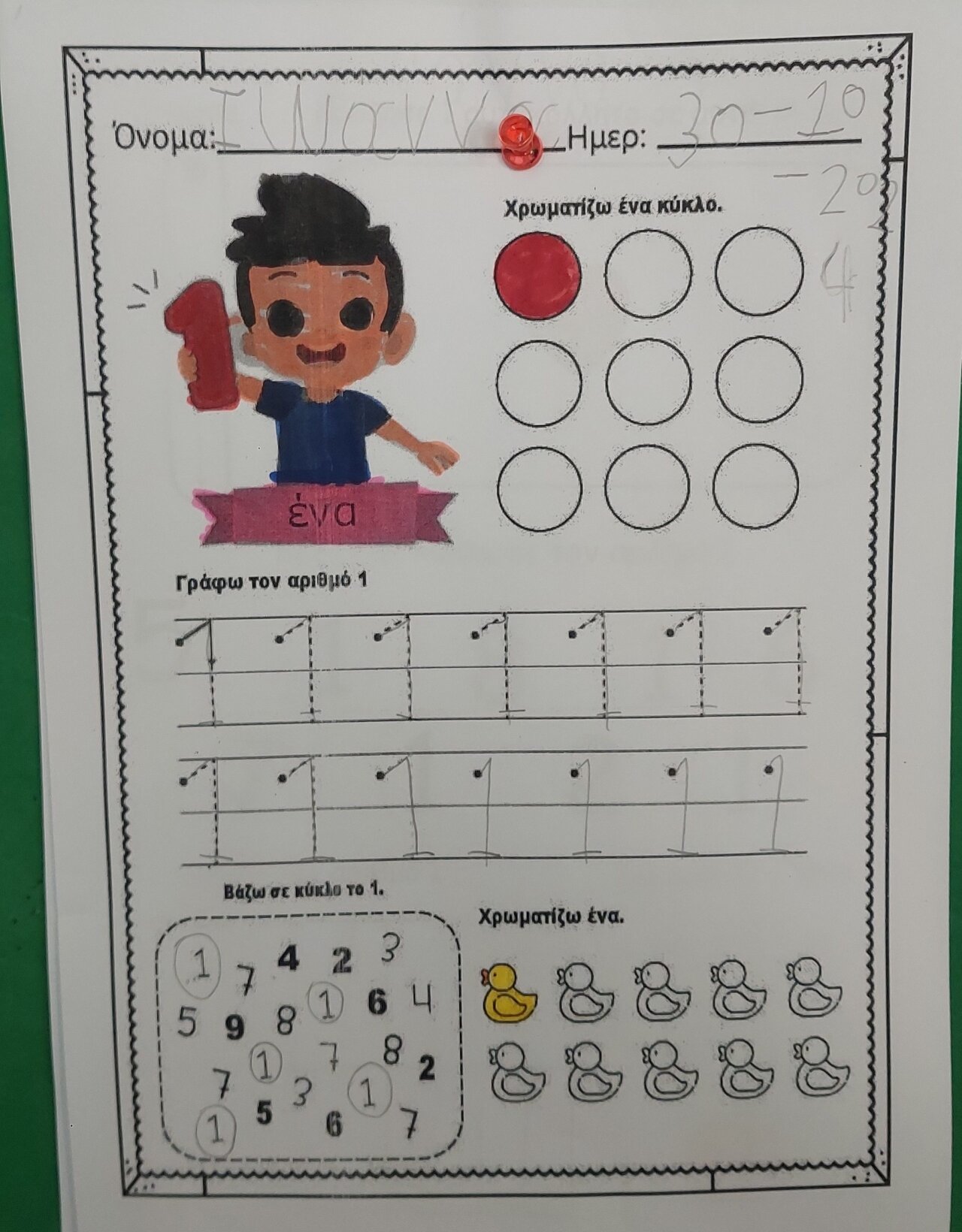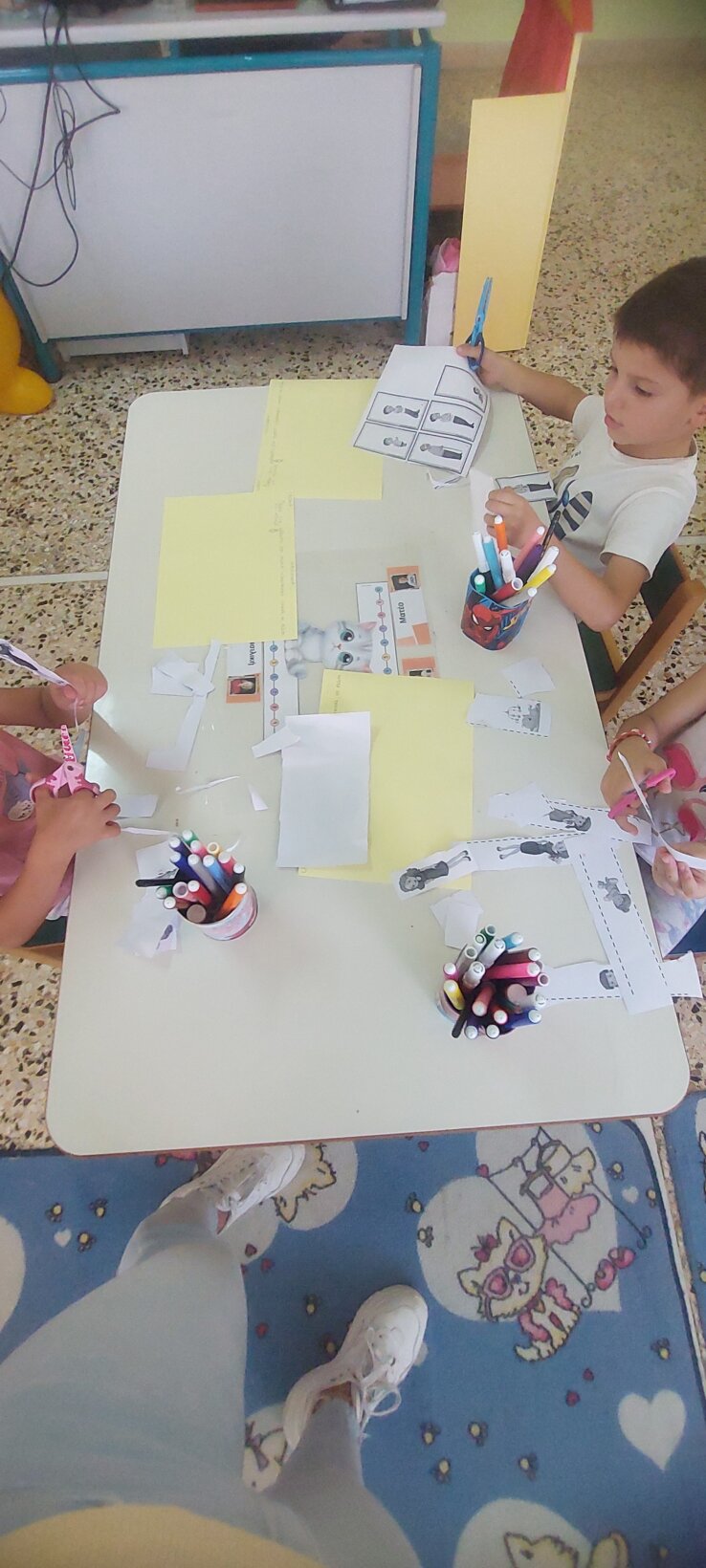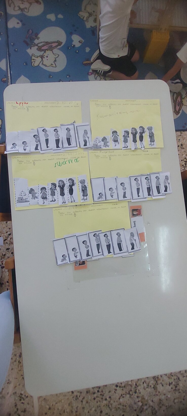 Διαβάσαμε τη “Φάλαινα που μισούσε τον πόλεμο“, ζωγραφίσαμε τι θα θέλαμε να φάει η φάλαινα και τα νήπια το έγραψαν.Γράψαμε τα ονόματα των πρωταγωνιστών της ιστορίαςκαι κολλήσαμε φωτογραφίες της περιόδου εκείνης.Το αναρτήσαμε δίπλα στο εποπτικό υλικό μας.Γράψαμε τι είπαν περιφραστικά οι πρωθυπουργοί και οι φαντάροι μας στα βουνά.Μιλήσαμε για την Ελληνική σημαία: από ποια χρώματα αποτελείται, πόσες γραμμές έχει, ποιοι είναι οι συμβολισμοί.Την ζωγραφίσαμε με πινέλο και γίναμε μικροί αλεξιπτωτιστές.Σχηματίσαμε τη λέξη Αέρα και κολλήσαμε τις φωτογραφίες μας.Εντοπίσαμε τη λέξη και προσπαθήσαμε να την γράψουμε και εμείς.Κάναμε παρέλαση στο προαύλιο, μεταφέροντάς τη με τα χέρια μας.Την συγκρίναμε με άλλες σημαίες του κόσμου.Σε καθεμία από αυτές, αντιστοιχήσαμε τα χρώματά της.Αφού το σχολείο μας συμμετέχει στην Code week,ακολουθήσαμε τον κώδικα που μας δόθηκε και καταφέραμε να τον “σπάσουμε” και να αποκαλύψουμε την Ελληνική σημαία.Όλοι οι μαθητές μας πήραν πιστοποιητικό συμμετοχής για την προσπάθειά τους σε αυτό τον ευρωπαϊκό διαγωνισμό, καθώς και η εκπαιδευτικός που έλαβε μέρος στην δράση.Μιλήσαμε για την Ειρήνη και ζωγραφίσαμε τη Γη μας.Με δαχτυλομπογιές επιμεληθήκαμε τα περιστέρια της Ειρήνης και συνθέσαμε την ομαδική μας κατασκευή.Ευχηθήκαμε να έχει όλη η Γη πάντα Ειρήνη.Παρατηρήσαμε τον πίνακα ζωγραφικής του Πικάσο “Τα λουλούδια της Ειρήνης”και προσπαθήσαμε να τον αναδημιουργήσουμε.Αφού ολοκληρώσαμε τις ατομικές μας εργασίες,αναδημιουργήσαμε τον πίνακα και σε ομαδική εργασία,για να κοσμήσουμε τον τοίχο της τέχνης.Ζωγραφίσαμε την Ειρήνη.Ζωγραφίσαμε τους Έλληνες φαντάρουςνα κρατούν το “Όχι”.Μιλήσαμε για τα συσσίτια, τη φτώχεια, την ανέχεια και για λίγο μπήκαμε στη θέση όσων έζησαν εκείνη την εποχή.Πώς άραγε θα ένιωθαν τα παιδιά που δεν είχαν να φάνε; Τους έλειπε μόνο το φαγητό;Και όταν επέστρεφαν οι φαντάροι απ’ τον πόλεμο, πώς αισθάνονταν;Παρακολουθήσαμε ένα βίντεο με τις συνθήκες διαβίωσης στον πόλεμο.Ζωγραφίσαμε με πινέλο τα χρώματα της Ελληνικής σημαίαςκόψαμε και ζωγραφίσαμε φανταράκιακαι δημιουργήσαμε μία ατομική κατασκευή.Ζωγραφίσαμε τον στρατιώτη στο μέτωπομαζί με την πρώτη Ελληνική σημαία ξηράς της Ελλάδας.Φτιάξαμε μπαλίτσες από γκοφρέ χαρτί καιτις χρησιμοποιήσαμε ως ψηφίδες για να συνθέσουμε το “Όχι”.Αντιστοιχήσαμε λέξεις με εικόνεςσχετικές με τη γιορτή.κυκλώσαμε και ζωγραφίσαμε μόνο τις εικόνες που σχετίζονται με τη γιορτή της 28ης Οκτωβρίου.και εντοπίσαμε που υπάρχει η λέξη “Ελλάδα”. Κατόπιν την γράψαμε στο κατάλληλο πλαίσιο.1Κόψαμε και κολλήσαμετο κανόνι της Ειρήνης.Κατόπιν, το παίξαμε και σε κουκλοθέατρο και μας ενθουσίασε.Ζωγραφίσαμε δύο χέρια, την Ελληνική σημαία και το περιστέρι της Ειρήνης.Τα συνθέσαμε και δημιουργήσαμε μία ατομική κατασκευήΚολλήσαμε τις κατασκευές μας και δημιουργήσαμε το σκηνικό για τη γιορτή μας.Σε μία κλειστού τύπου γιορτή, απαγγείλαμε τα ποιήματά μας, τραγουδήσαμε και απαγγείλαμε τον Εθνικό μας ύμνο.Εκκλησιαστήκαμε, κάναμε παρέλαση και καταθέσαμε στεφάνι στη μνήμη των πεσόντων.