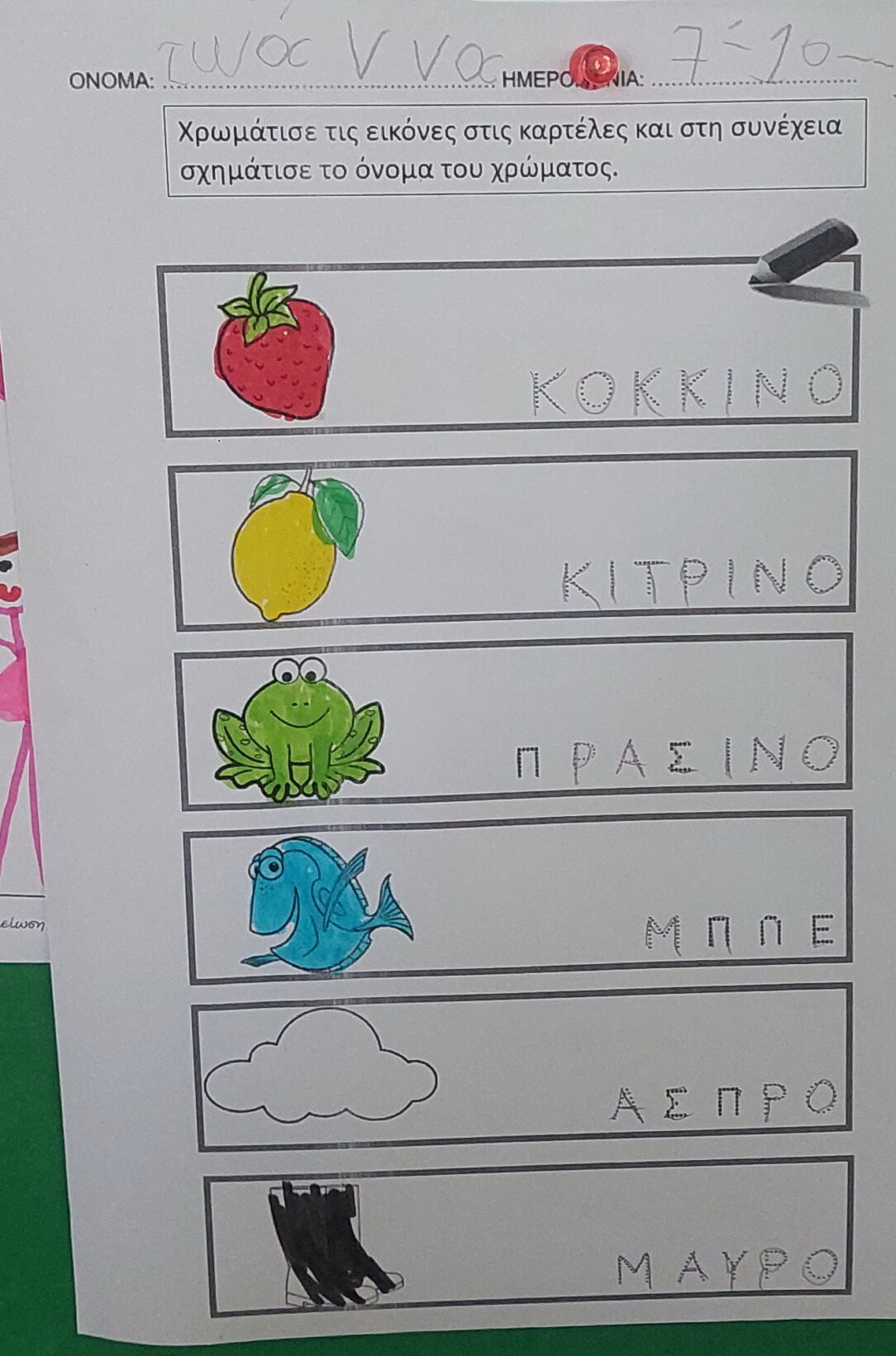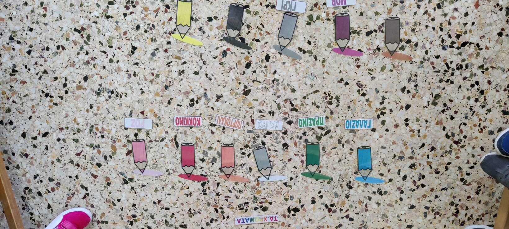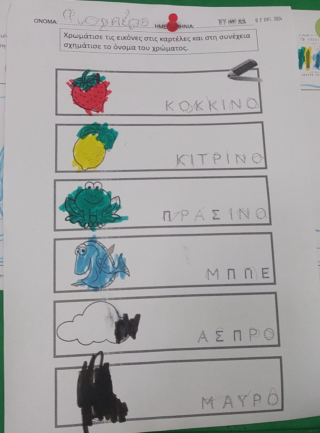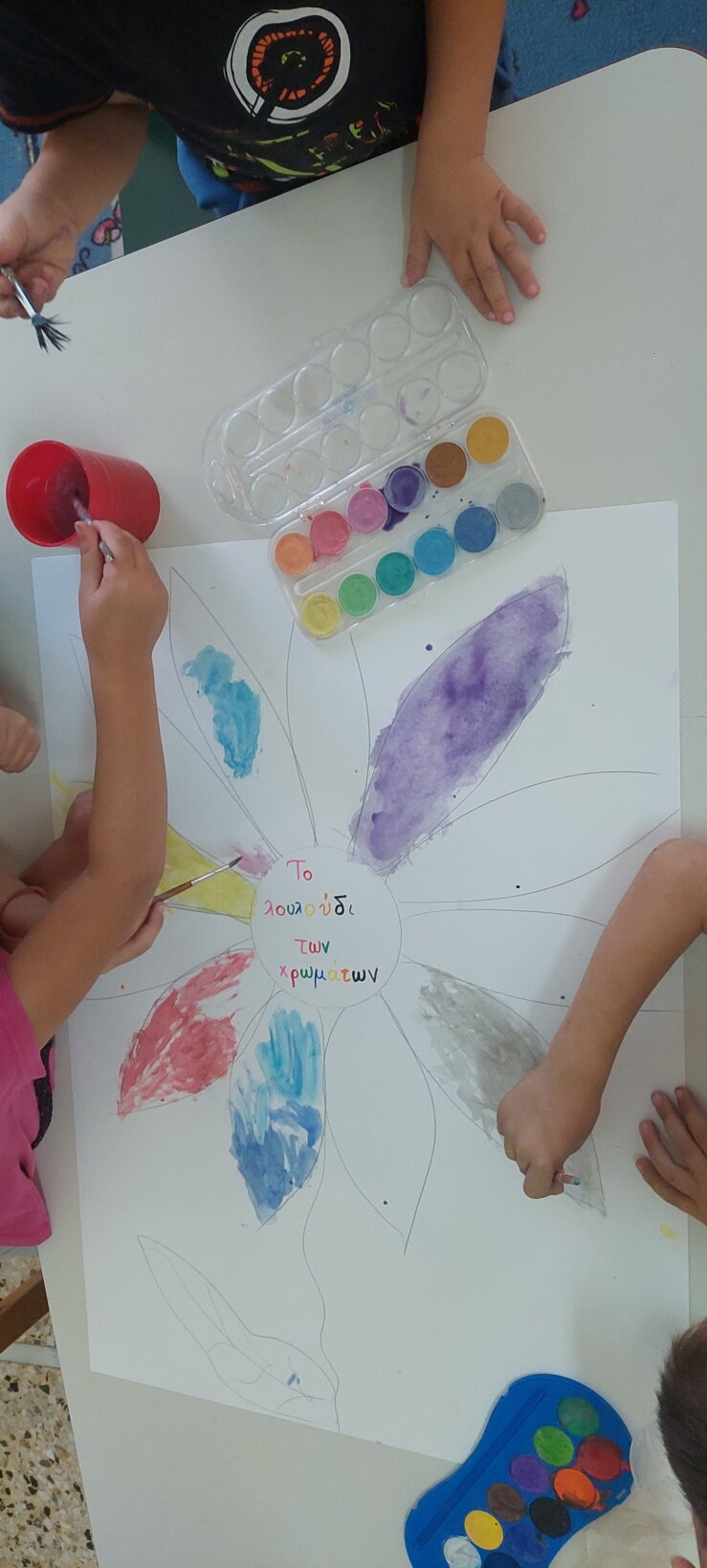 Ονοματίσαμε και βρήκαμε απ’ το σύνολο των μαρκαδόρων, το μαρκαδόρο που είχε το χρώμα της μπλούζας μας.Τοποθετήσαμε οικοδομικό υλικό και αντικείμενα της τάξης μέσα στα στεφάνιαανάλογα με το χρώμα τους.Διαβάσαμε το αγαπημένο βιβλίο του Oliver Jeffersζωγραφίσαμε με το αγαπημένο μας χρώμα.Κάναμε μίξεις χρωμάτωνχρησιμοποιώντας τις μικρές μας παλάμεςκαι το αναρτήσαμε στον τοίχο για να θυμόμαστε τα συμπληρωματικά χρώματα που προκύπτουν.Ακολούθησε και η ατομική εργασία με τη μείξη των χρωμάτων.Μάθαμε το τραγούδι του ουράνιου τόξουκαι ζωγραφίσαμε το δικό μας ουράνιο τόξο (ατομική κατασκευή).Αντιστοιχήσαμε τα χρώματα με τις λέξεις1και βάλαμε στους κουβάδες με τα χρώματααντικείμενα με τα χρώματα αυτά.Το ίδιο κάναμε και σε φύλλο εργασίας ατομικάγράψαμε τη λέξη με κεφαλαία και πεζά και αποτυπώσαμε την παλάμη μας.Ζωγραφίσαμε με κηρομπογιές σε ατομική εργασία.Γράψαμε κάποιες από τις ονομασίες των χρωμάτωνκαι ζωγραφίσαμε αντικείμενα με το χρώμα αυτό.Μάθαμε τα ψυχρά και τα θερμά χρώματακαι τα ζωγραφίσαμε με νερομπογιές.Βάψαμε με τις νερομπογιές μας στο χαρτόνικαι δημιουργήσαμε “Το λουλούδι των χρωμάτων” (ομαδική κατασκευή).