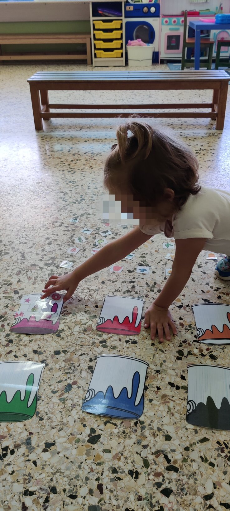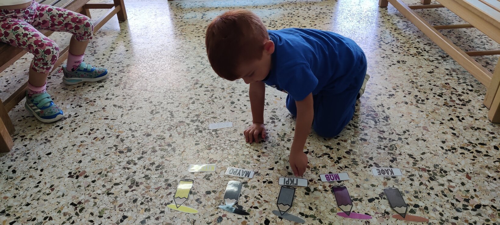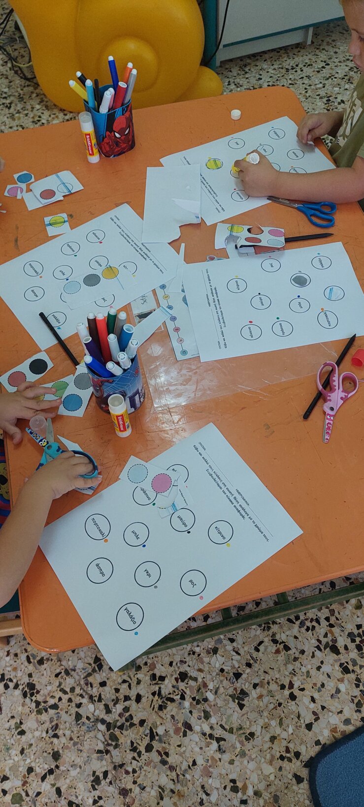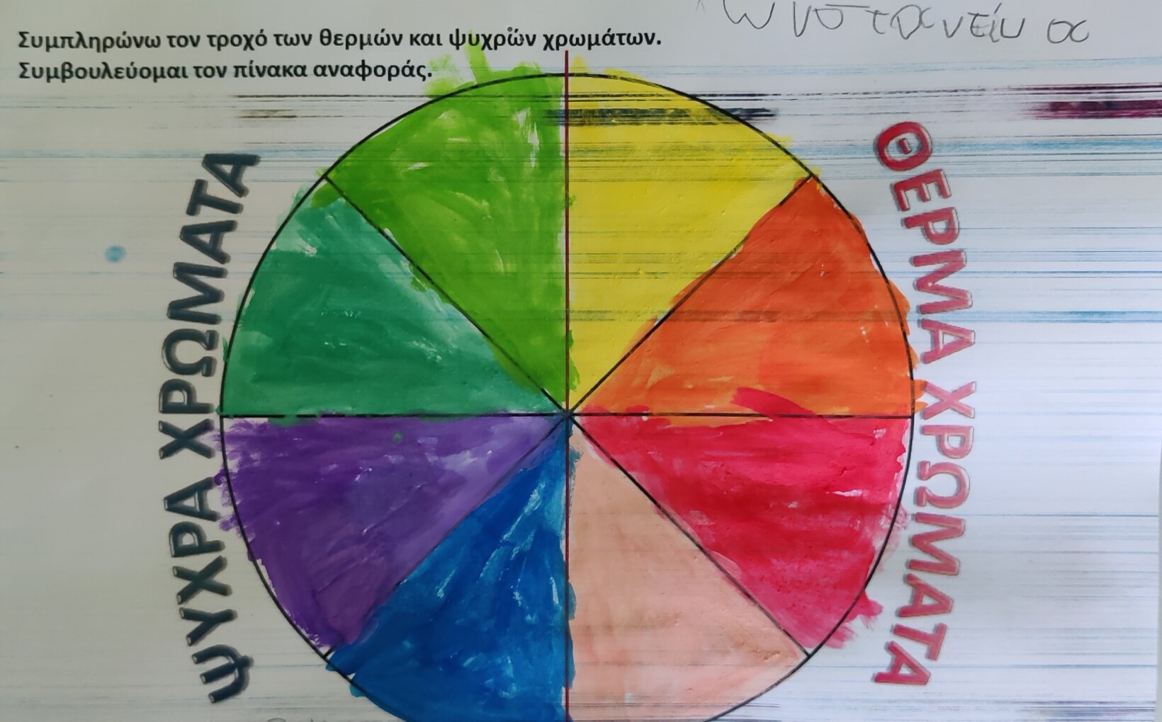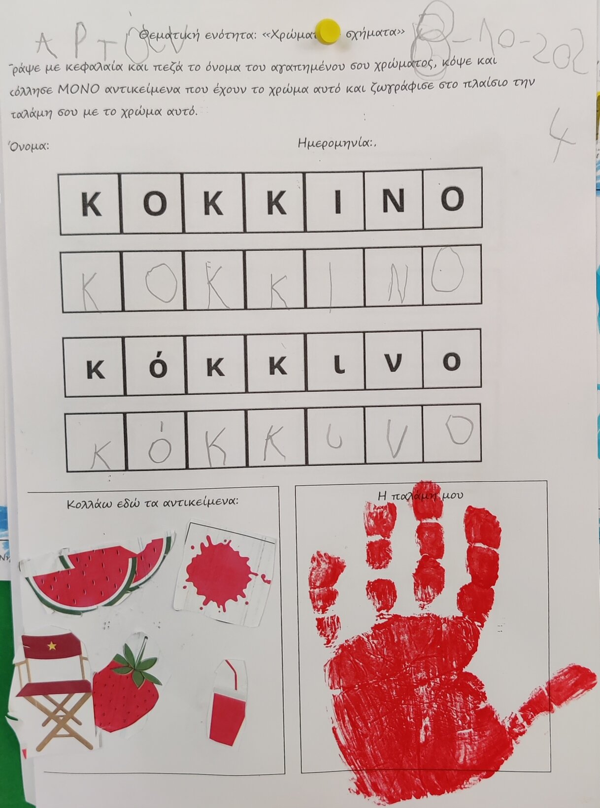 Ονοματίσαμε και βρήκαμε απ’ το σύνολο των μαρκαδόρων, το μαρκαδόρο που είχε το χρώμα της μπλούζας μας.Τοποθετήσαμε οικοδομικό υλικό και αντικείμενα της τάξης μέσα στα στεφάνιαανάλογα με το χρώμα τους.Διαβάσαμε το αγαπημένο βιβλίο του Oliver Jeffersζωγραφίσαμε με το αγαπημένο μας χρώμα.Κάναμε μίξεις χρωμάτωνχρησιμοποιώντας τις μικρές μας παλάμεςκαι το αναρτήσαμε στον τοίχο για να θυμόμαστε τα συμπληρωματικά χρώματα που προκύπτουν.Ακολούθησε και η ατομική εργασία με τη μείξη των χρωμάτων.Μάθαμε το τραγούδι του ουράνιου τόξουκαι ζωγραφίσαμε το δικό μας ουράνιο τόξο (ατομική κατασκευή).Αντιστοιχήσαμε τα χρώματα με τις λέξεις1και βάλαμε στους κουβάδες με τα χρώματααντικείμενα με τα χρώματα αυτά.Το ίδιο κάναμε και σε φύλλο εργασίας ατομικάγράψαμε τη λέξη με κεφαλαία και πεζά και αποτυπώσαμε την παλάμη μας.Ζωγραφίσαμε με κηρομπογιές σε ατομική εργασία.Γράψαμε κάποιες από τις ονομασίες των χρωμάτωνκαι ζωγραφίσαμε αντικείμενα με το χρώμα αυτό.Μάθαμε τα ψυχρά και τα θερμά χρώματακαι τα ζωγραφίσαμε με νερομπογιές.Βάψαμε με τις νερομπογιές μας στο χαρτόνικαι δημιουργήσαμε “Το λουλούδι των χρωμάτων” (ομαδική κατασκευή).