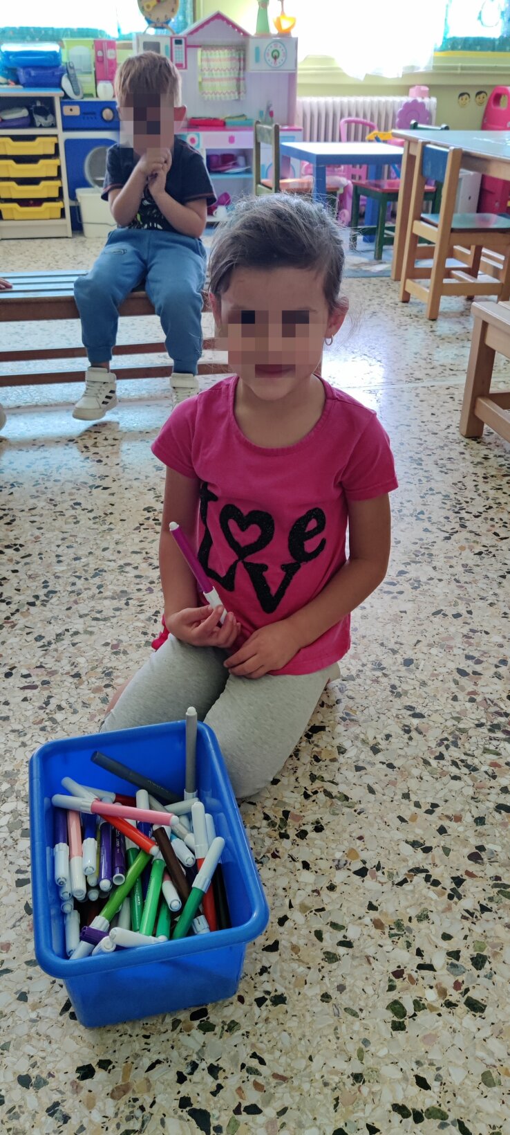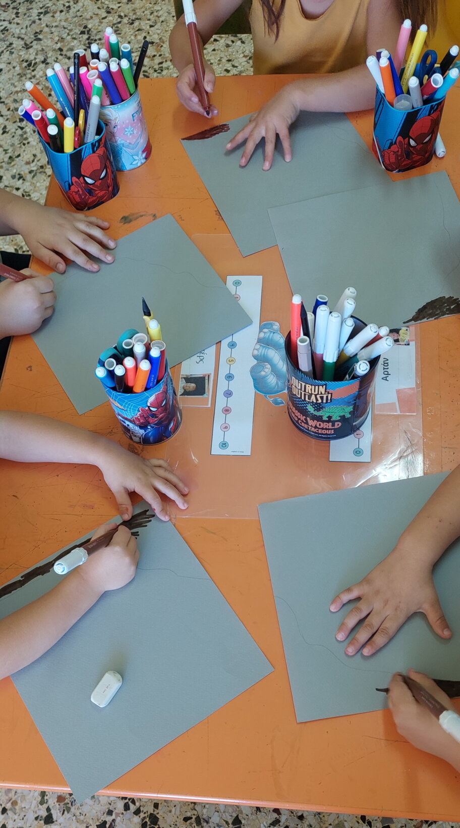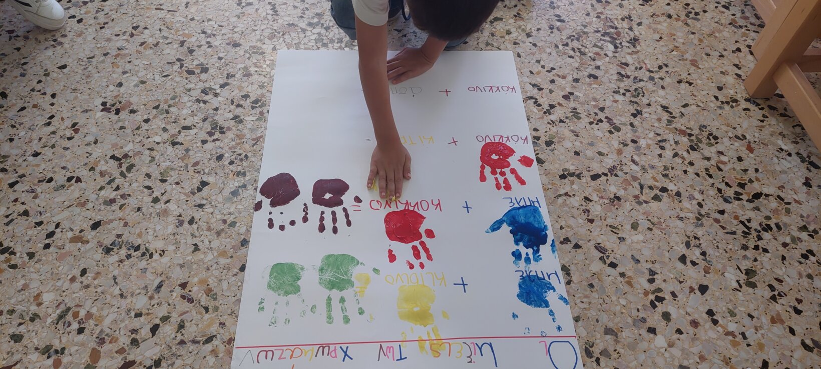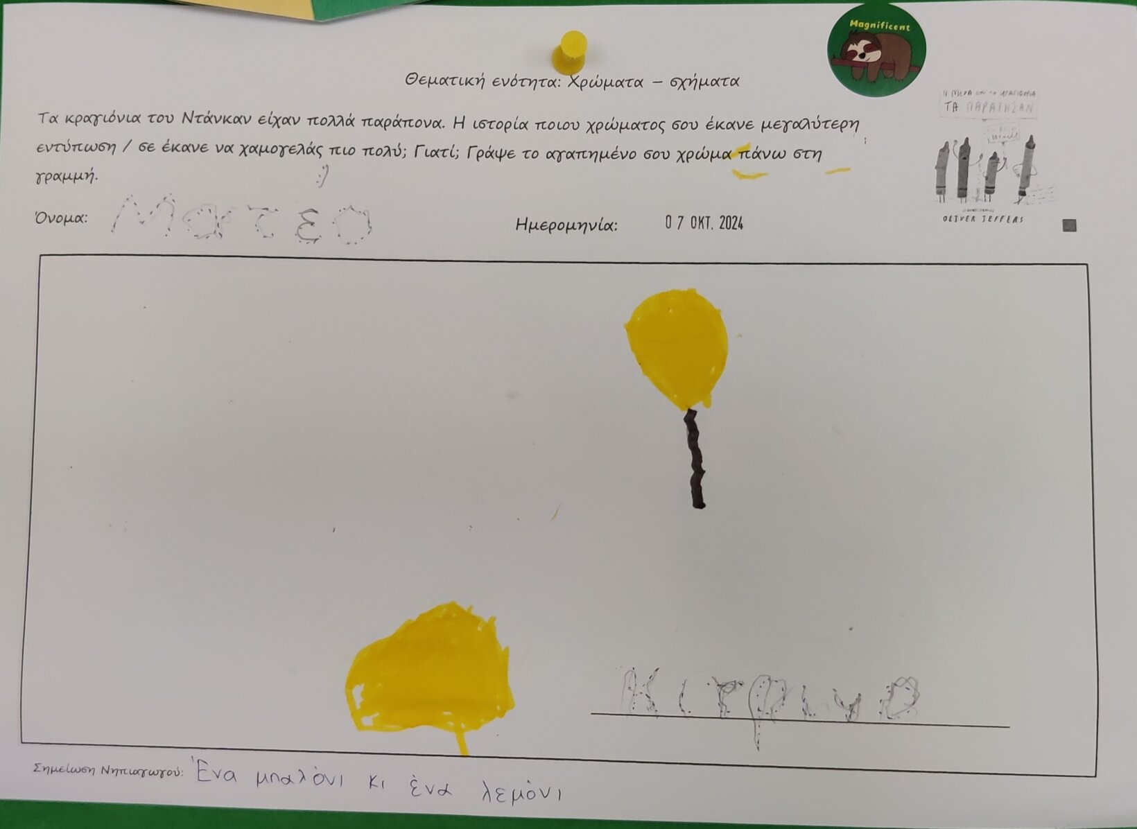 Ονοματίσαμε και βρήκαμε απ’ το σύνολο των μαρκαδόρων, το μαρκαδόρο που είχε το χρώμα της μπλούζας μας.Τοποθετήσαμε οικοδομικό υλικό και αντικείμενα της τάξης μέσα στα στεφάνιαανάλογα με το χρώμα τους.Διαβάσαμε το αγαπημένο βιβλίο του Oliver Jeffersζωγραφίσαμε με το αγαπημένο μας χρώμα.Κάναμε μίξεις χρωμάτωνχρησιμοποιώντας τις μικρές μας παλάμεςκαι το αναρτήσαμε στον τοίχο για να θυμόμαστε τα συμπληρωματικά χρώματα που προκύπτουν.Ακολούθησε και η ατομική εργασία με τη μείξη των χρωμάτων.Μάθαμε το τραγούδι του ουράνιου τόξουκαι ζωγραφίσαμε το δικό μας ουράνιο τόξο (ατομική κατασκευή).Αντιστοιχήσαμε τα χρώματα με τις λέξεις1και βάλαμε στους κουβάδες με τα χρώματααντικείμενα με τα χρώματα αυτά.Το ίδιο κάναμε και σε φύλλο εργασίας ατομικάγράψαμε τη λέξη με κεφαλαία και πεζά και αποτυπώσαμε την παλάμη μας.Ζωγραφίσαμε με κηρομπογιές σε ατομική εργασία.Γράψαμε κάποιες από τις ονομασίες των χρωμάτωνκαι ζωγραφίσαμε αντικείμενα με το χρώμα αυτό.Μάθαμε τα ψυχρά και τα θερμά χρώματακαι τα ζωγραφίσαμε με νερομπογιές.Βάψαμε με τις νερομπογιές μας στο χαρτόνικαι δημιουργήσαμε “Το λουλούδι των χρωμάτων” (ομαδική κατασκευή).