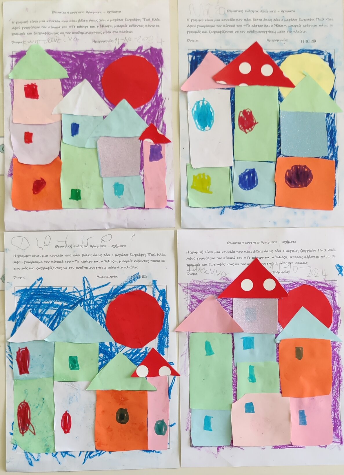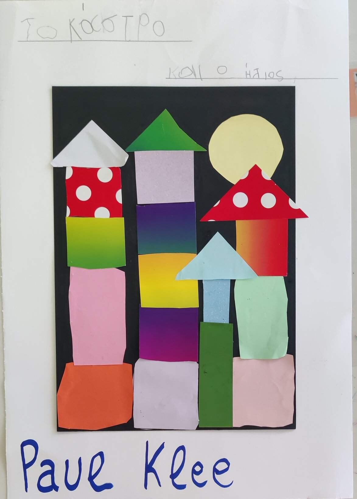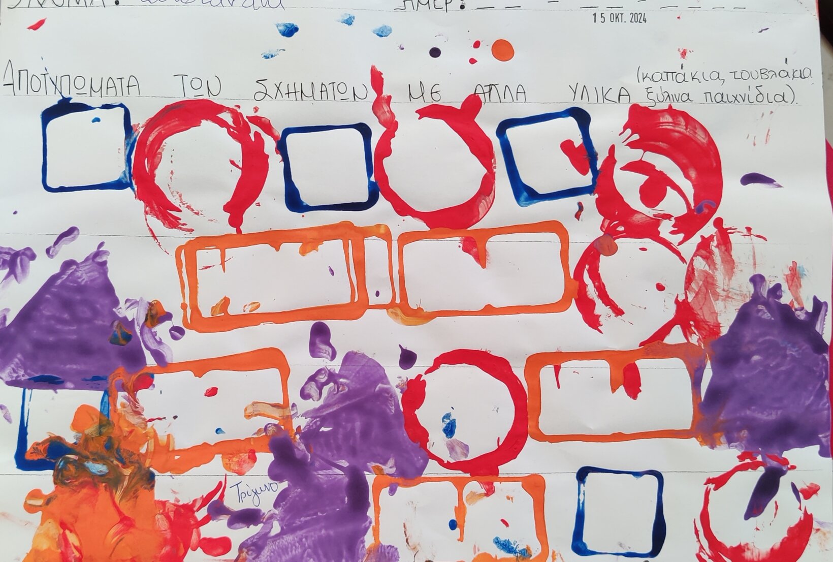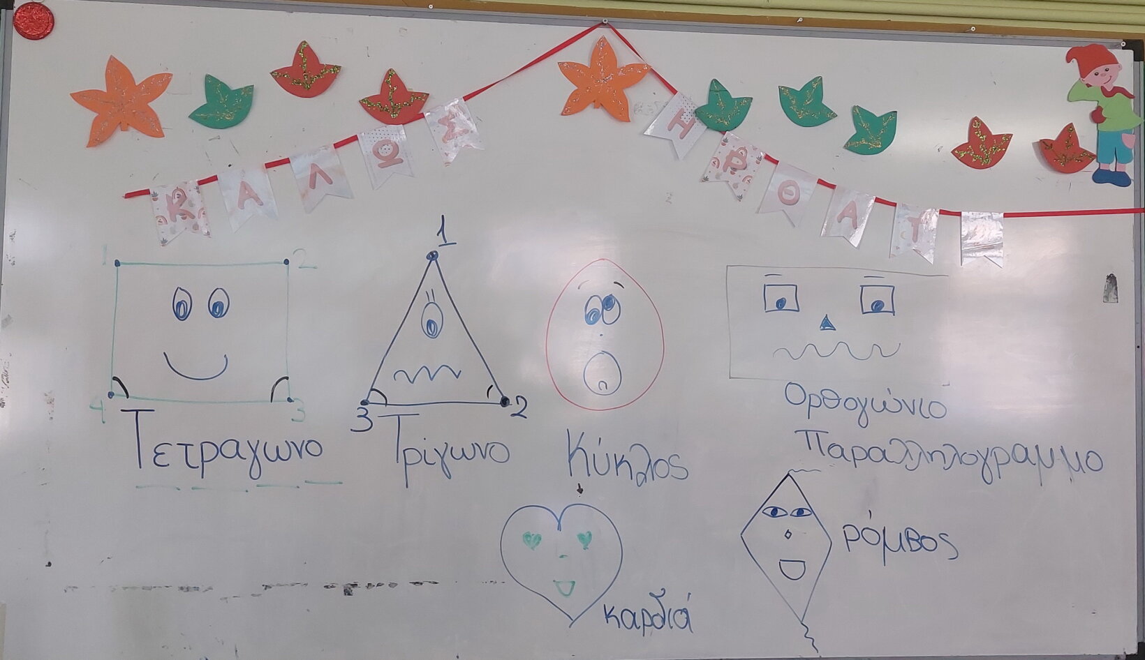 Μιλήσαμε για τα επίπεδα γεωμετρικά σχήματα.Κάναμε αντιστοιχήσειςκόψαμε και κολλήσαμε τα σχήματα στη σωστή θέση.Διαβάσαμε το βιβλίο του Έλμερ του παρδαλού ελέφαντακαι τον ζωγραφίσαμε.Διαβάσαμε την “Τελεία” και δημιουργήσαμε τις δικές μας τελείες.Παίξαμε το διαδικτυακό παιχνίδι “Βρες το σχήμα”.Αντιστοιχήσαμε τα γεωμετρικά σχήματα ανάλογα με το μέγεθος και το χρώμα στο σωστό σημείο.Παρατηρήσαμε τον πίνακα του Πάουλ Κλέε “Κάστρο και Ήλιος” και προσπαθήσαμε να βρούμε τα σχήματα που έχει ζωγραφίσει.Κόψαμε σχήματα σε διάφορα μεγέθη και χρώματακαι φτιάξαμε σε ατομική κατασκευή την αναδημιουργία του πίνακα.Με τα σχήματα που μας περίσσεψαν,φτιάξαμε και μία ομαδική κατασκευή, γράψαμε τον τίτλο για τηναναρτήσαμε στον τοίχο της τέχνης.Κάναμε τυπώματα με υλικά του σχολείου.Τα σχήματα με απλά υλικά.Προγραμματίσαμε την πασχαλίτσα απ’ το Φωτόδεντρο (Σύνθετος προγραμματισμός ρομπότ) να επισκεφτεί τα σχήματα της σχηματοχώρας.