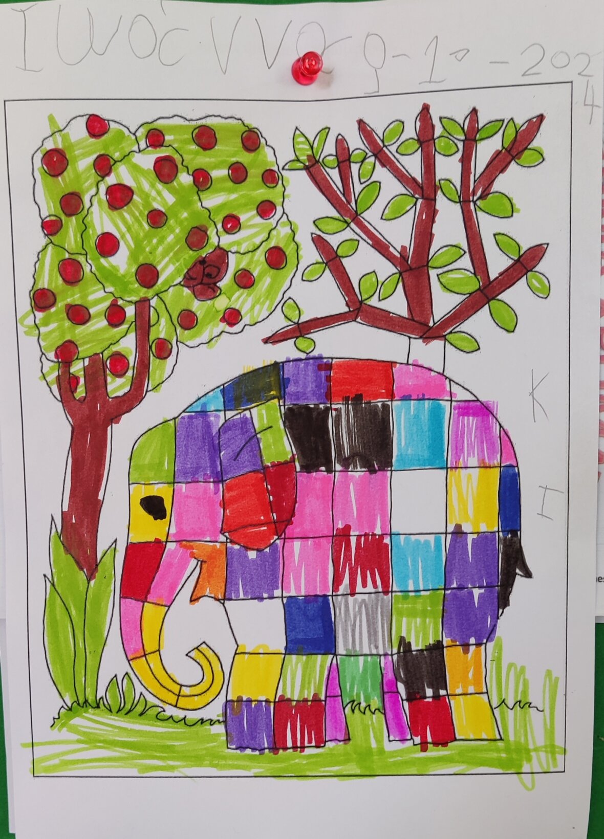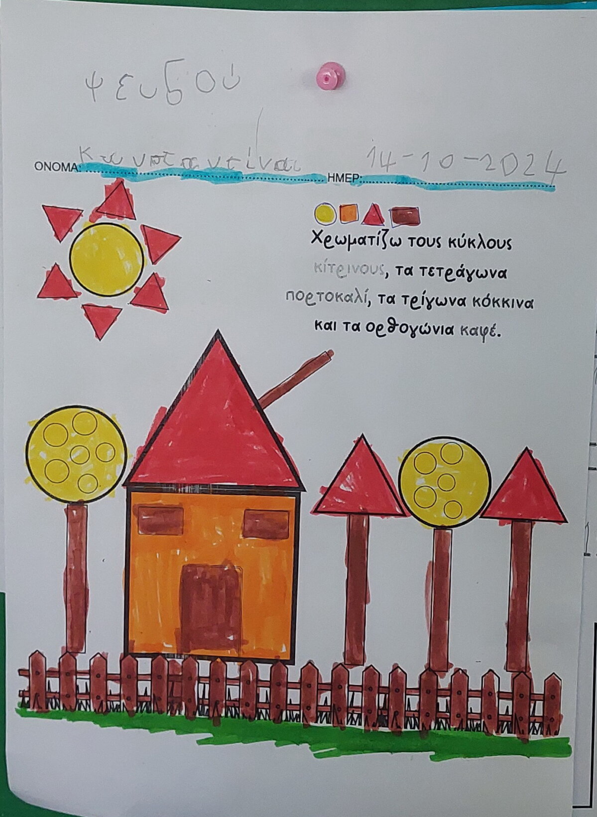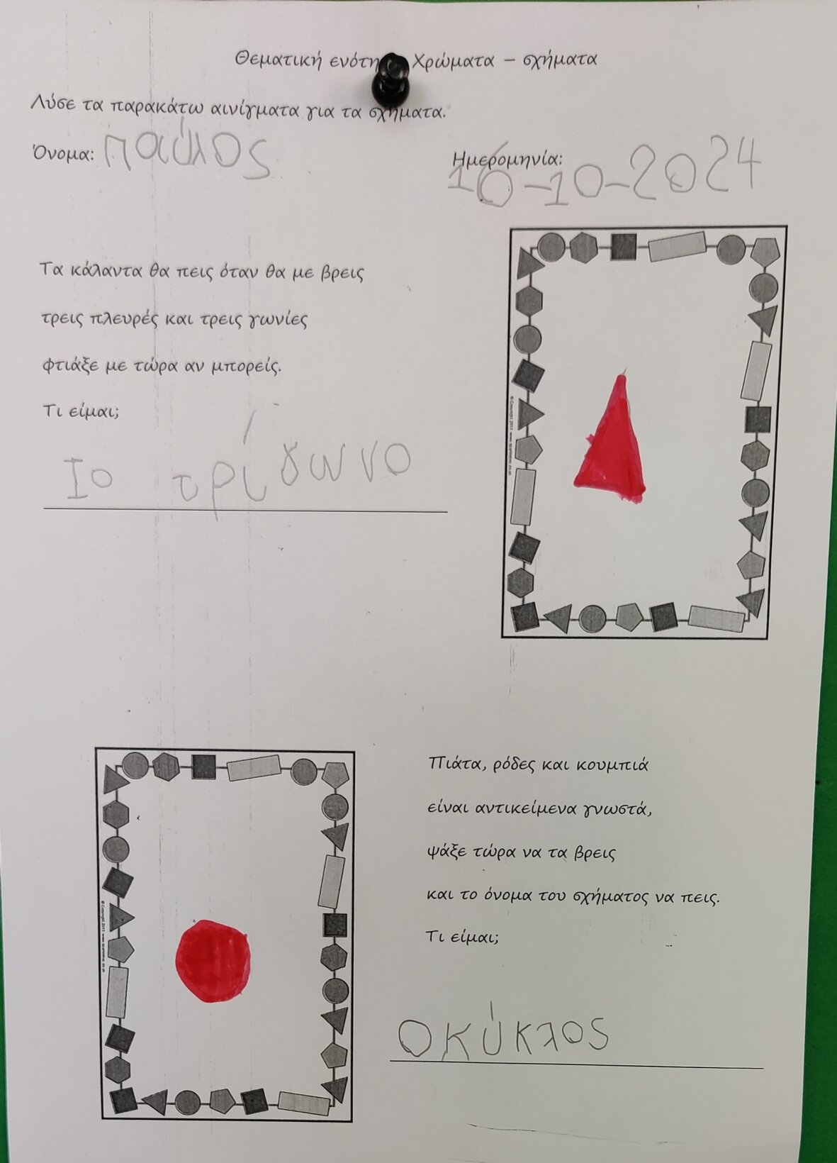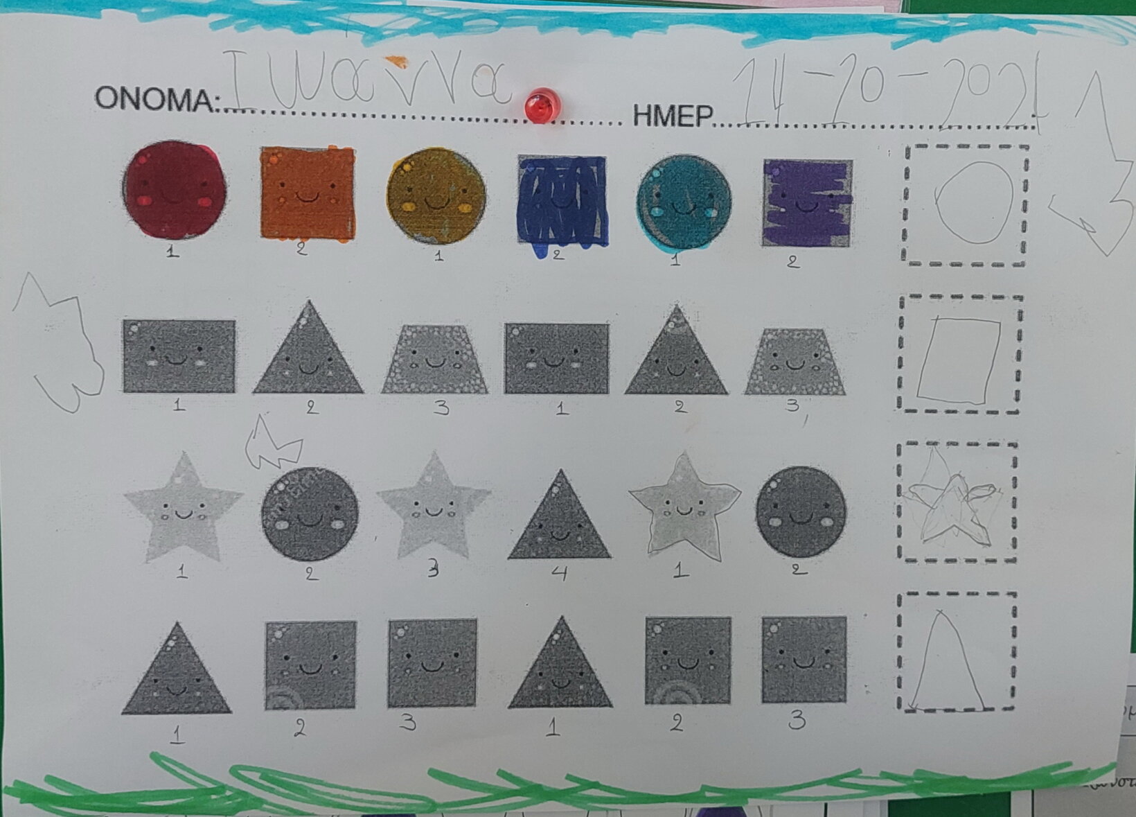 Μιλήσαμε για τα επίπεδα γεωμετρικά σχήματα.Κάναμε αντιστοιχήσειςκόψαμε και κολλήσαμε τα σχήματα στη σωστή θέση.Διαβάσαμε το βιβλίο του Έλμερ του παρδαλού ελέφαντακαι τον ζωγραφίσαμε.Διαβάσαμε την “Τελεία” και δημιουργήσαμε τις δικές μας τελείες.Παίξαμε το διαδικτυακό παιχνίδι “Βρες το σχήμα”.Αντιστοιχήσαμε τα γεωμετρικά σχήματα ανάλογα με το μέγεθος και το χρώμα στο σωστό σημείο.Παρατηρήσαμε τον πίνακα του Πάουλ Κλέε “Κάστρο και Ήλιος” και προσπαθήσαμε να βρούμε τα σχήματα που έχει ζωγραφίσει.Κόψαμε σχήματα σε διάφορα μεγέθη και χρώματακαι φτιάξαμε σε ατομική κατασκευή την αναδημιουργία του πίνακα.Με τα σχήματα που μας περίσσεψαν,φτιάξαμε και μία ομαδική κατασκευή, γράψαμε τον τίτλο για τηναναρτήσαμε στον τοίχο της τέχνης.Κάναμε τυπώματα με υλικά του σχολείου.Τα σχήματα με απλά υλικά.Προγραμματίσαμε την πασχαλίτσα απ’ το Φωτόδεντρο (Σύνθετος προγραμματισμός ρομπότ) να επισκεφτεί τα σχήματα της σχηματοχώρας.