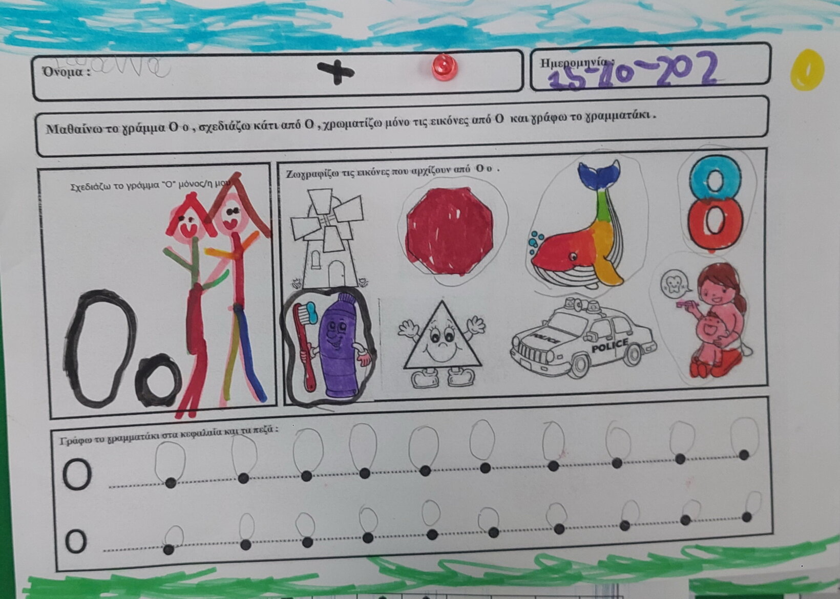 Βρήκαμε αντικείμενα μέσα στην τάξη που μας θυμίζουν το γράμμα αυτό και το σχεδιάσαμε με την πλαστελίνη.Στις καρτέλες της γραφής, βρήκαμε λέξεις που περιέχουν το ο, τις κρεμάσαμε στη γωνιά της γραφής και τα νήπια τις έγραψαν σε Α4.Κατόπιν, συμπληρώσαμε φύλλα εργασίαςκαι κάναμε την κατασκευή του Ο. “Ο όπως ομπρέλα“.