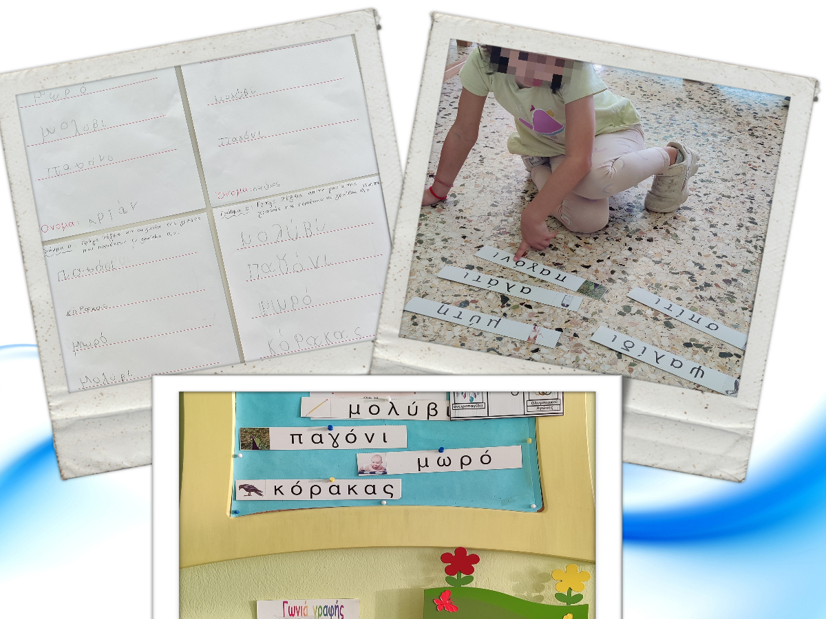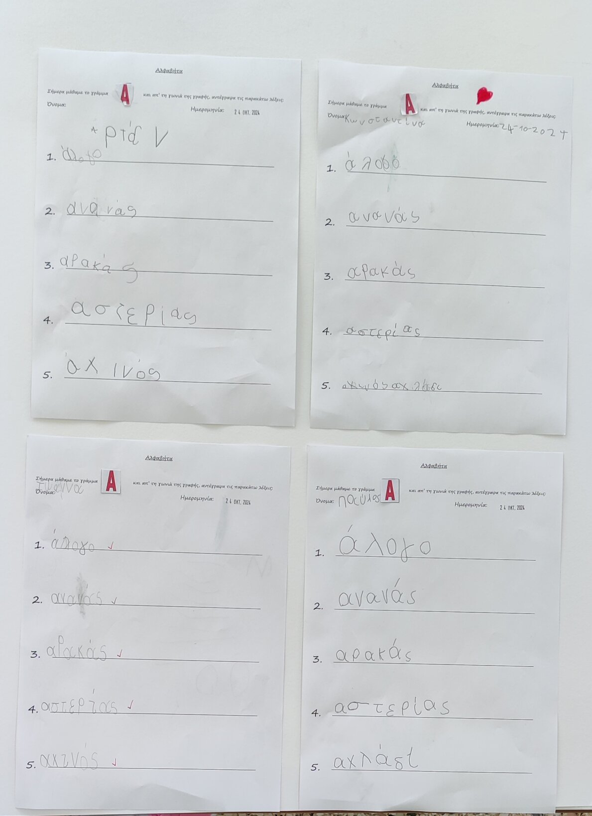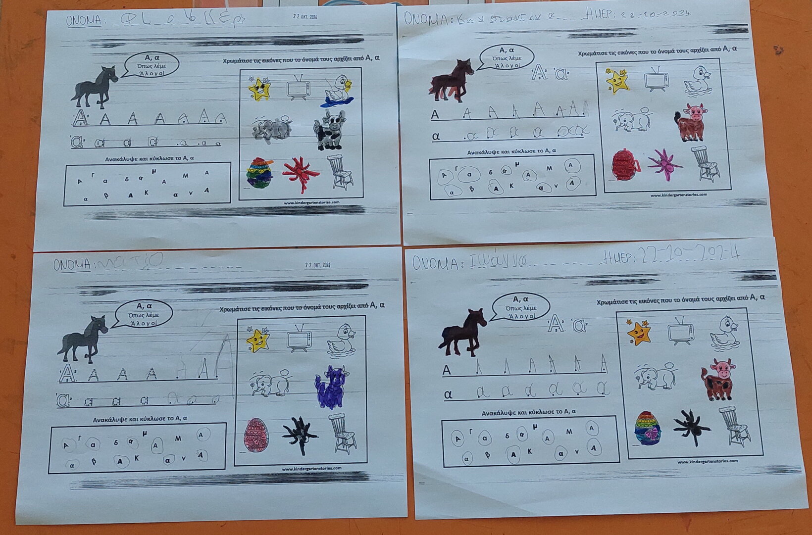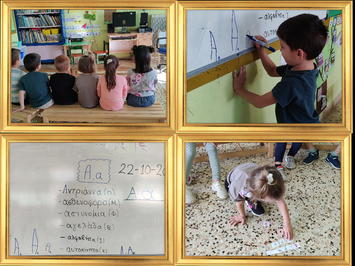 Παρακολουθήσαμε την ιστορία της “Αχτένιστης αγελάδας”, βρήκαμε λέξεις που αρχίζουν από Α,α, γράψαμε το κεφαλαίο Α στον πίνακα και σειροθετήσαμε τα γράμματα της λέξης “Αέρα“.