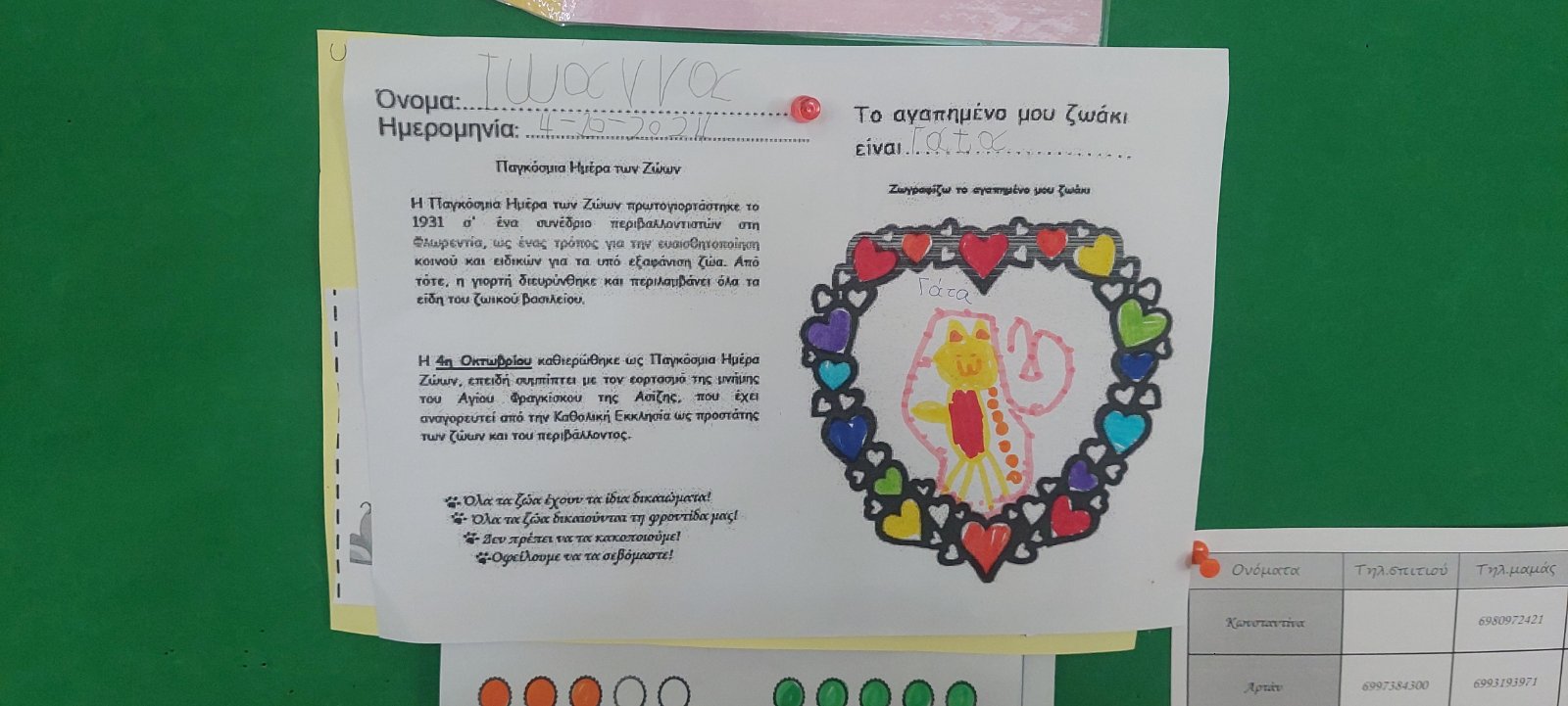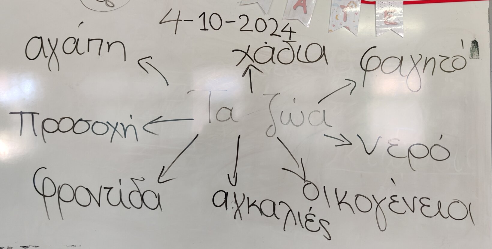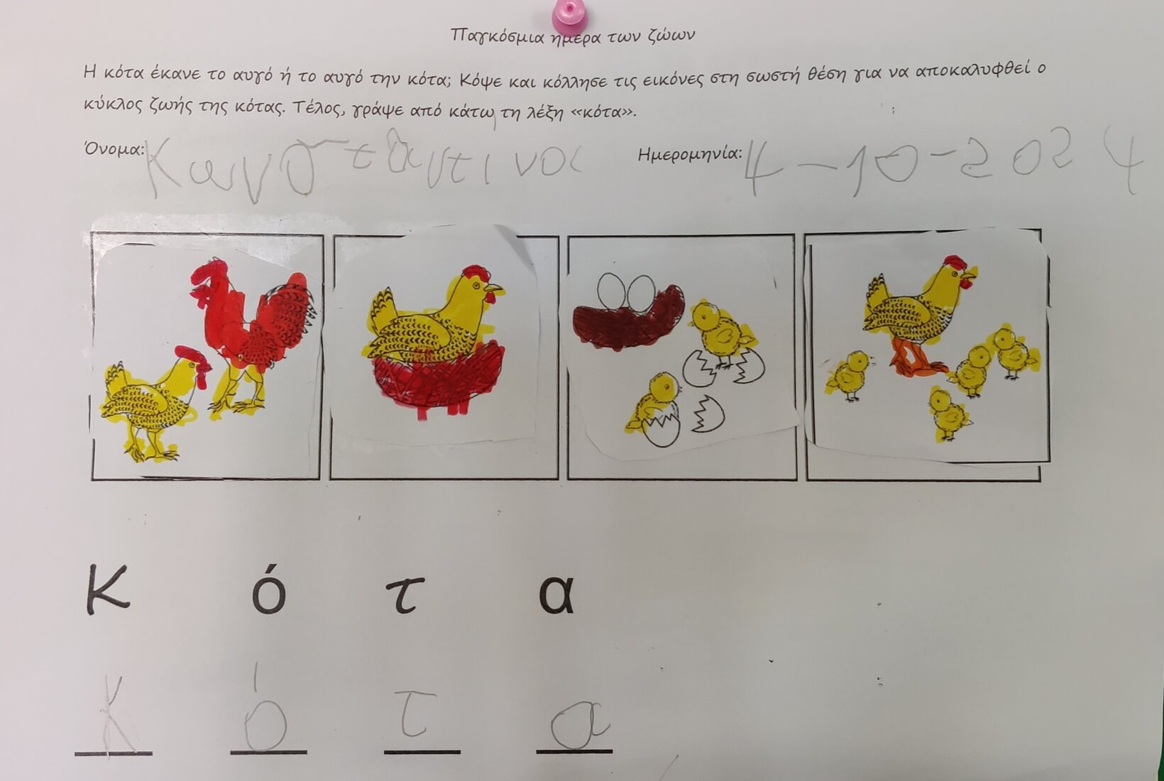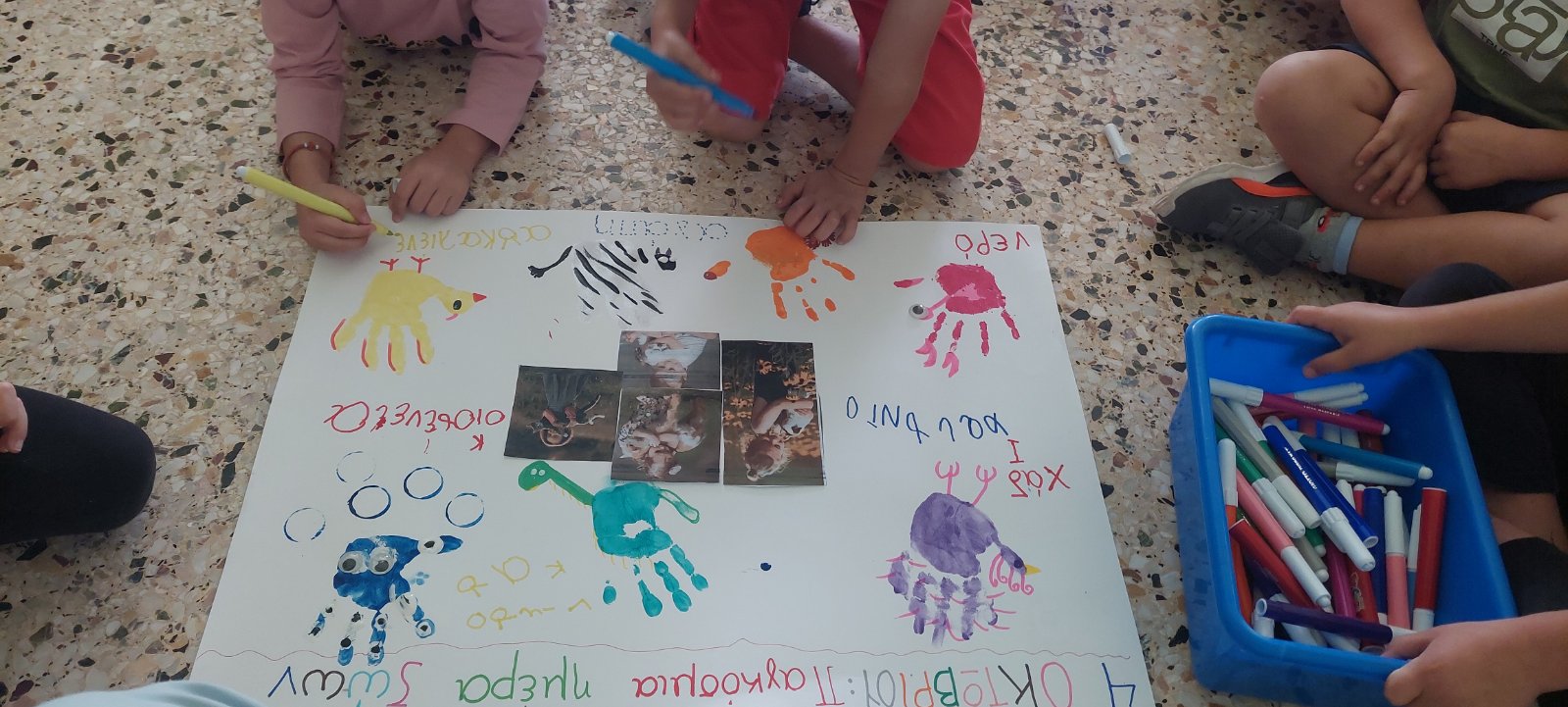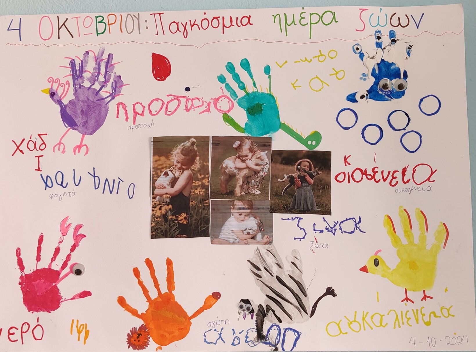 Παρακολουθήσαμε ένα συγκινητικό animation μικρού μήκους για την Pip, ένα κουτάβι που θέλει να γίνει οδηγός τυφλών.Σε ιστόγραμμα καταγράψαμε τις γνώσεις μας για τις ανάγκες των ζώων.Ζωγραφίσαμε το αγαπημένο μας ζώο.Κατασκευάσαμε ένα σκυλίμε γλωσσοπίεστρα και χαρτόνια.Παραστήσαμε τα ζώα και παίξαμε το παιχνίδι “Μάντεψε ποιο ζώο παριστάνω“.Με τις παλάμες μας αποτυπώσαμε διάφορα ζωάκιακαι γράψαμε τι χρειάζονται τα ζωάκια.Ομαδική κατασκευήΕίπαμε ότι και τα ζώα έχουν οικογένειες (φωτογραφία από Ζωή Σταυρακάκη) και αποτυπώσαμε το κύκλο ζωής της κόταςσε φύλλο εργασίας.Με τις παλάμες μας φτιάξαμε μία κότακαι πήραμε στο σπίτι την εξέλιξη του ζώου σε ατομική κατασκευή.