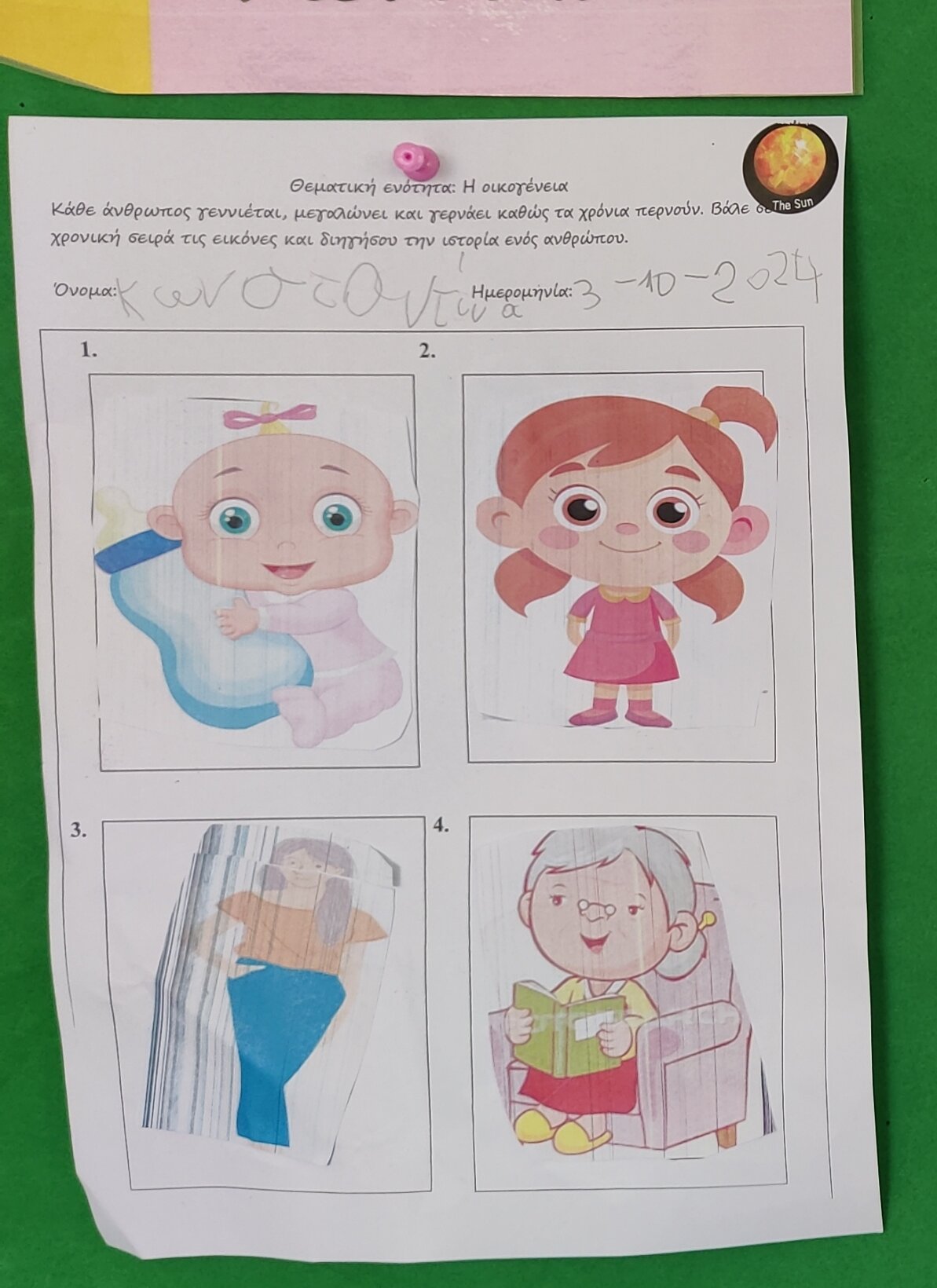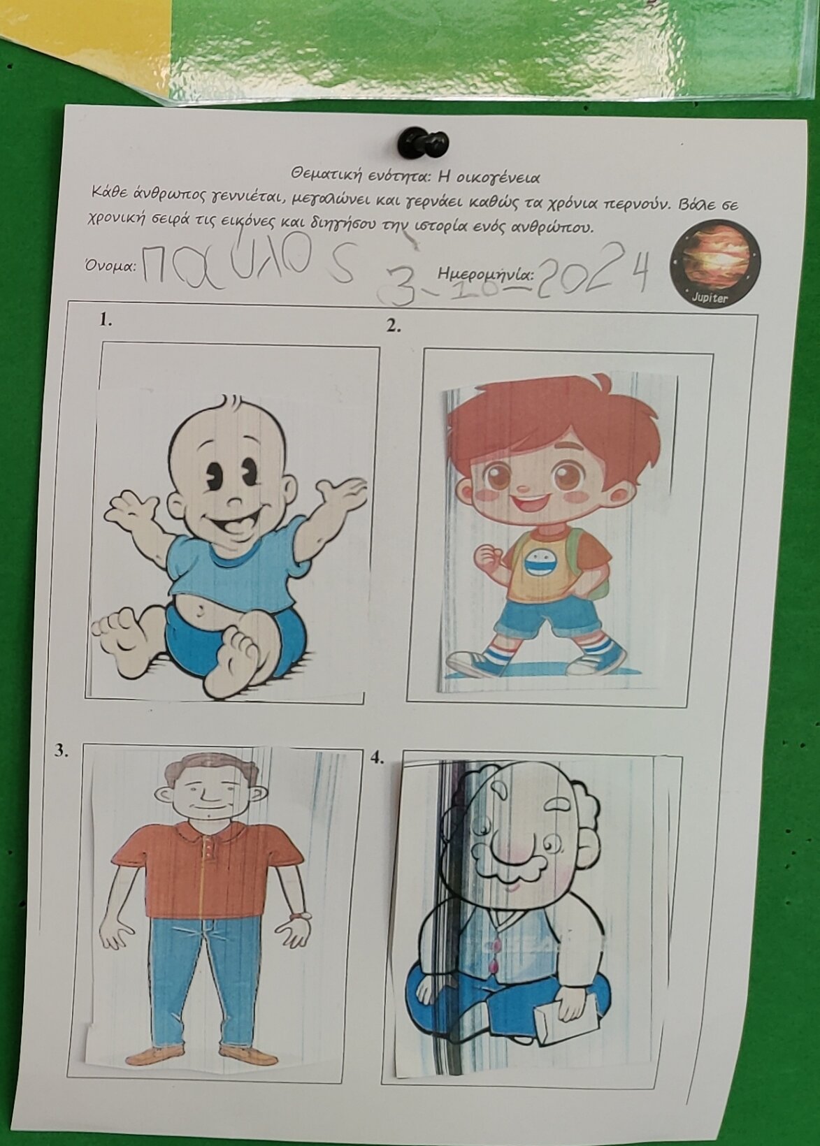 Είδαμε την εξέλιξη στα σώματα των ανθρώπων στα διάφορα ηλικιακά στάδια, από το βιβλίο “Τα σώματα των ανθρώπων“.Συμπληρώσαμε την πορεία της ηλικιακής εξέλιξηςτων αγοριώνκαι των κοριτσιών σε φύλλο εργασίας.ξηφΑπ’ τον τόμο “Άνθρωπος” της Kid-e-pedia, παίξαμε το παιχνίδι με την κρυψώνα του μωρούκαι ήρθαμε σε μία πρώτη επαφή με το ποντίκι του υπολογιστή.