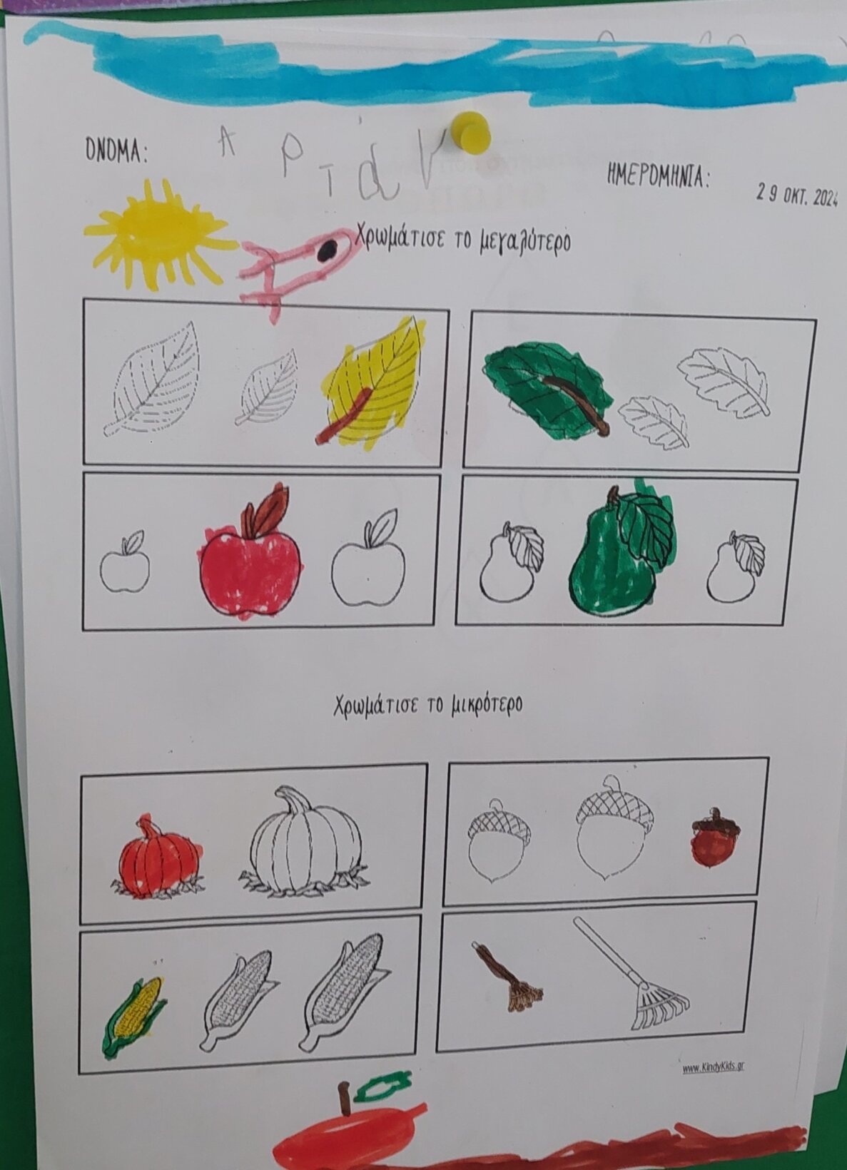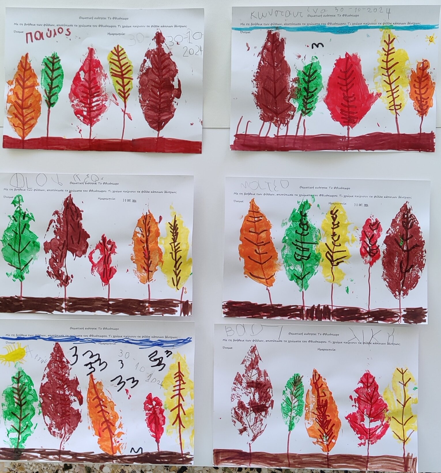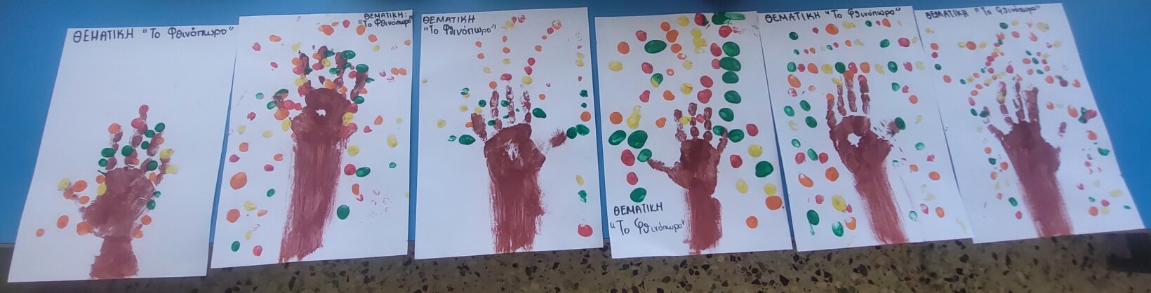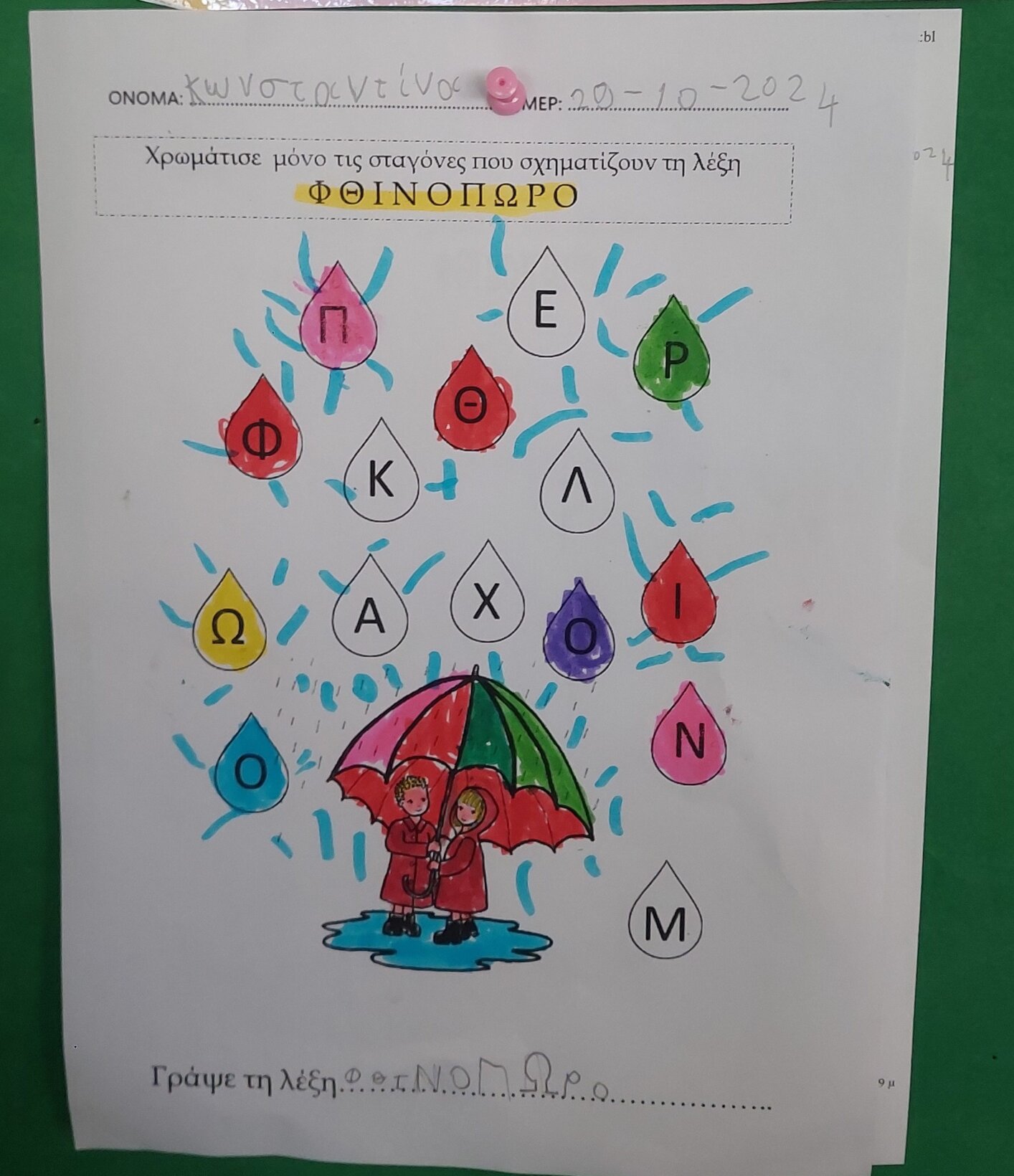 Διαβάσαμε το βιβλίο της Ε. Φακίνου για το Φθινόπωρο.Βάλαμε τα φθινοπωρινά χρώματα στα φύλλα που συγκεντρώσαμε στο διάλειμμα,κάναμε τυπώματα στο χαρτίκαι μετασχηματίσαμε τα φύλλα σε φθινοπωρινά δέντρα.Κάναμε συγκρίσεις μεγεθών.Με την παλάμη μας βάψαμε τον κορμό του δέντρου και με τα δάχτυλα βάψαμε τα φύλλα στα φθινοπωρινά χρώματα.Λύσαμε φθινοπωρινά αινίγματακαι γρίφους.Μιλήσαμε για τα φρούτα και τα λαχανικά του Φθινόπωρου και παίξαμε παιχνίδια μνήμης.Τα δοκιμάσαμε.Τα ζωγραφίσαμε και γράψαμε τις ονομασίες τους με κεφαλαία και πεζά γράμματα.Συμπληρώσαμε τα γράμματα δίπλα στο αρχικό.Μάθαμε τον αριθμό 1τον γράψαμε,τον δείξαμε σε ποσότητα. Ένα αχλάδι.Μία κολοκύθα.Συμπληρώσαμε το φύλλο εργασίας.Μιλήσαμε για τον καιρό του Φθινοπώρου και βρήκαμε τις σταγόνες της βροχής που σχηματίζουν τη λέξη Φθινόπωρο.Τελευταία μέρα του Οκτώβρη, μιλήσαμε για την παγκόσμια ημέρα της αποταμίευσης.Ετοιμάσαμε έναν κουμπαράγια να αποταμιεύουμε τα χρήματά μας.Η κατασκευή μας.