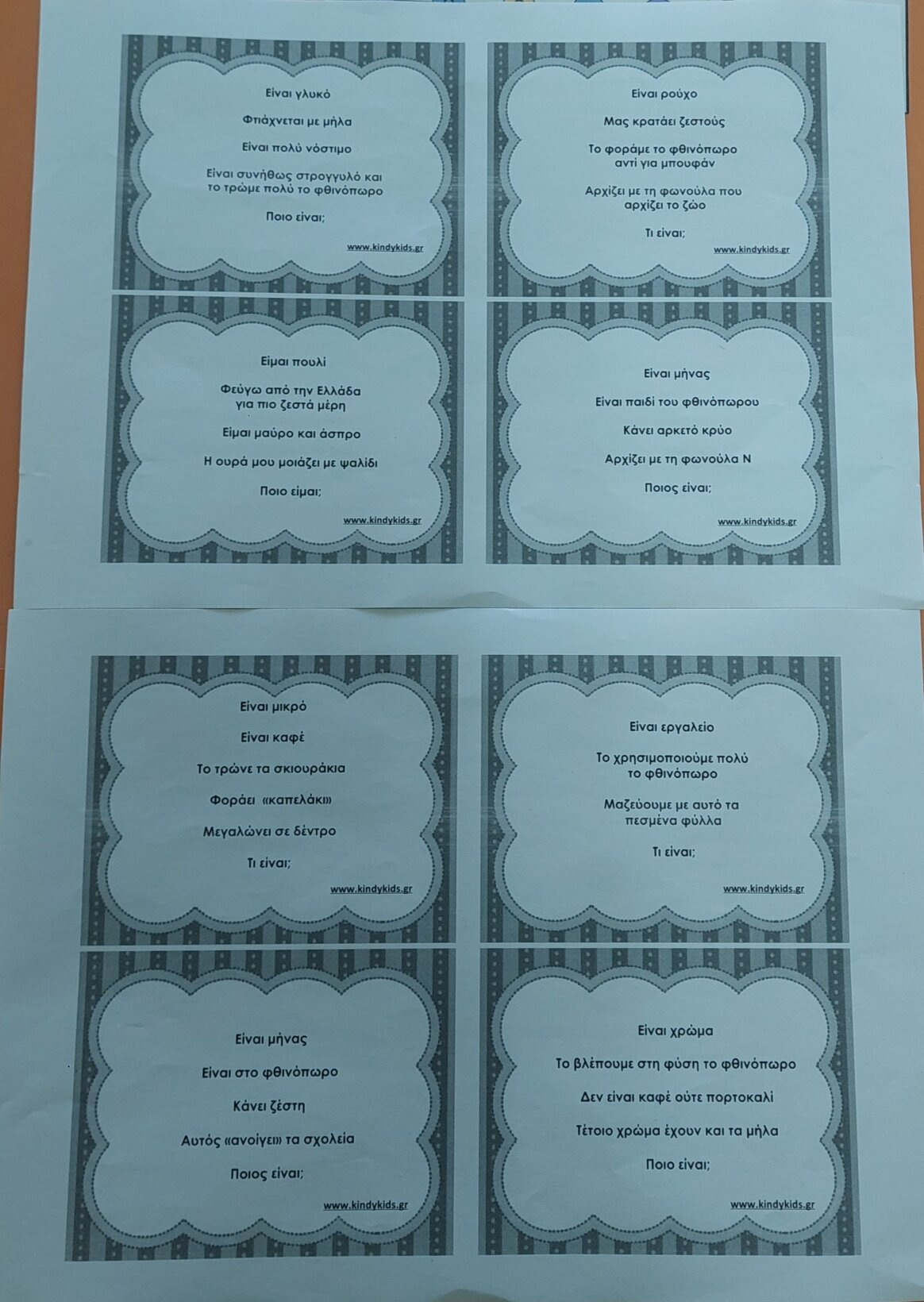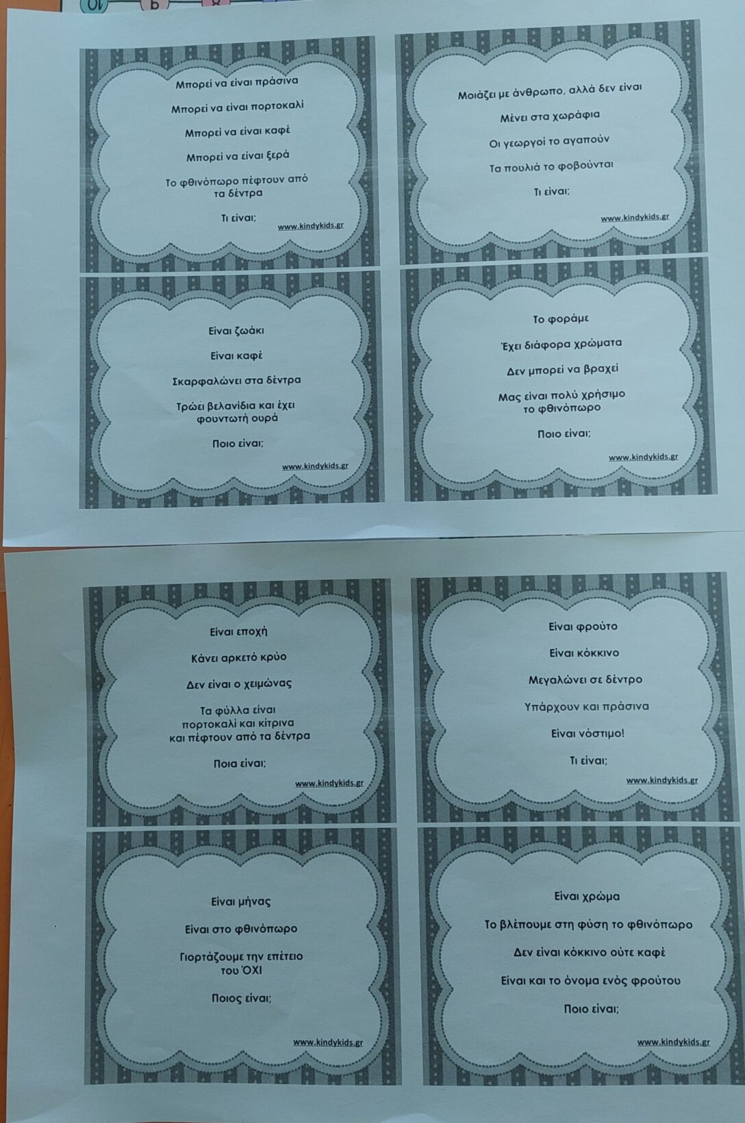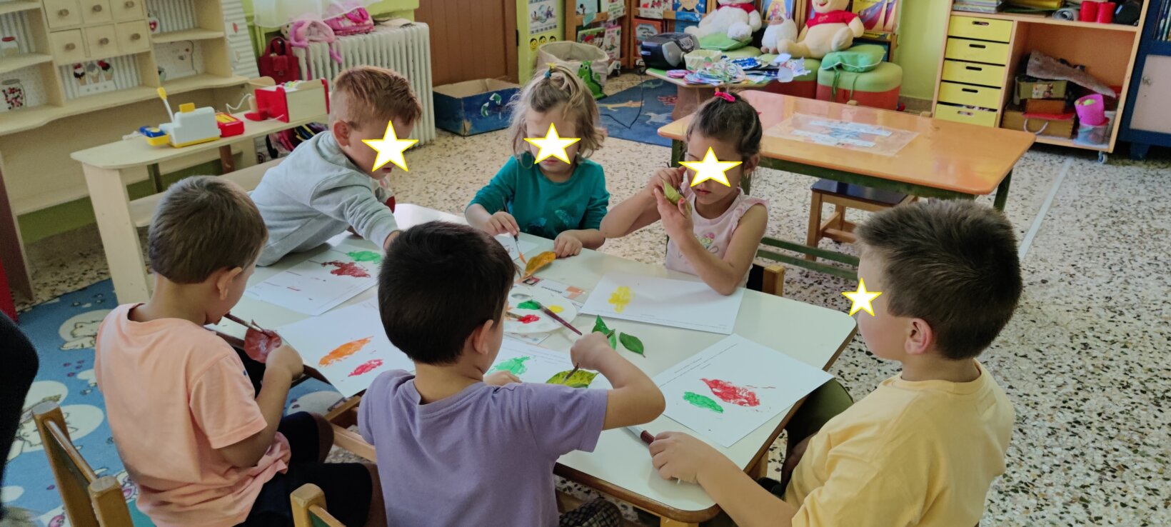 Διαβάσαμε το βιβλίο της Ε. Φακίνου για το Φθινόπωρο.Βάλαμε τα φθινοπωρινά χρώματα στα φύλλα που συγκεντρώσαμε στο διάλειμμα,κάναμε τυπώματα στο χαρτίκαι μετασχηματίσαμε τα φύλλα σε φθινοπωρινά δέντρα.Κάναμε συγκρίσεις μεγεθών.Με την παλάμη μας βάψαμε τον κορμό του δέντρου και με τα δάχτυλα βάψαμε τα φύλλα στα φθινοπωρινά χρώματα.Λύσαμε φθινοπωρινά αινίγματακαι γρίφους.Μιλήσαμε για τα φρούτα και τα λαχανικά του Φθινόπωρου και παίξαμε παιχνίδια μνήμης.Τα δοκιμάσαμε.Τα ζωγραφίσαμε και γράψαμε τις ονομασίες τους με κεφαλαία και πεζά γράμματα.Συμπληρώσαμε τα γράμματα δίπλα στο αρχικό.Μάθαμε τον αριθμό 1τον γράψαμε,τον δείξαμε σε ποσότητα. Ένα αχλάδι.Μία κολοκύθα.Συμπληρώσαμε το φύλλο εργασίας.Μιλήσαμε για τον καιρό του Φθινοπώρου και βρήκαμε τις σταγόνες της βροχής που σχηματίζουν τη λέξη Φθινόπωρο.Τελευταία μέρα του Οκτώβρη, μιλήσαμε για την παγκόσμια ημέρα της αποταμίευσης.Ετοιμάσαμε έναν κουμπαράγια να αποταμιεύουμε τα χρήματά μας.Η κατασκευή μας.