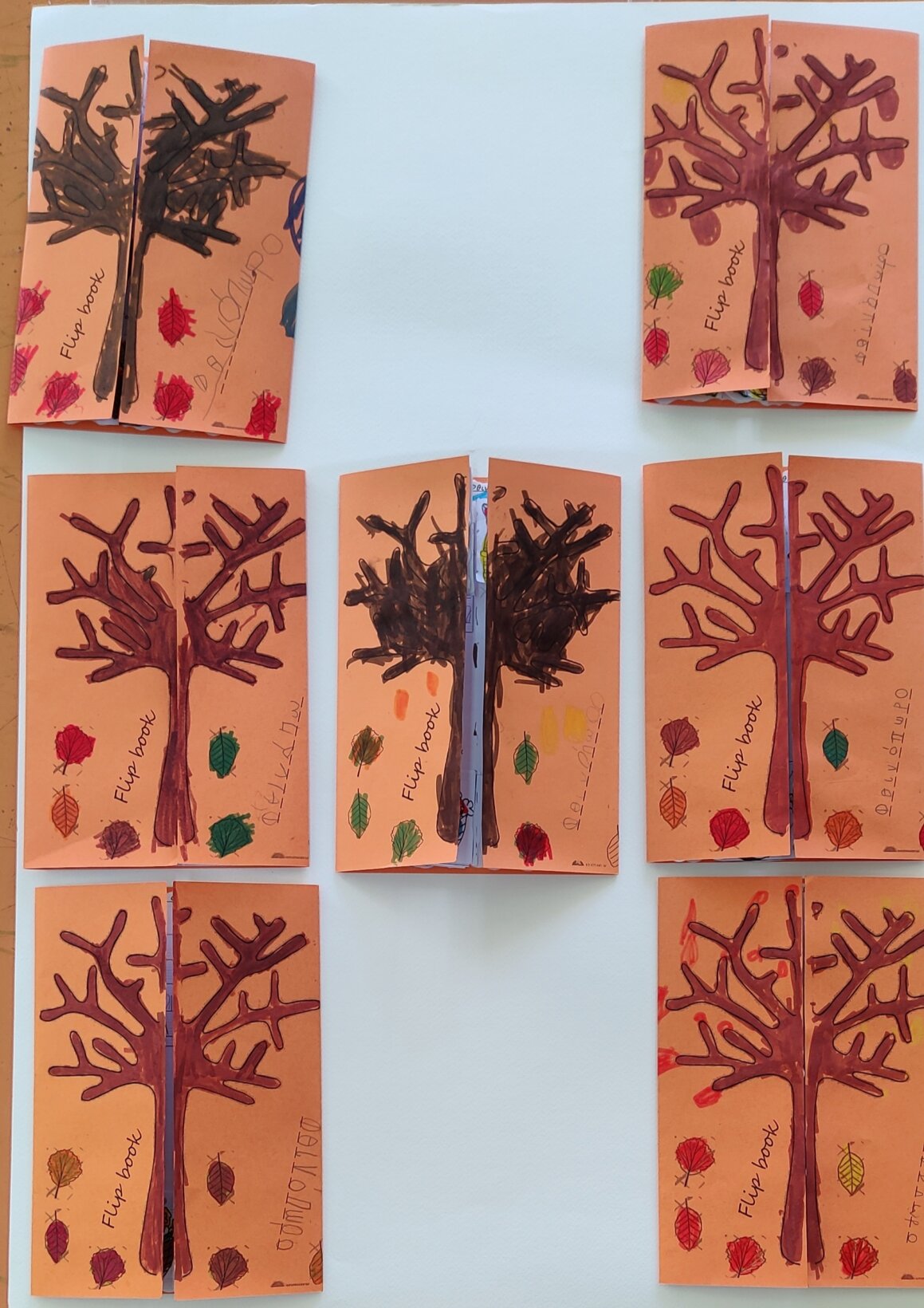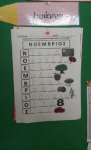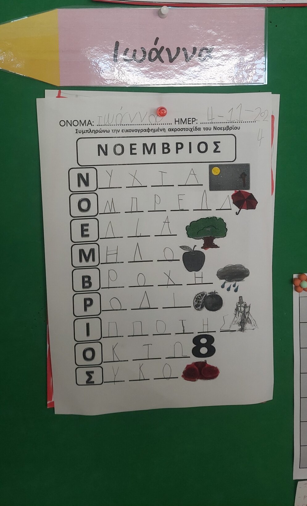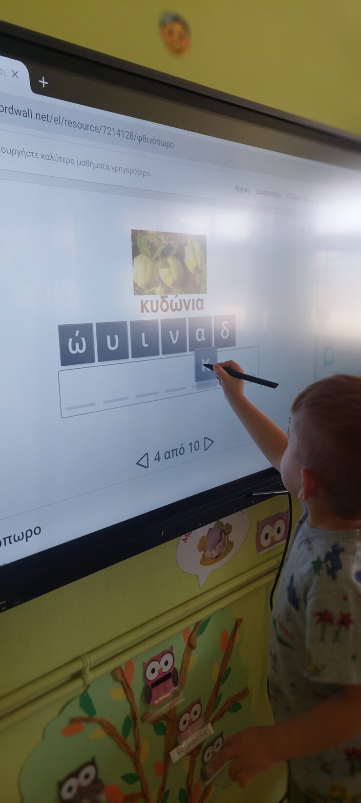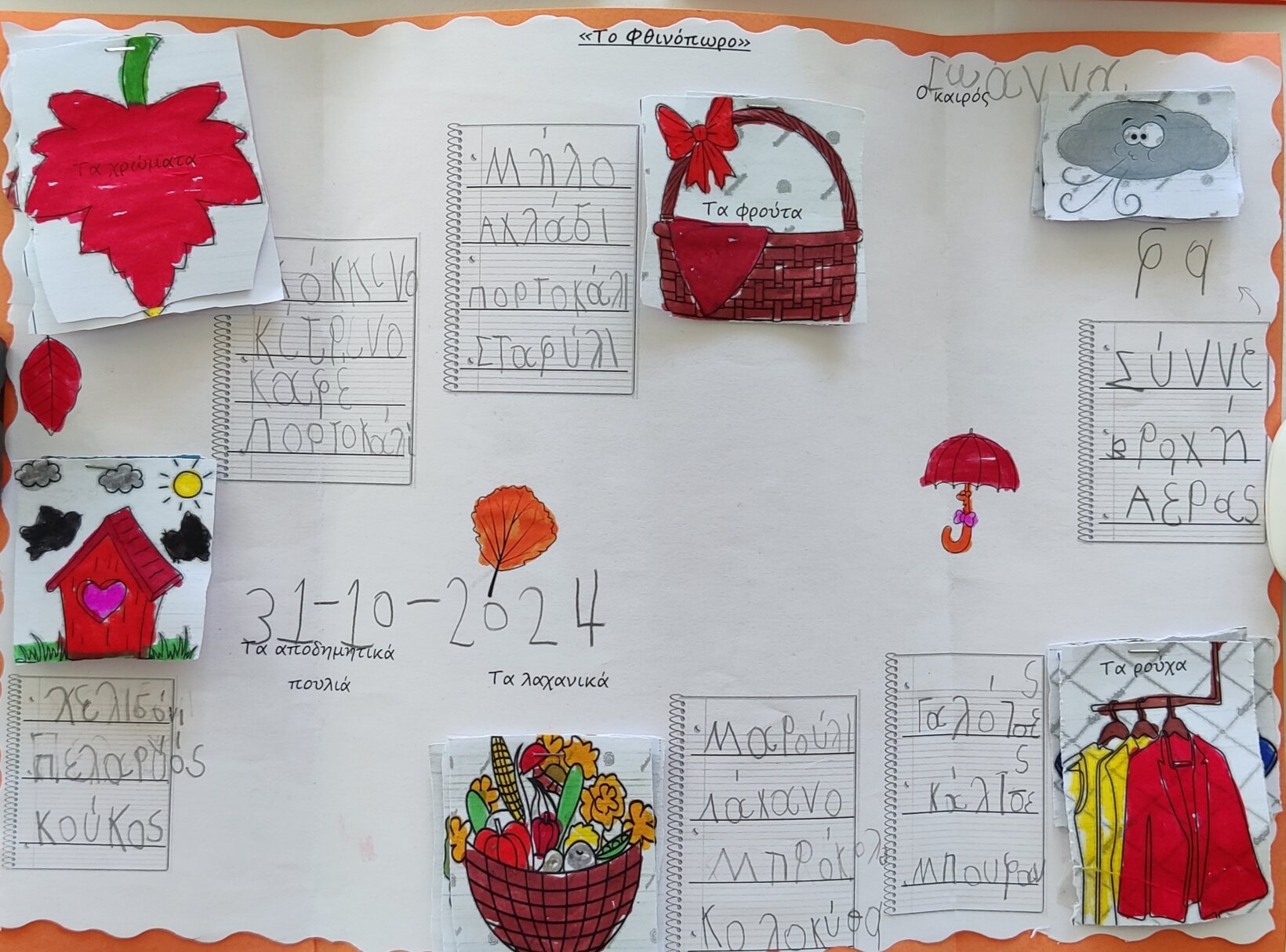 Κόψαμε, κολλήσαμε,γράψαμε, ζωγραφίσαμεκαι φτιάξαμε ένα flip book με όσα μάθαμε για το Φθινόπωρο.Το εσωτερικό του βιβλίου.Συνθέσαμε στον διαδραστικό πίνακα τη λέξη “Φθινόπωρο”,Σειροθετήσαμε σωστά τα γράμματαπου συνθέτουν τα φθινοπωρινά φρούτακαι αντιστοιχήσαμε τις λέξεις με αυτές των καρτέλων αναφοράς.ηΚατασκευάσαμε ένα φθινοπωρινό φρούτοπου αρέσει ακόμα και στα σκουλήκια.Κολλήσαμε φύλλα στην ουρά των σκίουρων και γράψαμε το όνομά τους.Συμπληρώσαμε την ακροστοιχίδα του Νοέμβρη.