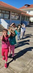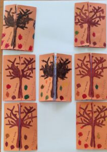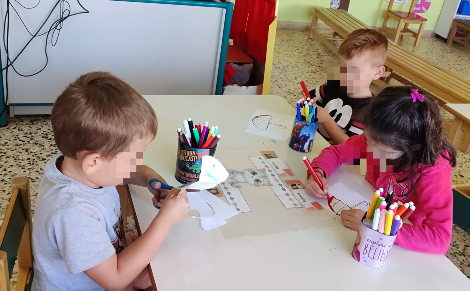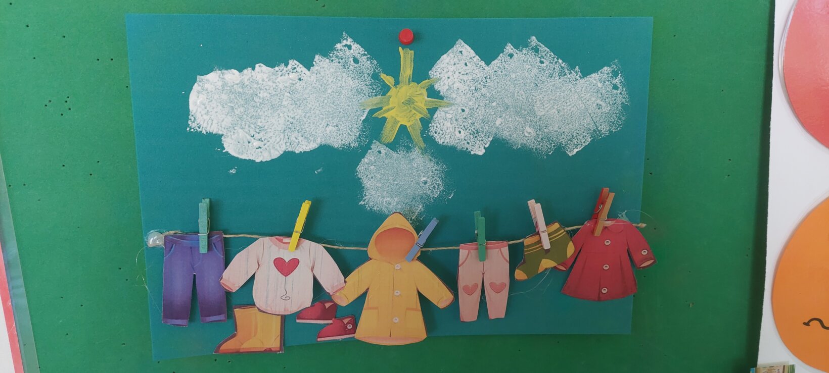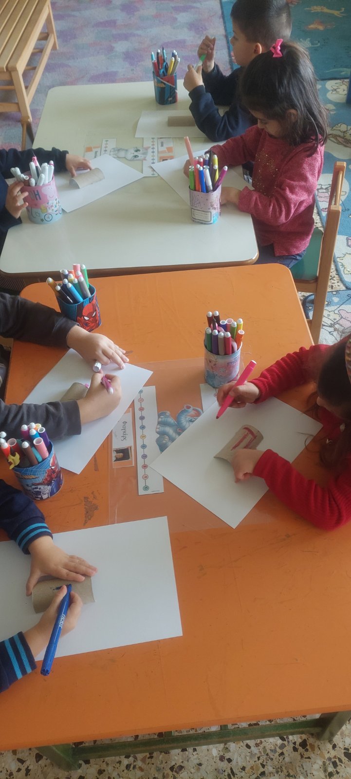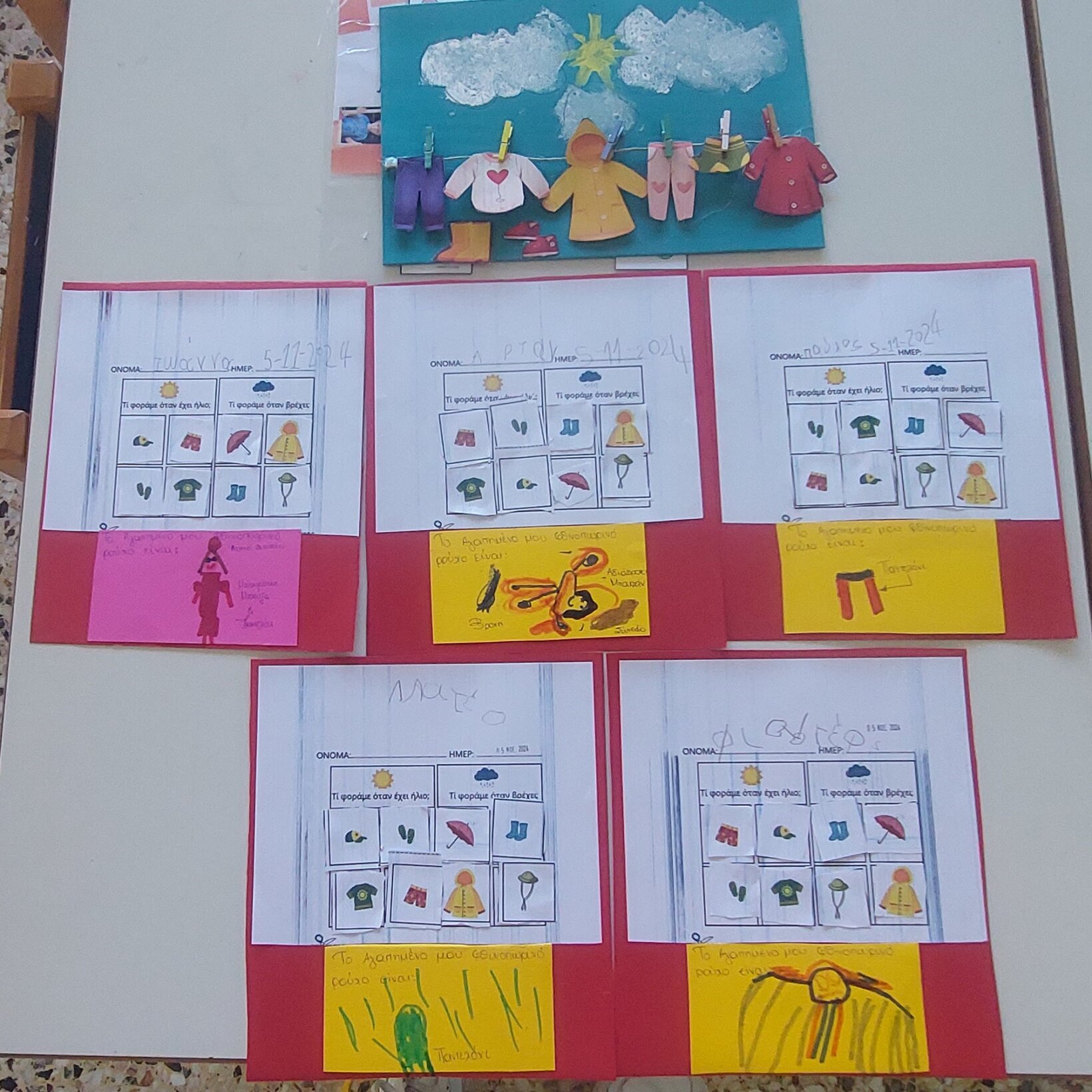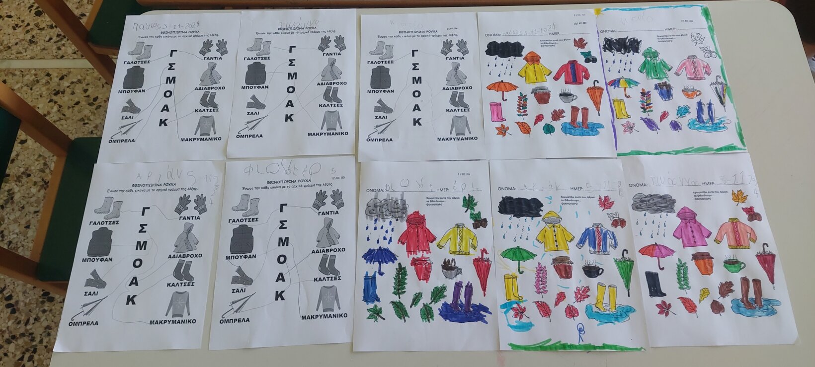 Ρίξαμε το ζάρι και αφηγηθήκαμε την ιστορία,ανάλογα με τον ήρωα του παραμυθιού που τύχαινε στον καθένα μας.Κόψαμε και κολλήσαμετα ρούχα του Φθινοπώρουκαι ζωγραφίσαμε το αγαπημένο μας.Αντιστοιχήσαμε το καθένα με το αρχικό του γράμμα.Ζωγραφίσαμε τις ομπρελίτσες μας, κόψαμε, κολλήσαμε,και γράψαμε: “Την ομπρέλα μου κρατώ και σιγοτραγουδώ”.