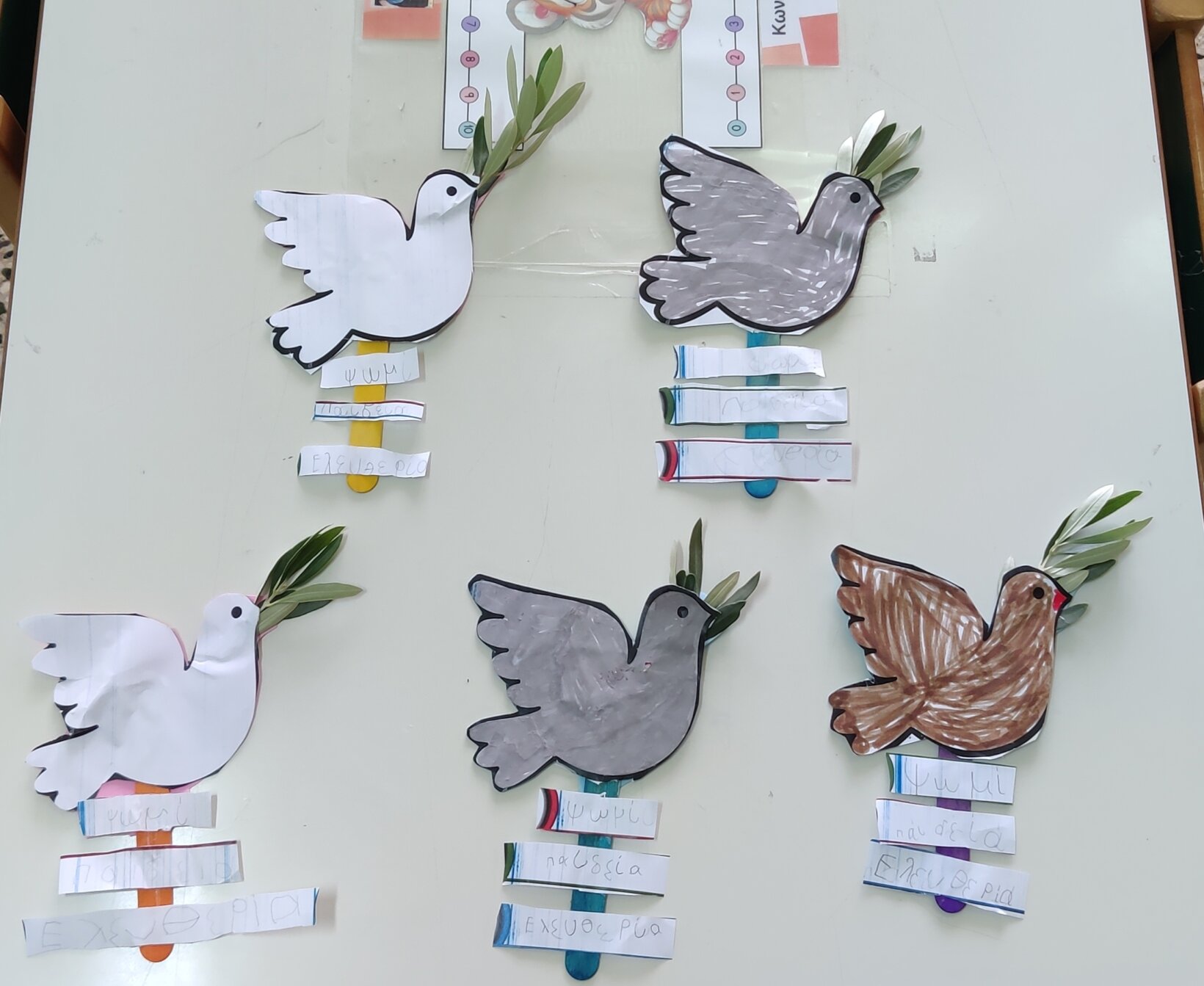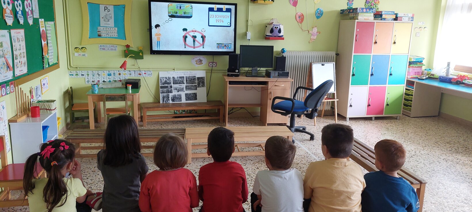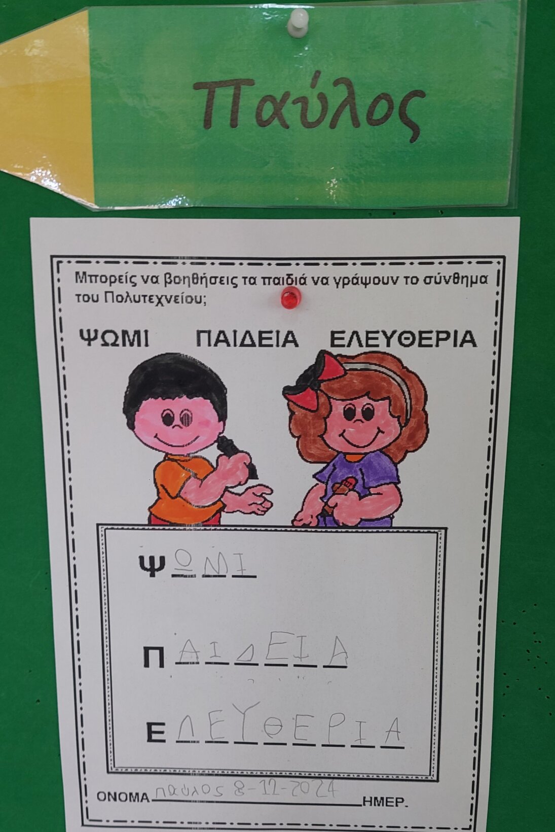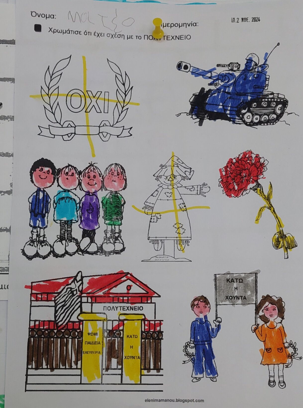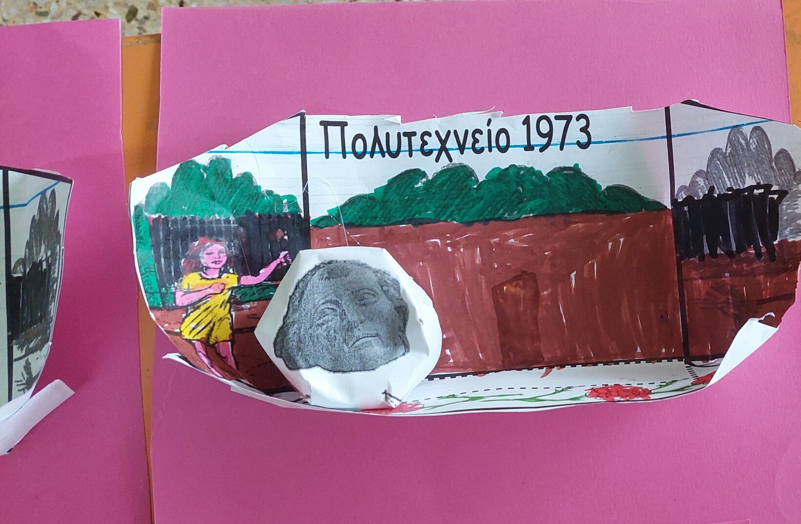 Βρήκαμε εικόνες από την περίοδο του Πολυτεχνείου καιδημιουργήσαμε έναν πίνακα αναφοράς.Μέσα από παρουσίαση του powerpoint, μάθαμε κάποια σημαντικά γεγονότα της περιόδου πριν την εξέγερση του Πολυτεχνείου.Σε παιδαγωγικό υλικό παρακολουθήσαμε σημαντικές πτυχές της ιστορίας.Διαβάσαμε για την εξέγερση του Πολυτεχνείου απ’ το βιβλίο του Φίλιππου Μανδηλαρά.Διαβάσαμε το βιβλίο “Η κυρά Δημοκρατία” και αναφέραμε τις διαφορές ανάμεσα στο πολίτευμα της Δημοκρατίας και της Δικτατορίας.Φιλοτεχνήσαμε τις δύο ηρωίδες του βιβλίου.Ταξινομήσαμε διάφορες εικόνες,ανάλογα με το πολίτευμα στο οποίο μπορούμε να τις συναντήσουμε (Δημοκρατία/Δικτατορία).Εντοπίσαμε ποιοι είναι οι βοηθοί της δικτατορίας.Κατασκευάσαμε το Πολυτεχνείο.Ατομικές κατασκευέςΗ κεφαλή έξω απ’ το Πολυτεχνείο.Τρισδιάστατη ατομική κατασκευήΚατασκευάζοντας και το ερπυστριοφόρο τεθωρακισμένο όχημα μάχηςχρησιμοποιώντας ανακυκλώσιμα υλικά.Δημιουργήσαμε μία ομαδική κατασκευήγράφοντας το σύνθημα “Ψωμί-παιδεία-ελευθερία“.Φτιάξαμε το περιστέρι της Ειρήνης και γράψαμε τις λέξεις του συνθήματος (ατομική κατασκευή).Το γράψαμε σε φύλλο εργασίας,στον ασπροπίνακα.και το συνθέσαμε, κολλώντας ένα ένα τα γράμματατα γράμματα μέχρι να δημιουργηθούν οι λέξεις.Διαβάσαμε το βιβλίο της Σ. Ζαραμπούκα “Στο δάσος“.Με αφορμή την ιστορία του, αποφασίσαμε να κάνουμε εκλογές και να ψηφίσουμεποιο είναι το αγαπημένο μας ζώο του δάσους. Κρυφτήκαμε πίσω απ’ το παραβάν,διαλέξαμε το ψηφοδέλτιο με το ζώο που αγαπάμε, το ρίξαμε στην κάλπη και καταμετρήσαμε τις ψήφους μας.Αγαπημένο ζώο του δάσους για την πλειοψηφία των παιδιών, μετά από 2ο γύρο εκλογών, αναδείχτηκε η καφέ αρκούδα.Κάναμε αντιστοιχήσειςΓράψαμε με τη λειτουργική γραφή λέξεις που σχετίζονται με το Πολυτεχνείο.ποσότητας και αριθμού.Γράψαμε το σύνθημα των φοιτητών, περάσαμε μέσα από λαβύρινθο για να βρεθούμε στο Πολυτεχνείο και συμπληρώσαμε φύλλα εργασίας.Το σύνθημαΛαβύρινθοςΤραγουδήσαμε το “Τα παιδιά ζωγραφίζουν στον τοίχο” και το απεικονίσαμε.Αποδώσαμε καλλιτεχνικά και το τραγούδι:“Ο δρόμος είχε τη δική του ιστορία”.Απαντήσαμε τις ερωτήσεις σε quiz γνώσεων,αλλά και σε παιχνίδι ταύτισης λέξεων στο διαδραστικό πίνακα.Σχηματίσαμε με την πλαστελίνη μας τα κάγκελα του Πολυτεχνείου.Διαχωρίσαμε τις σχετικές εικόνες με το Πολυτεχνείο, με τις μη σχετικές.Προγραμματίσαμε τη μέλισσα Bee να επισκεφθεί το Πολυτεχνείο στην ειδική πίστα,να αφήσει ένα γαρύφαλλο στην κεφαλή που έχει συνδεθεί με τους αδικοχαμένους φοιτητές και να συμμετέχει στην βραδινή πορεία.Δημιουργήσαμε τη δική μας αφίσα.Ζωγραφίσαμε και κόψαμε κόκκινα γαρίφαλλαμε τις παλάμες μας φτιάξαμε περιστέρια και γράψαμε την ημερομηνία της εξέγερσης του Πολυτεχνείου.Παρακολουθήσαμε σε κουκλοθέατρο την “Ντενεκεδούπολη” και αφηγηθήκαμε τι μας άρεσε, τι όχι και τι μας θύμισαν οι ήρωες της ιστορίας.