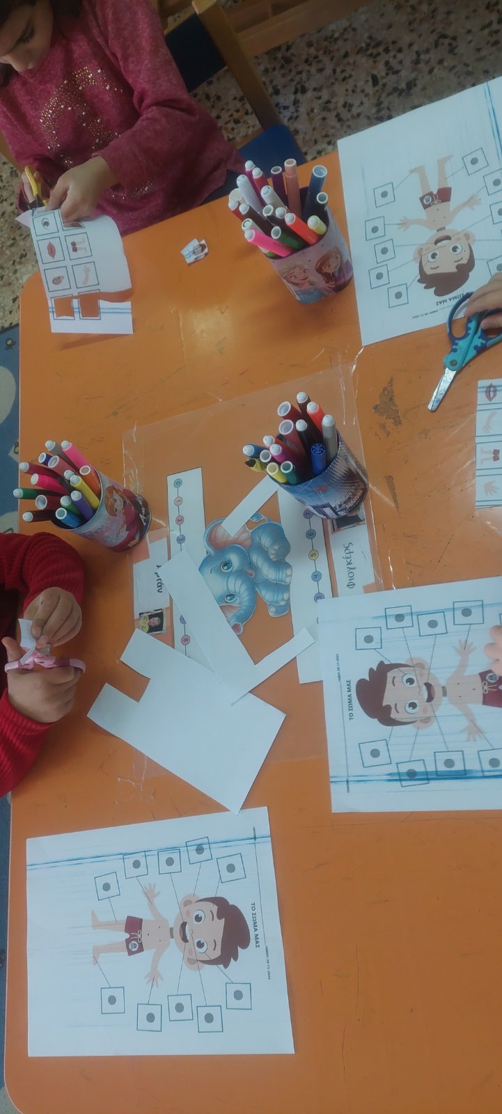 Είδαμε ένα εκπαιδευτικό βίντεο για το ανθρώπινο σώμα.και καλέσαμε στην τάξη τον φίλο μας το Μάκη για να μας βοηθήσει να δούμε το εσωτερικό του.Με ρολό υγείας, κατασκευάσαμε το ανθρώπινο σώμακαι προσθέσαμε με μαρκαδόρους τα μέρη του.Συμπληρώσαμε φύλλα εργασίας.Χορέψαμε το μουσικοκινητικό τραγούδι “Κεφάλι, ώμοι, γόνατα και πόδια“.Μιλήσαμε για το πεπτικό σύστημα του ανθρώπου και τα όργανα που το απαρτίζουν.Κατόπιν, κολλήσαμε τα όργανα στο σώμα.Διαβάσαμε το υπέροχο βιβλίο της Anna Raselmanκαι προσπαθήσαμε να αναδιηγηθούμε την ιστορία,σειροθετώντας τις σελίδες του.Μπήκαμε στην πλατφόρμα του Αισώπου που χρησιμοποιεί τις δυνατότητες των ΤΠΕ προκειμένου να παρουσιάσει το ανθρώπινο σώμα και τις λειτουργίες του με απλό αλλά επιστημονικό τρόπο στους μικρούς μαθητές, απαντήσαμε στις ερωτήσεις του κ. Σωστού,και παίξαμε ένα παιχνίδι για τα στάδια ανάπτυξης του ανθρώπου.