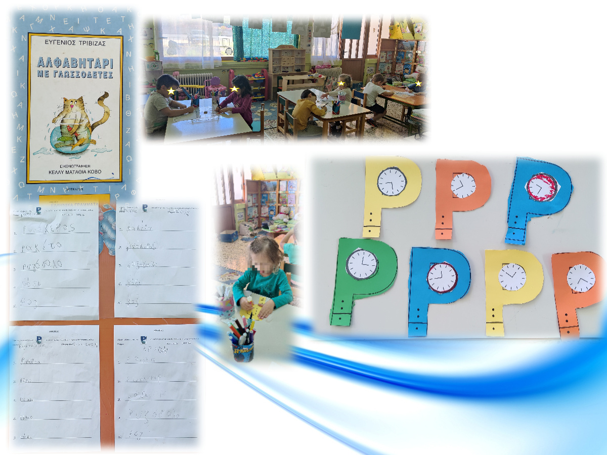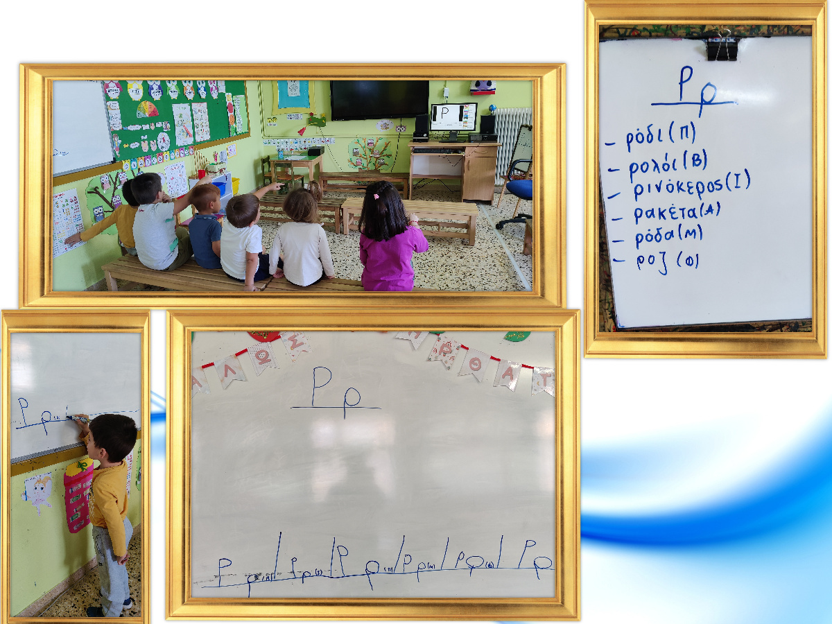 Σχηματίσαμε με το δείκτη μας το γράμμα Ρ, βρήκαμε λέξεις που αρχίζουν από αυτό και το γράψαμε στον πίνακα.Εντοπίσαμε στον υπολογιστή εικόνες που αρχίζουν από αυτό και το γράμμα ανάμεσα σε άλλα, ψάξαμε να βρούμε λέξεις στις καρτέλες της γραφής και τις γράψαμε.Μάθαμε τον γλωσσοδέτη του ρινόκερου που χορεύει ροκ εντ ρολ, κατασκευάσαμε ένα ρολόι και γράψαμε το γράμμα και λέξεις που αρχίζουν από αυτό, απ’ τη γωνιά της γραφής.Διαβάσαμε την ιστορία του Νοέμβριου απ’ το βιβλίο “Τα παιδιά του Φθινόπωρου”.Ο κ. Γιώργος ο γείτονάς μας, αφού εκδηλώσαμε χαρά με την κολοκύθα που είχε στον κήπο του, αποφάσισε να μας τη δωρίσει.Βάλαμε λοιπόν λαχανικά και γαλακτοκομικά προϊόντα στο μπολ, προσθέσαμε την κολοκύθα τριμμένη και αλεύρι,τα ανακατέψαμε, βάλαμε με το κουτάλι μας σε λαδωμένο ταψίκαι φουρνίσαμε τους Κολοκυθοκεφτέδες μας για να γευτούμε και τα φθινοπωρινά λαχανικά.