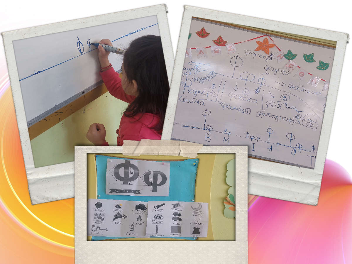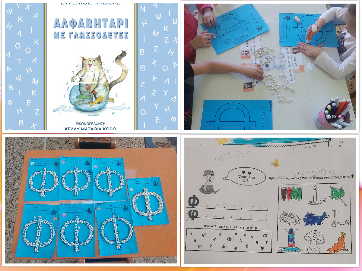 Γράψαμε το γράμμα στον πίνακα, βρήκαμε λέξεις που αρχίζουν από αυτό και τις κρεμάσαμε στον πίνακα στη γωνία της γραφής.Μάθαμε το γλωσσοδέτη με το φοβητσιάρικο φίδι, κολλήσαμε φασόλια στο χαρτόνι, σχηματίσαμε το κεφαλαίο Φ και συμπληρώσαμε το φύλλο εργασίας.