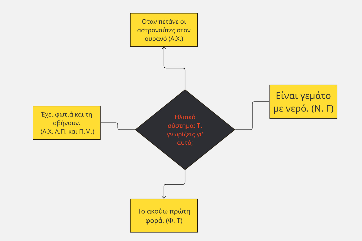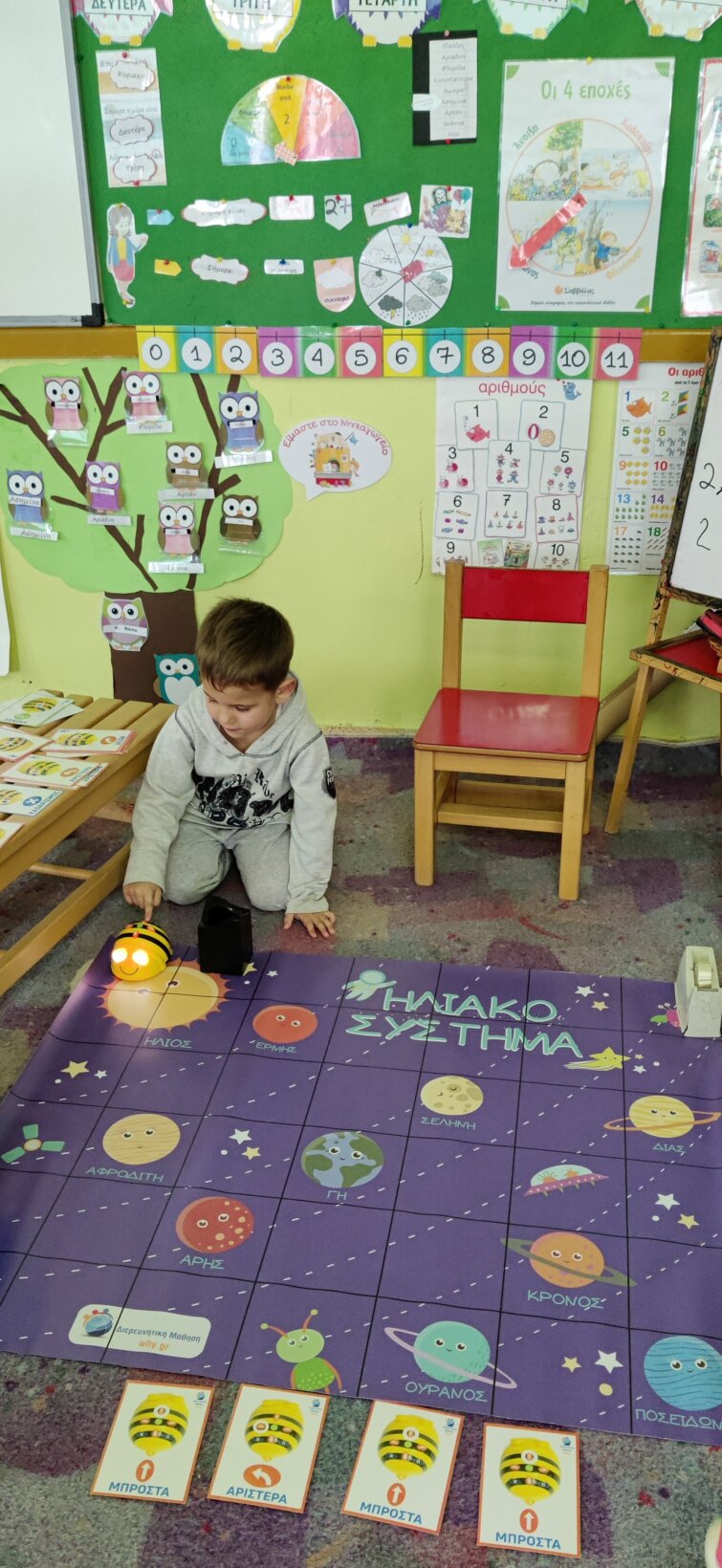 και τις καταγράψαμε σε εννοιολογικό χάρτη.2.Τοποθετήσαμε σε διαφορετικά σημεία της τάξης κάρτες με εικόνες από πλανήτες του ηλιακού συστήματος.Τα παιδιά έγιναν ζευγάρια βρίσκοντας το παιδί με την ίδια φωτογραφία, υπό τον ήχο γνωστών κομματιών του Μότσαρτ.