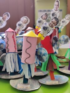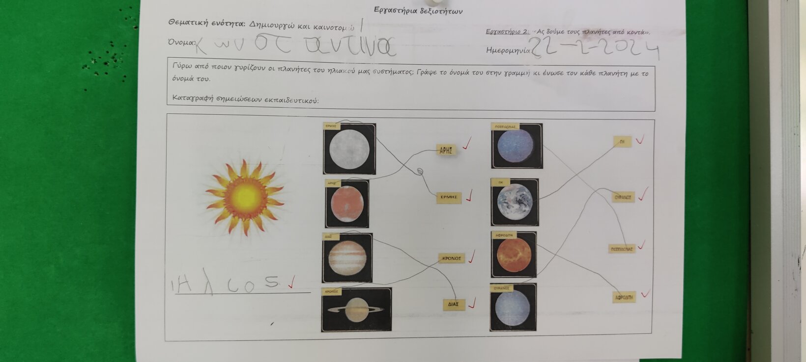 και παρατηρήσαμε από το τηλεσκόπιο τον κρυμμένο πλανήτη.3. Βάψαμε ρολά υγείαςκαι φτιάξαμε τον δικό μας πύραυλο με απλά υλικά.Η κατασκευή μας.4. Ενώσαμε τον κάθε πλανήτη με το όνομά τουκαι γράψαμε το όνομα του μεγαλύτερου αστεριού του ηλιακού μας συστήματος.