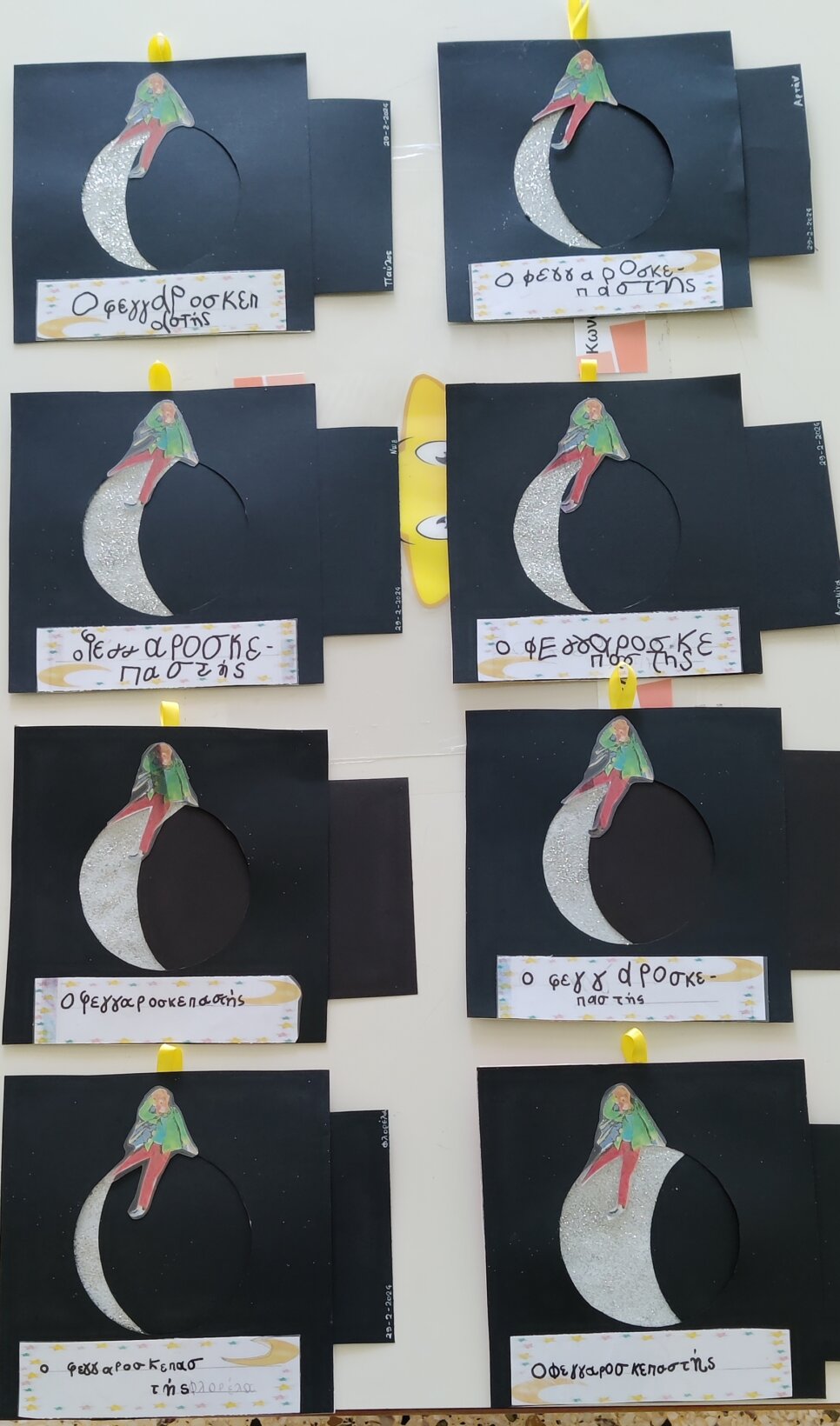 μαντέψαμε την εξέλιξη της ιστορίας και είδαμε τις φάσεις της Σελήνης.3. Μάθαμε τις φάσεις της Σελήνης – ονομασίες.Τις ζωγραφίσαμε καιγράψαμε δύοαπό τις ονομασίες τους.4. Κάναμε μία κατασκευήγια τον Φεγγαροσκεπαστήκαι τις φάσεις της Σελήνης.