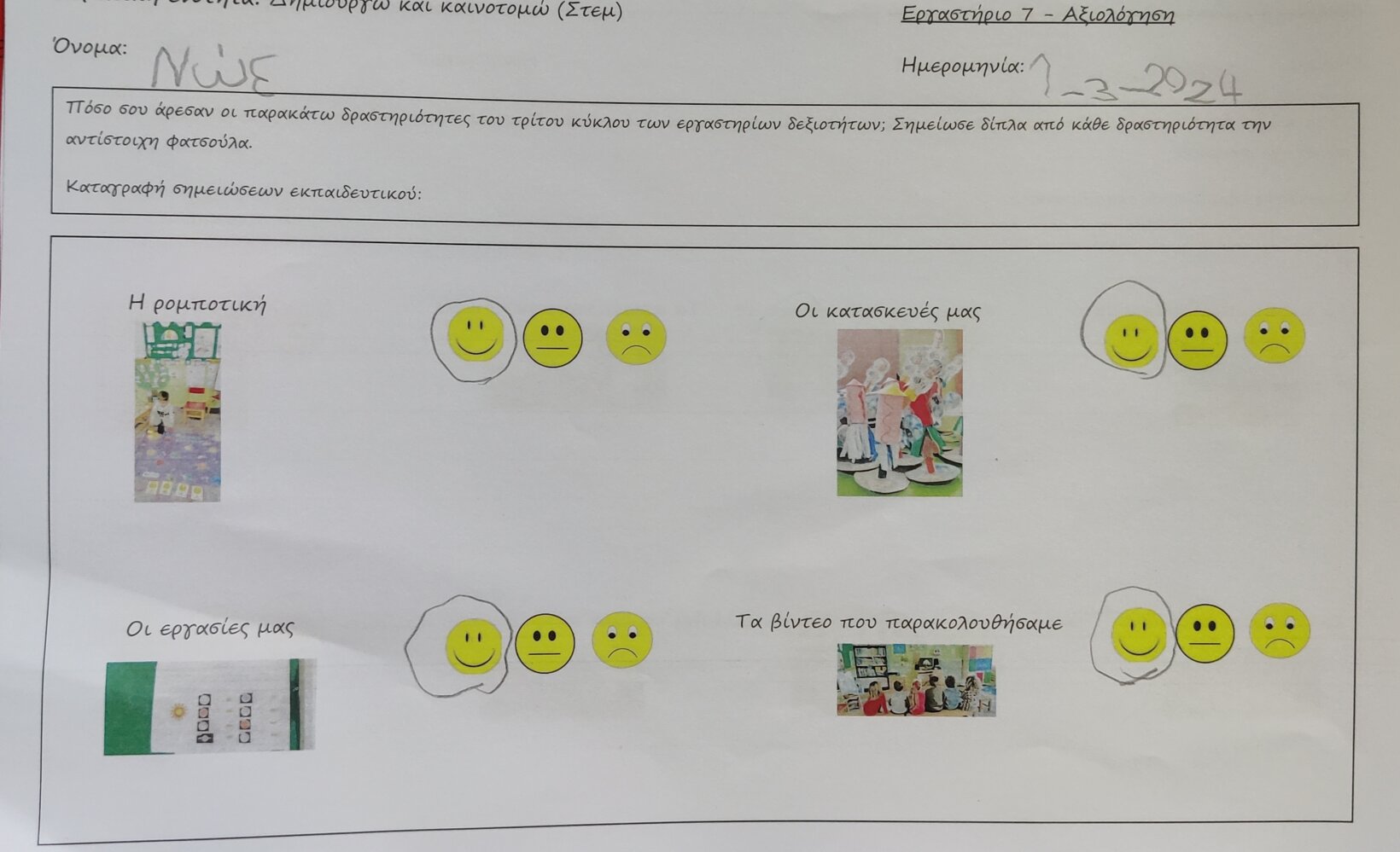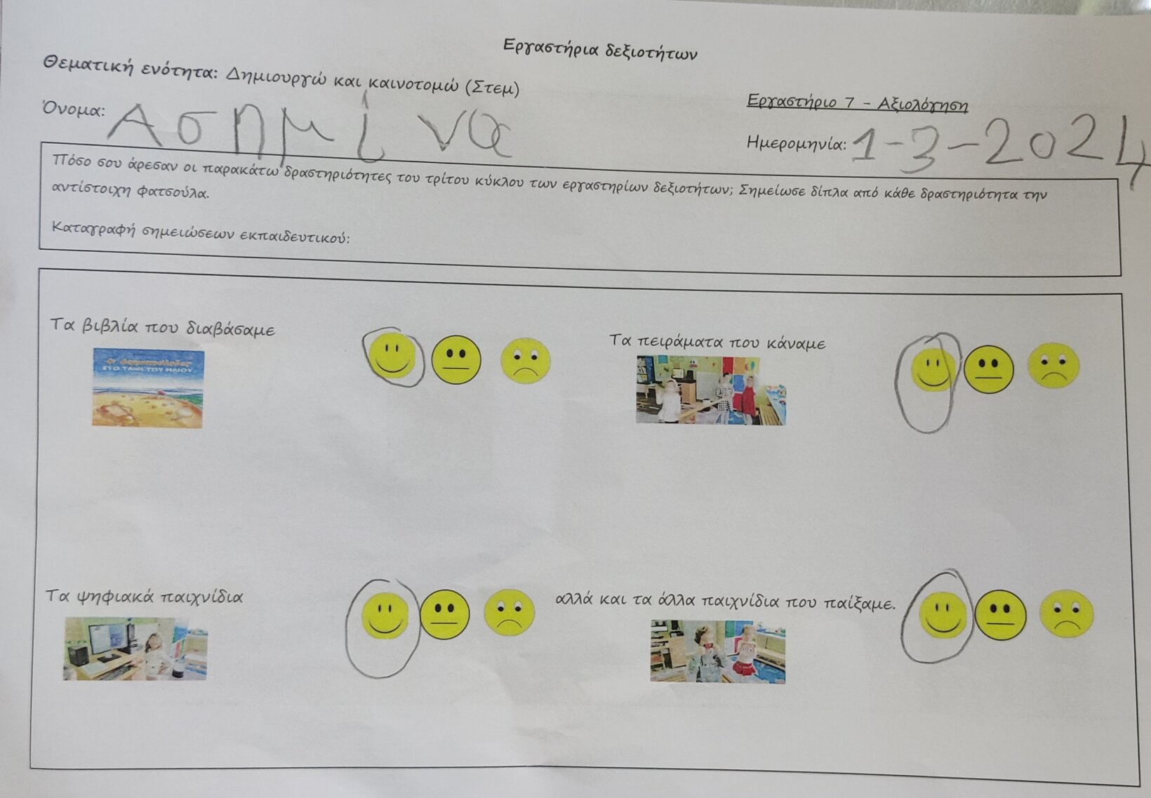 1. Συμπληρώσαμε δύο σελίδες αξιολόγησης για να καταγραφούντα ενδιαφέροντα και οι τάσεις του δείγματος της τάξης στη θεματική που αναδείξαμε.2. Ρωτήσαμε πάλι όπως και στις αρχές του εργαστηρίου τι γνωρίζουν για το Ηλιακό σύστημα καταγράψαμε τις απαντήσεις και συγκρίναμε.3. Επισκεφτήκαμε το Πλανητάριο στο Ίδρυμα Ευγενίδου στην Αθήνα.Παρακολουθήσαμε την προβολή ” Ο μαγικός πλανήτης” και θυμηθήκαμε πολλά από αυτά που μάθαμε στο εργαστήριο δεξιοτήτων.