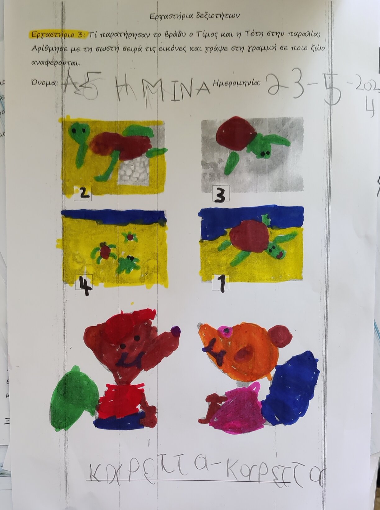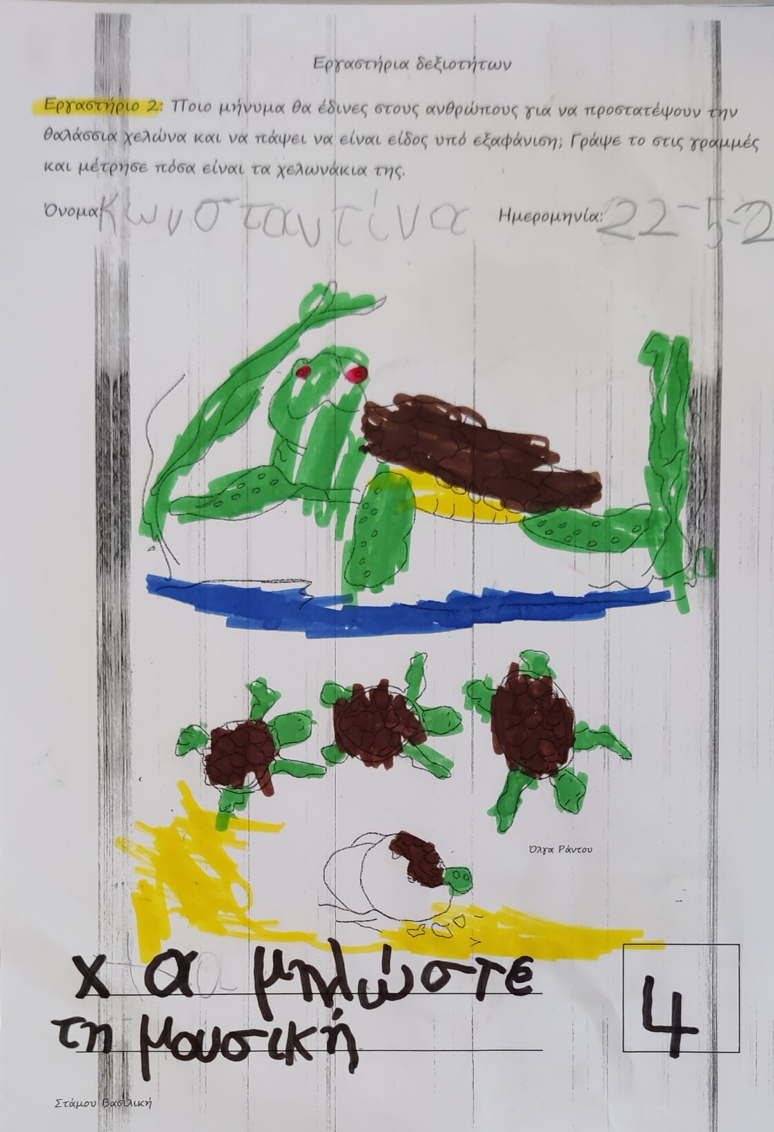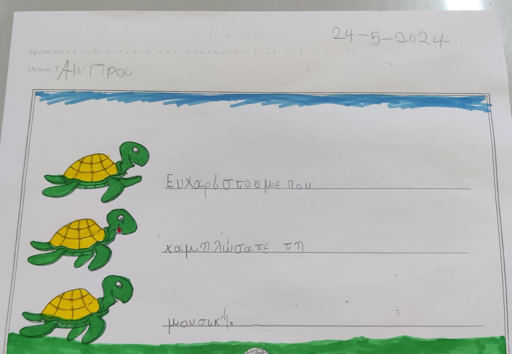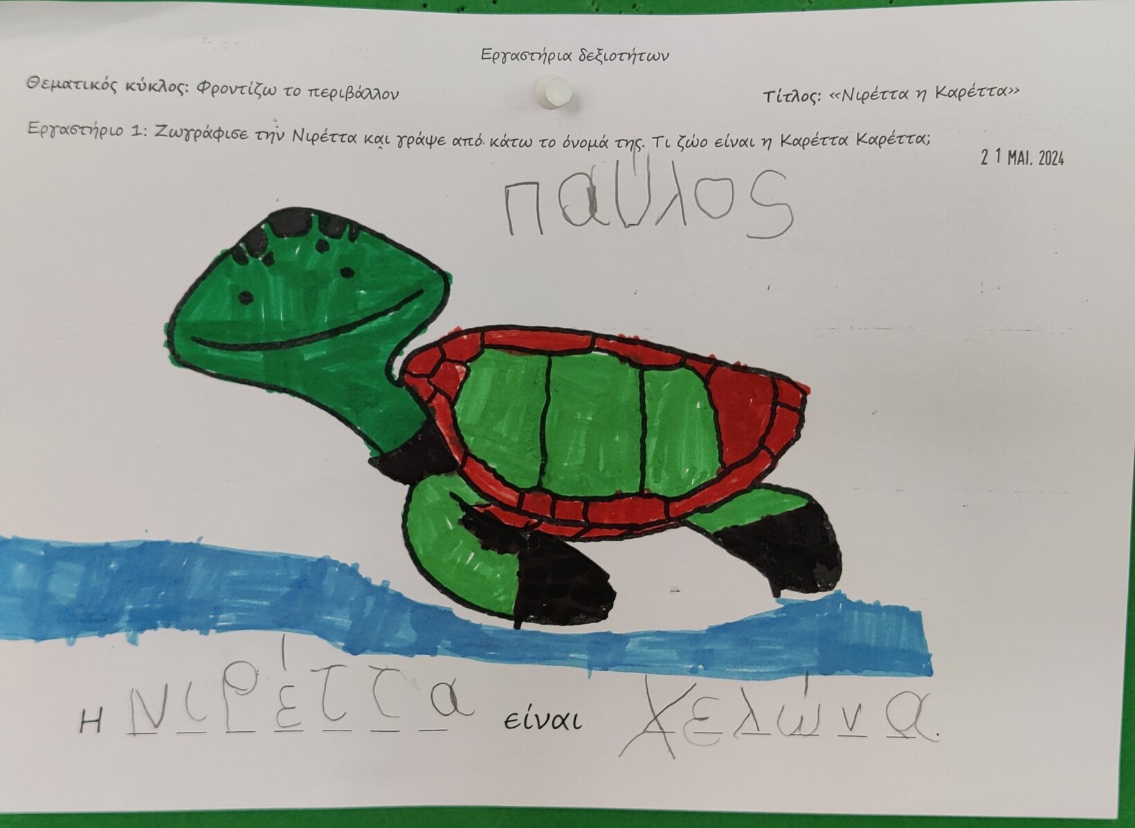 Κατόπιν βρήκαμε στο χάρτη τη Ζάκυνθο, την Κυπαρισσία και το Καλό Νερό όπου γίνεται η ωοτοκία της χελώνας τα τελευταία χρόνια.2. Μάθαμε για την χελώνα, την ανατομία, την αναπαραγωγή της, τα χρώματα στα οποία μπορούμε να την συναντήσουμε και είδαμε σχετικό εποπτικό υλικό.3. Γράψαμε δύο από τα μέρη που την συναντάμε συχνά τα τελευταία χρόνιακαι την ζωγραφίσαμε.