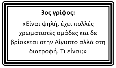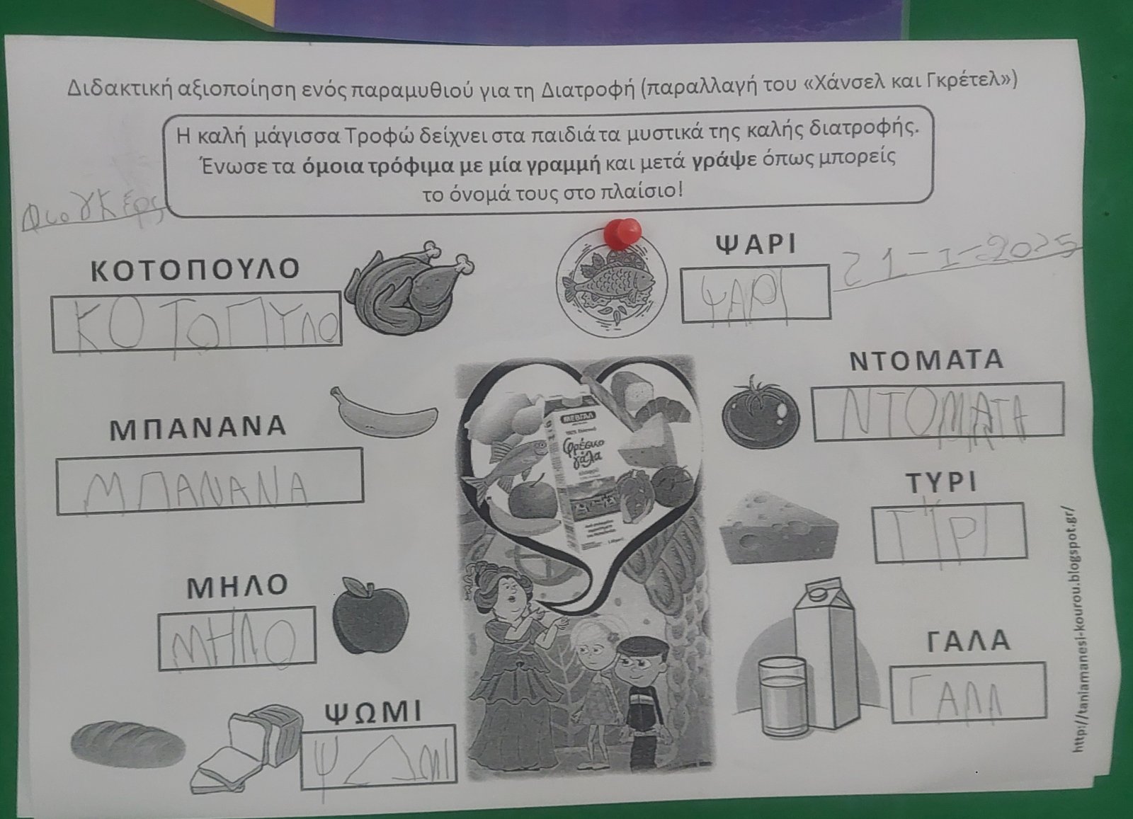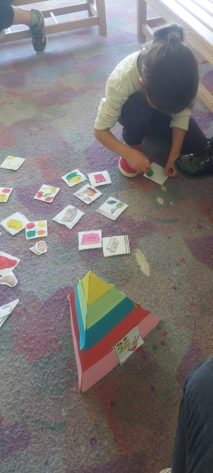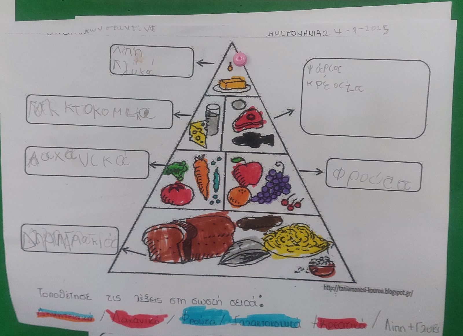 1. Σήμερα ο ντετέκτιβ Βανς μας άφησε μία επιστολή.Όταν την ανοίξαμε ένας νέος γρίφος μας περίμενε.2. Παρακολουθήσαμε το βίντεο του Egg για την διατροφή.3. Μιλήσαμε για την “Πυραμίδα της διατροφής“,ζωγραφίσαμε τα τρόφιμα και τα κολλήσαμεστο σωστό επίπεδο ανάλογα με τη συχνότητα που πρέπει να τα τρώμε.4. Διαβάσαμε το βιβλίο “Ο Λαχανούλης και η σωστή διατροφή”.5. Λύσαμε τα αινίγματα με τις τροφές της διατροφικής πυραμίδας.6. Συμπληρώσαμε τις ονομασίες τροφίμων από την πυραμίδα των τροφών.και κολλήσαμε και σε φύλλο εργασίας τα τρόφιμα της πυραμίδας.