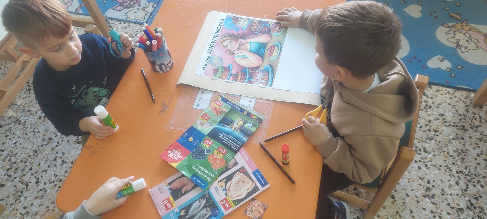 2. Κολλήσαμε τρόφιμα από φωτογραφίες τροφίμων ένθετου σουπερμάρκετκαι τις ταξινομήσαμε σε δύο κατηγορίες.Κολλήσαμε και τις φωτογραφίες της κ. Υγιεινούλας και της κ. Ανθυγιεινούλας και προέκυψαν οι αφίσες της υγιεινής και της ανθυγιεινής διατροφής για να τις στείλουμε στα παιδιά του κ. Βανς.3. Παρακολουθήσαμε το βίντεο «Το πιάτο της υγιεινής διατροφής».