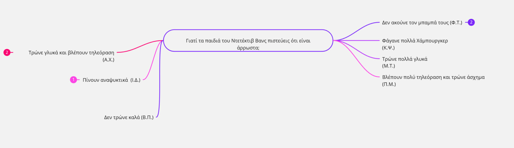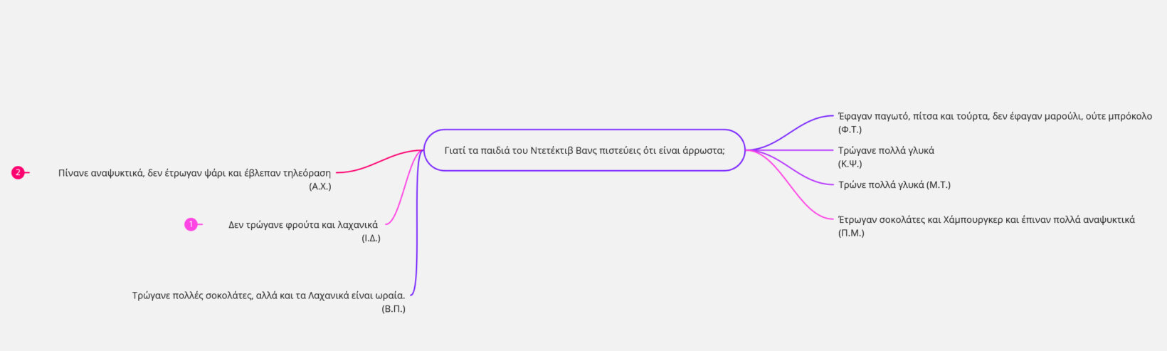 1. Ηχογραφήσαμε τις απόψεις των παιδιών σχετικά με το πρόβλημα του ντετέκτιβ Βανς και τις καταγράψαμε σε ιδεοθύελλα. Αφού οι περισσότερες συνέκλιναν στο θέμα της κακής διατροφής, αποφασίσαμε να μάθουμε τι είναι η διατροφή και ποιες είναι οι ομάδες των τροφών.2. Τις γνωρίσαμε και είδαμε ποια τρόφιμα συγκαταλέγονται σε καθεμία από αυτές τις ομάδες.3. Διαλέξαμε μία ομάδα τροφίμων, την κολλήσαμε και γράψαμε την ονομασία της.4. Τις τοποθετήσαμε στις οικογένειές τους.5. Τις ταξινομήσαμε σε υγιεινές και ανθυγιεινές.Πάνω από το κάθε στεφάνι, τοποθετήσαμε το σωματότυπο που εικάσαμε ότι αποκτάει ο κάθε άνθρωπος τρώγοντας τα αντίστοιχα τρόφιμα.6. Λύσαμε αινίγματα με διάφορες τροφές και κολλήσαμε τις φωτογραφίες τους.7. Παίξαμε ψηφιακά παιχνίδια.8. Διαβάσαμε από τη σειρά των βιβλίων “Πες μου γιατί”, το αντίστοιχο για τα γλυκά και γιατί δεν πρέπει να υπερβαίνουμε τις συνιστώμενες ποσότητες.