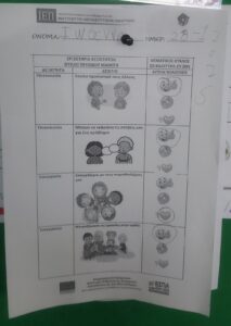 2. Παρακολουθήσαμε την παρουσίαση της “Εθνικής δράσης υγείας για τη ζωή των νέων” (ΕΥΖΗΝ).3. Απαντήσαμε στις ερωτήσεις κατανόησης και μαντέψαμε διάφορα αθλήματα ανάλογα με την περιγραφή τους.4. Σε πίνακα διπλής εισόδου καταγράψαμε τις διάφορες μορφές σωματικής άσκησης με τις οποίες ασχολείται ο καθένας και συγκρίναμε. Είμαστε αρκετά δραστήριοι μέσα στη μέρα;5. Ζωγραφίσαμε το αγαπημένο μας άθλημα/σωματική άσκηση και γράψαμε την ονομασία του.Τα βάρη6. Γράψαμε ποια είναι τα οφέλη της άσκησης στον οργανισμό μαςζωγραφίσαμε το αγαπημένο μας άθλημακαι φτιάξαμε μία αφίσα για να πάρουμε και άλλο στοιχείο.7. Κάναμε ασκήσεις με τα στεφάνια του σχολείουκαι γυμνάσαμε το σώμα μας.8. Κόψαμε και κολλήσαμε τα πρόσωπα που ασκούνταιανάλογα με το αρχικό πρότυπο.9. Γράψαμε τις ονομασίες των αθλημάτων.