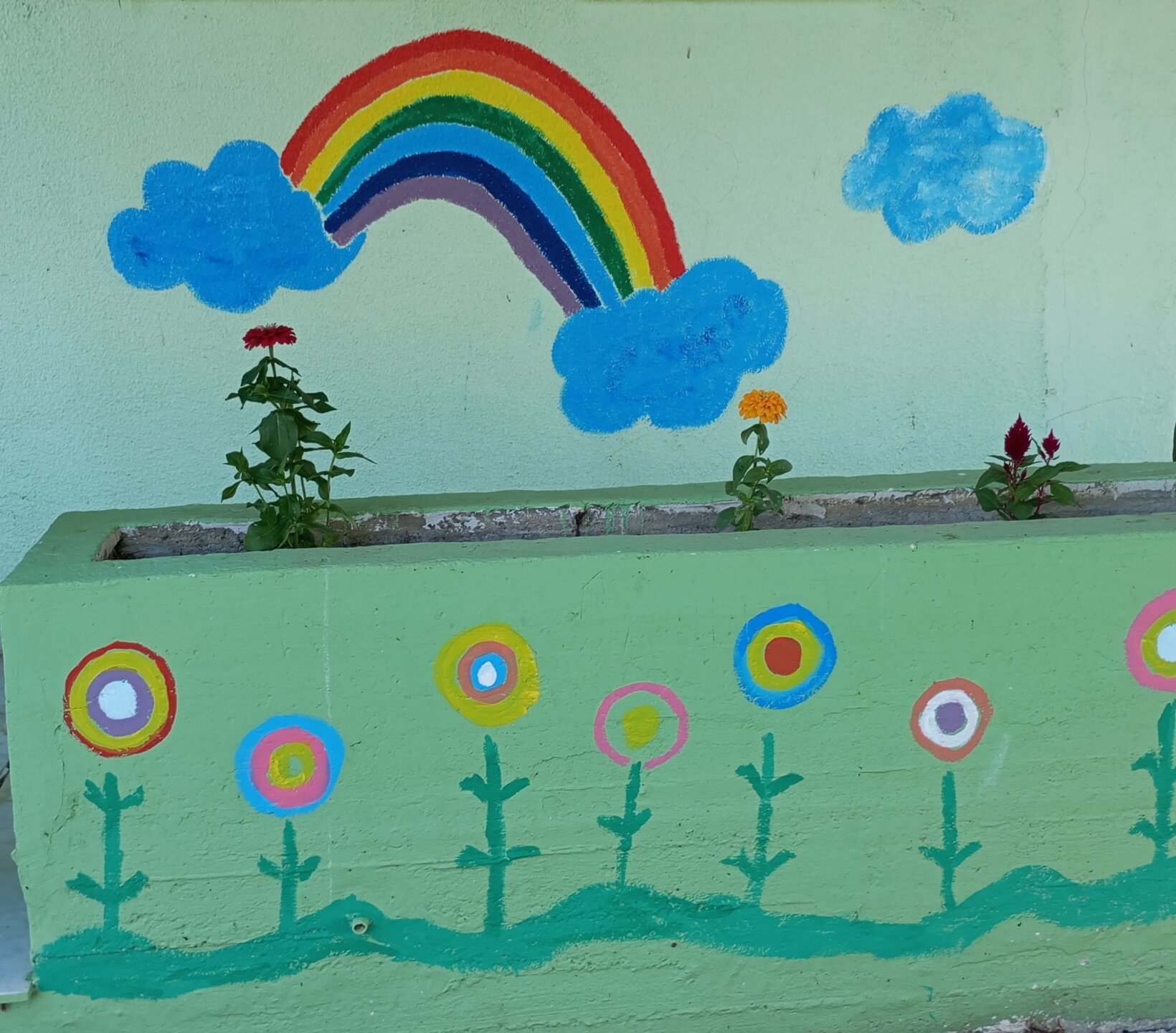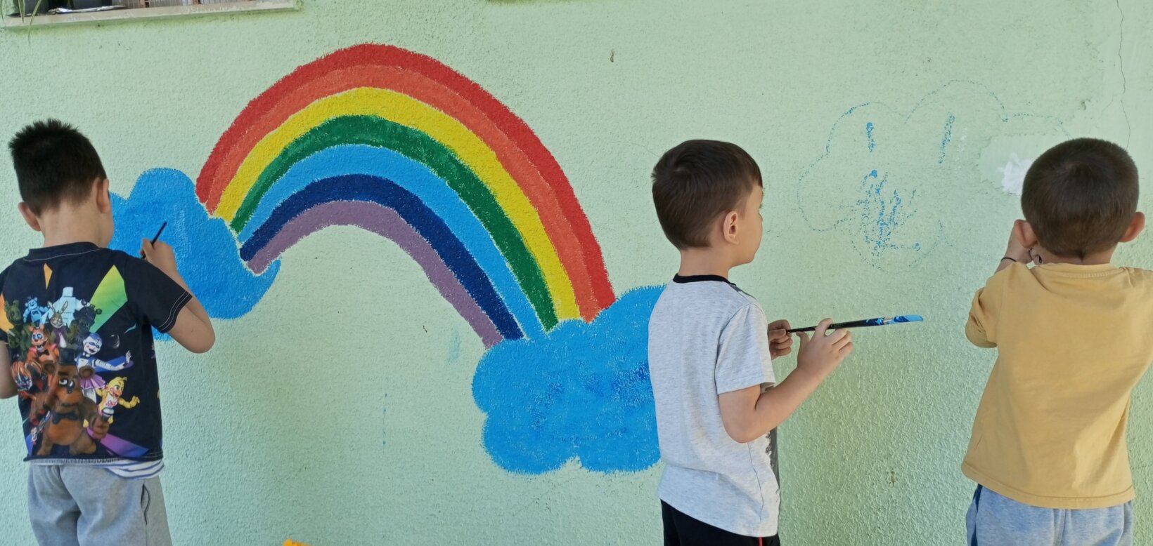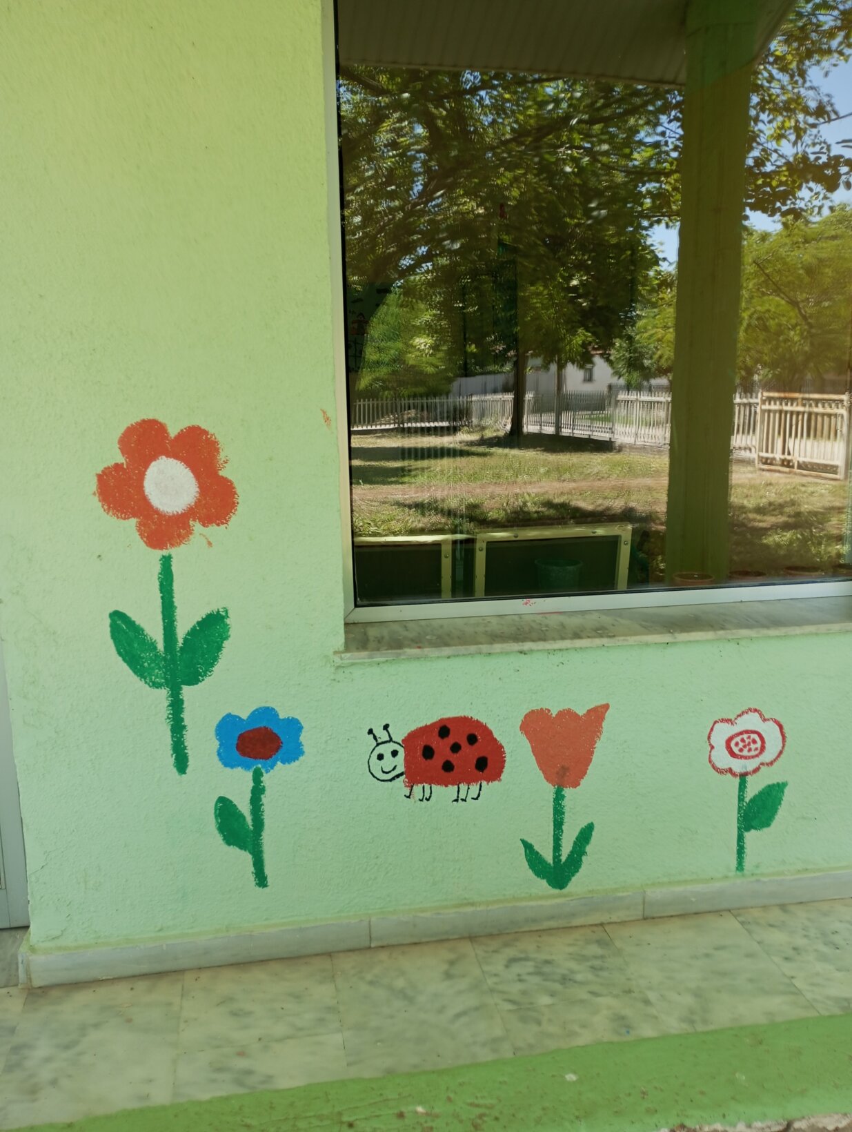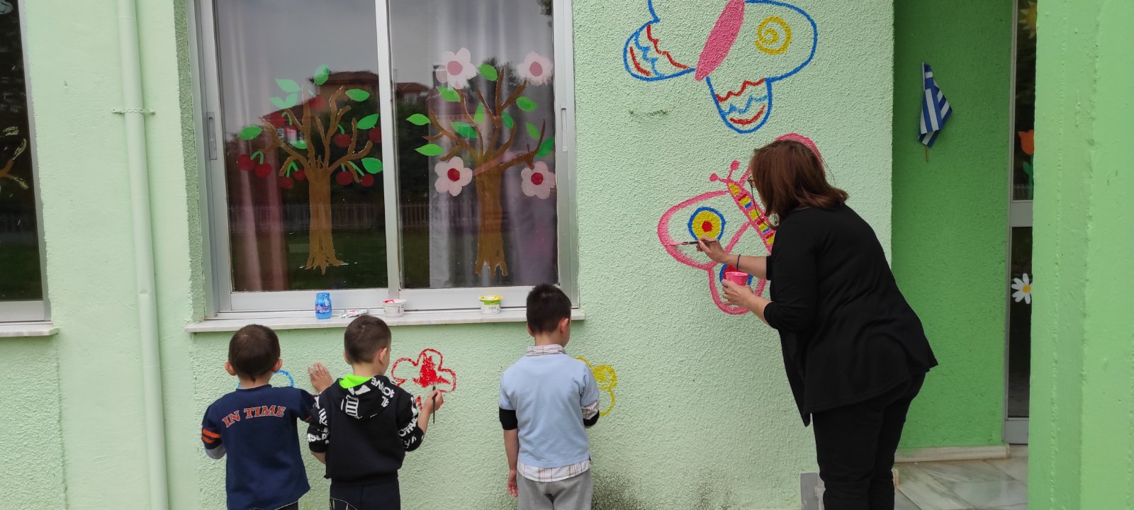 Πρώτα οι τοίχοι του νηπιαγωγείου αρχίζουν να μεταμορφώνονται…. πεταλούδες, λουλούδια, ουράνιο τόξο… Η φύση μας δίνει ιδέες, τα χρώματα και τα σχέδια μας ενθουσιάζουν!