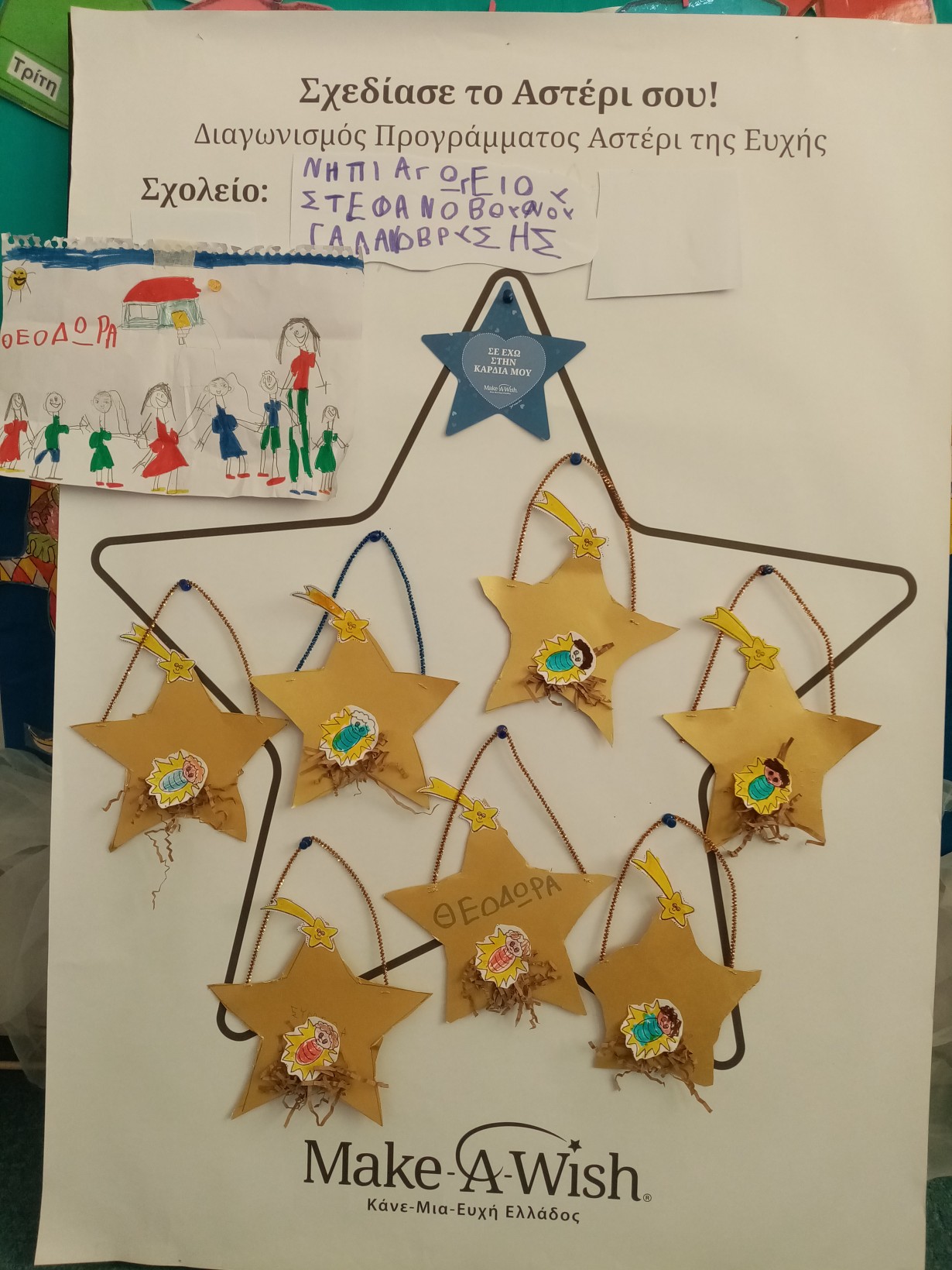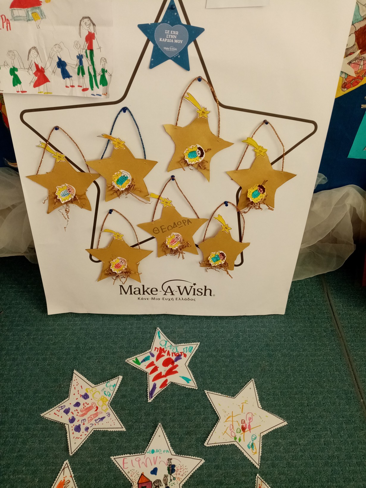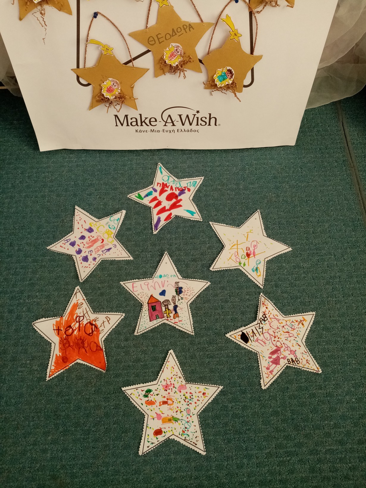 Διαπιστώσαμε συζητώντας ότι υπάρχουν παιδιά που δεν έχουν τα αγαθά που έχουμε εμείς όπως υγεία, ρούχα, παιχνίδια, σπίτι για να μείνουν….και αποφασίσαμε να τα ζωγραφίσουμε και να στολίσουμε το μεγάλο αστέρι του MAKE A WISH !!