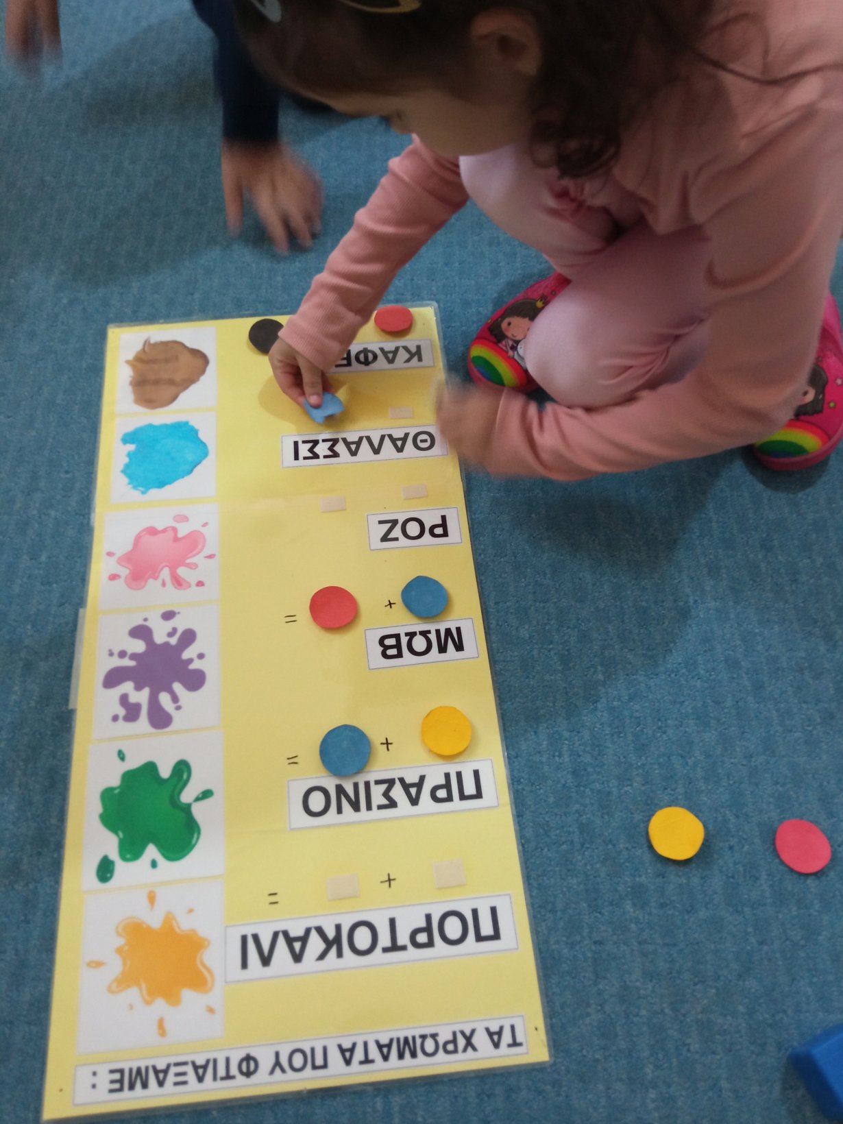 και μιλήσαμε γι αυτά. Μάθαμε για τα βασικά χρώματα : το κόκκινο, το κίτρινο και το μπλε. Μάθαμε ποια είναι τα ουδέτερα χρώματα : το άσπρο και το μαύρο και μετά αναρωτηθήκαμε τι θα συμβεί αν ενώσουμε κάποια χρώματα μεταξύ τους !! Αυτά τα ανακαλύψαμε ….μόνοι μας !!! Δείτε πως :