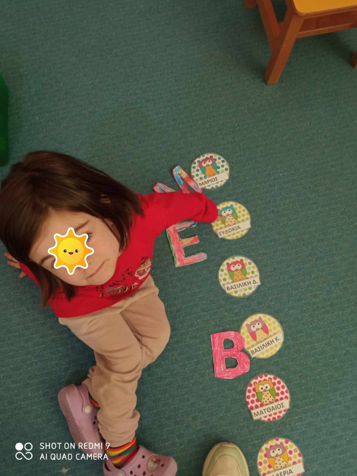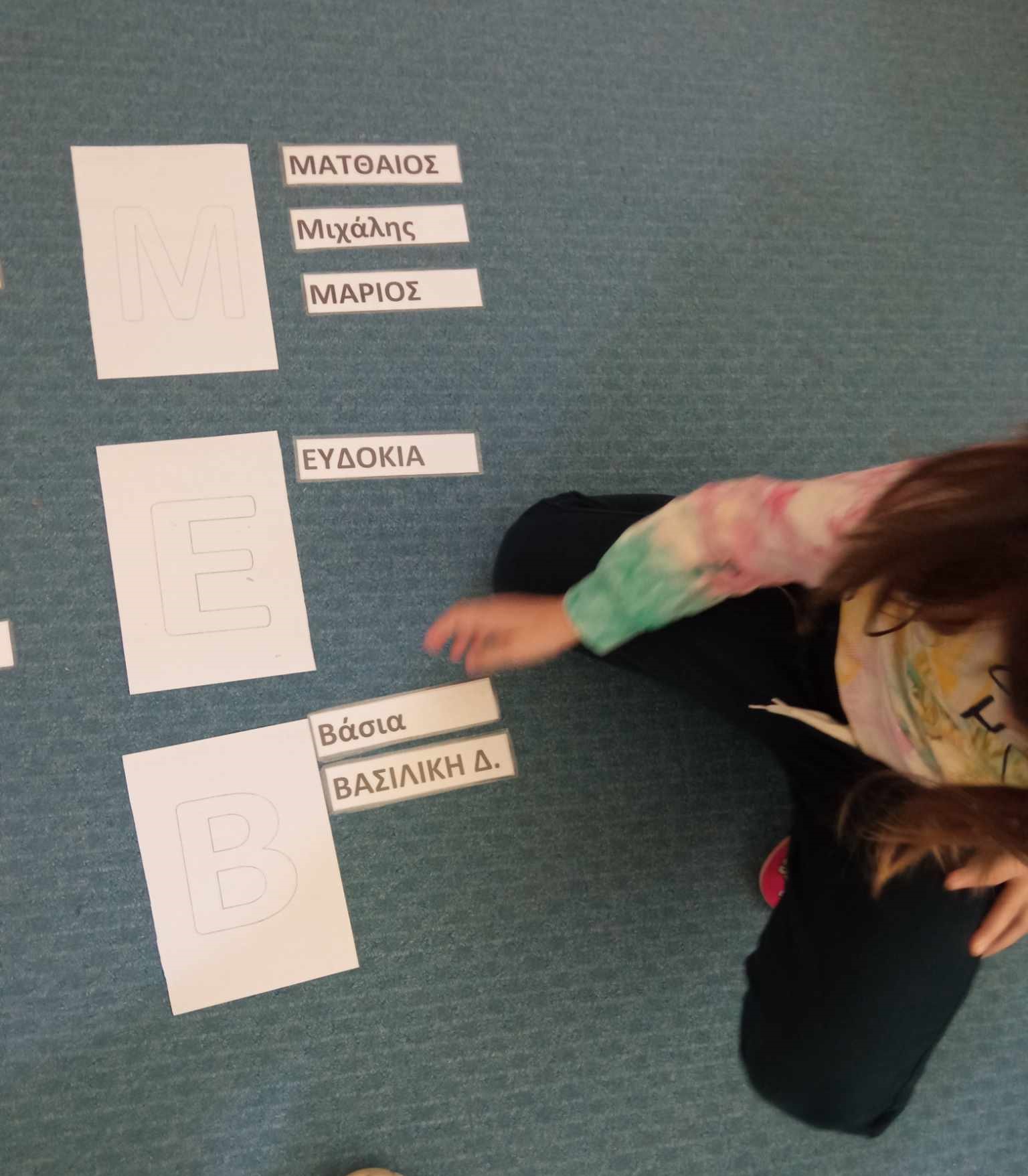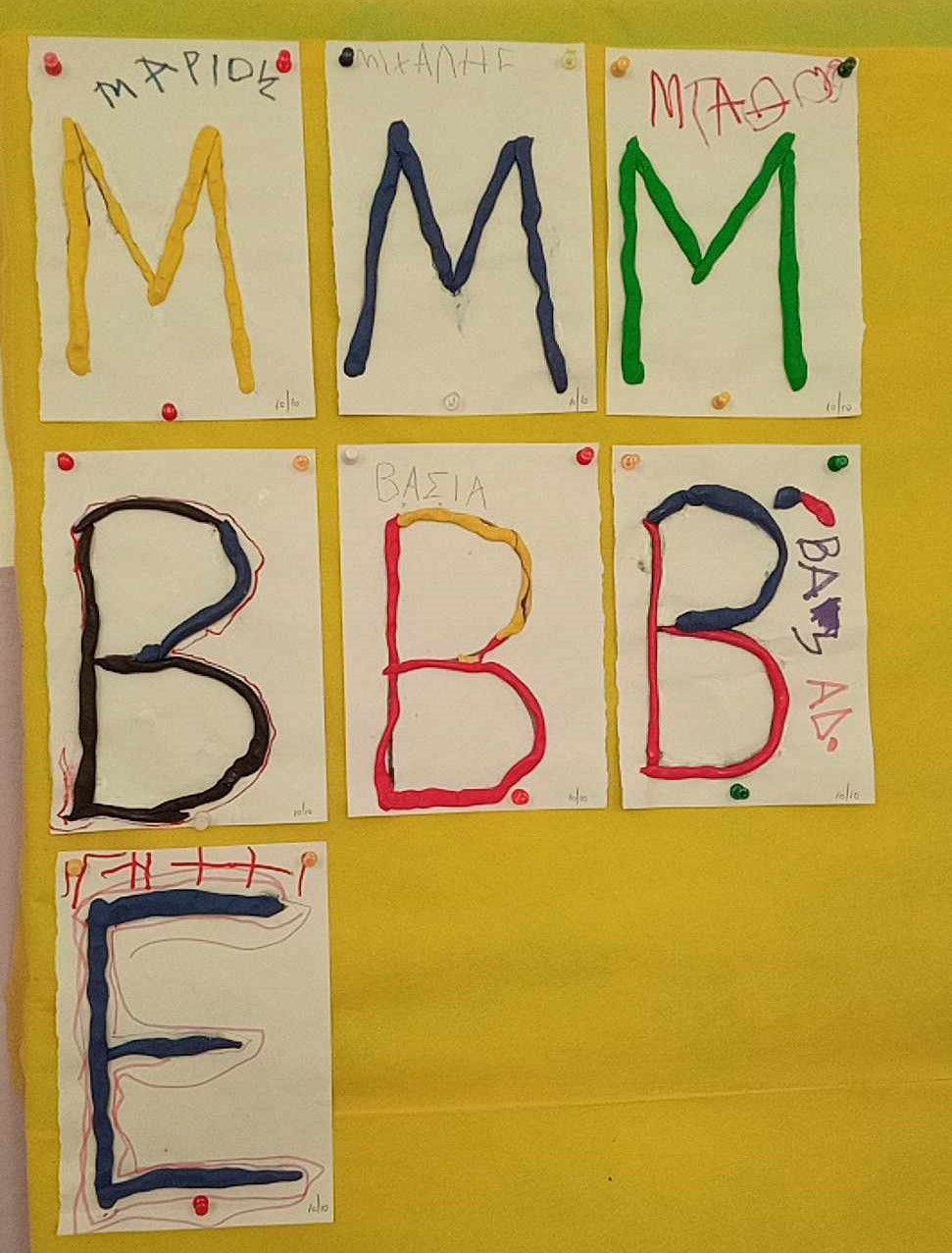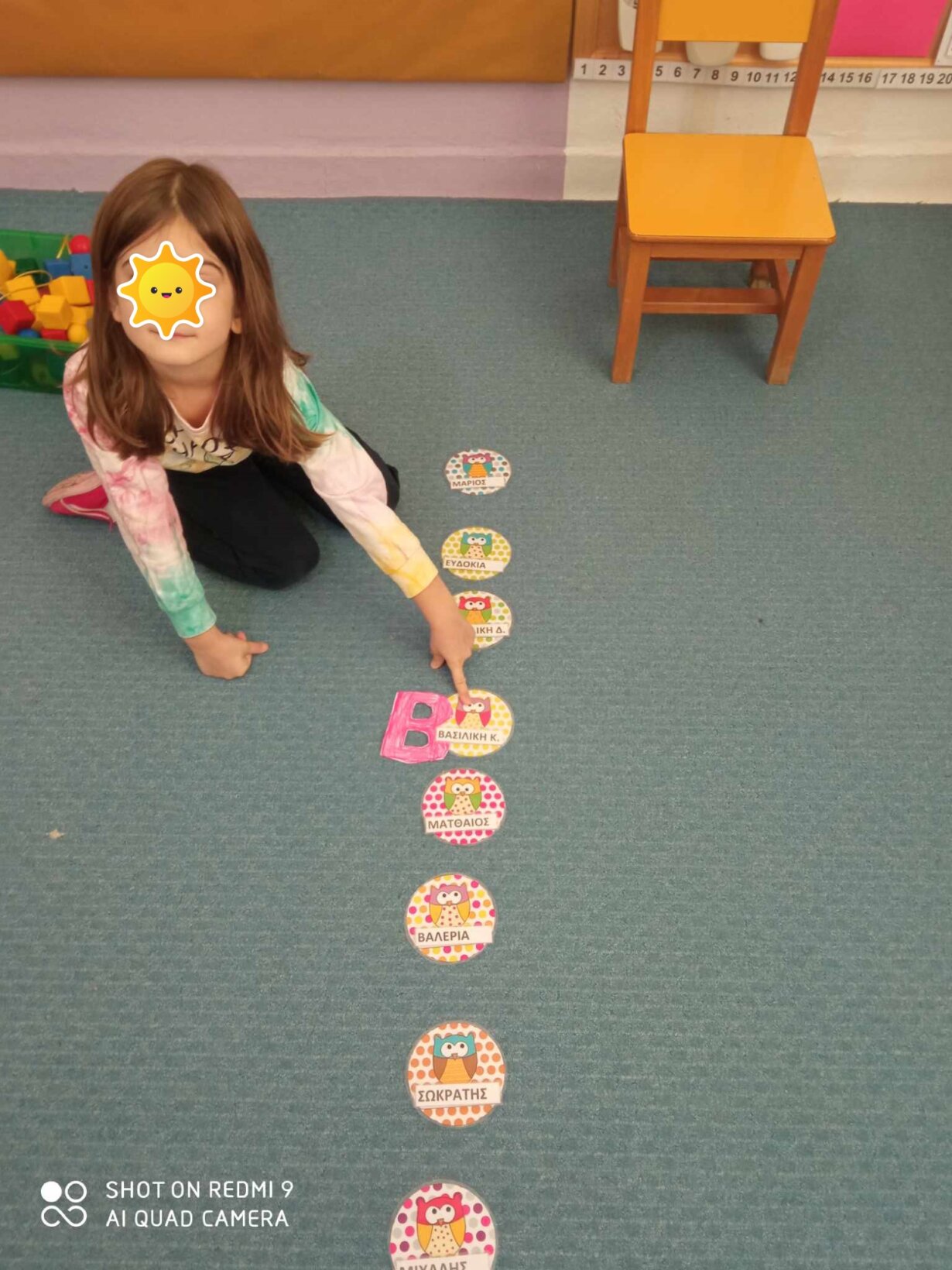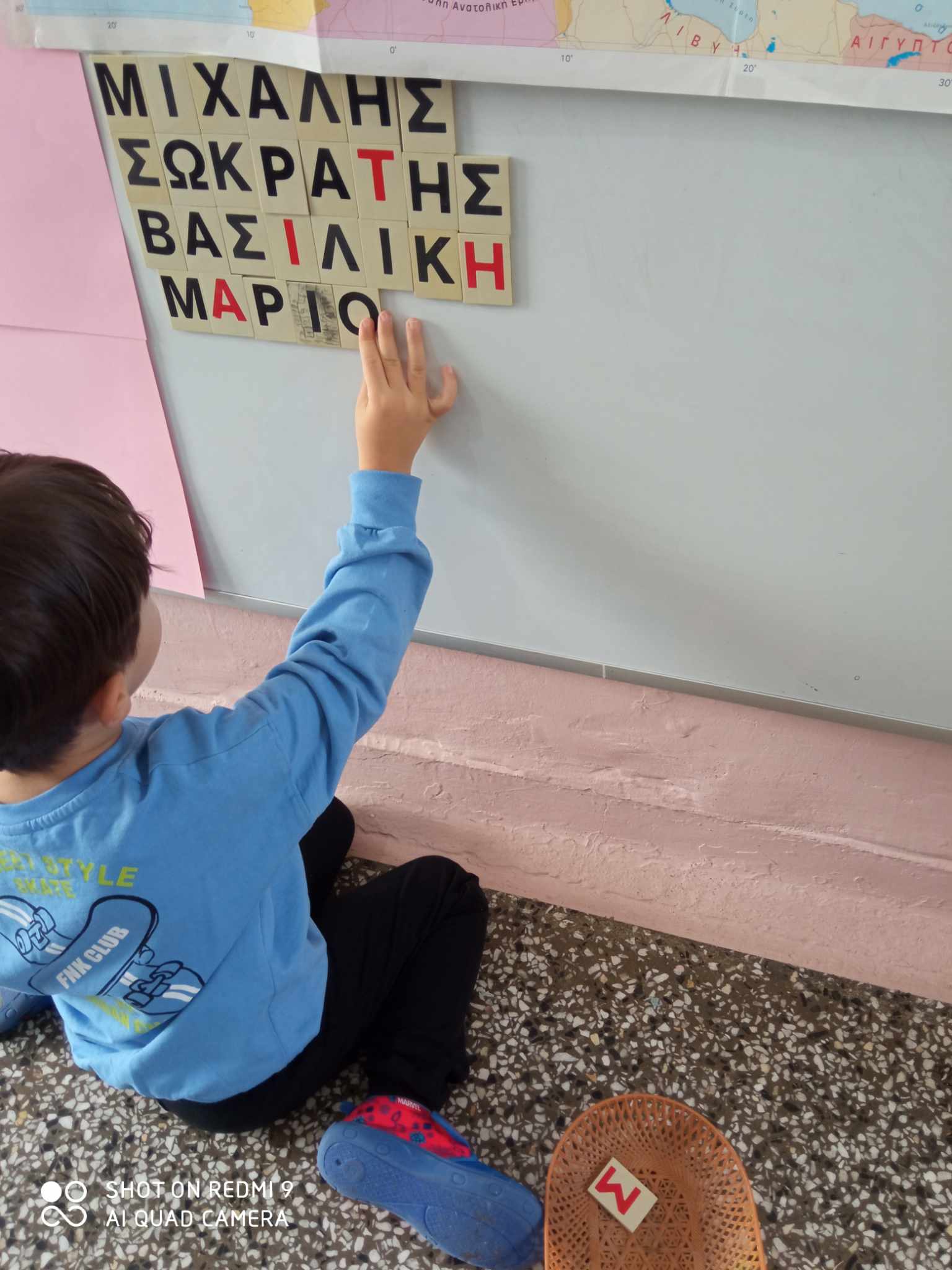 Από τις πρώτες μέρες στο σχολείο τα παιδιά μαθαίνουν να αναγνωρίζουν το όνομά τους χρησιμοποιώντας καρτελάκια, για το παρουσιολόγιο και τις γωνιές, για τις ομάδες υπηρείας και αλλόυ. Ξεχωρίζουν το αρχικό γράμμα του και σταδιακά μαθαίνουν και να γράφουν όπως μπορούν το όνομά τους στις εργασίες σους , στις ζωγραφιές τους κι όπου αλλού χρειάζεται.