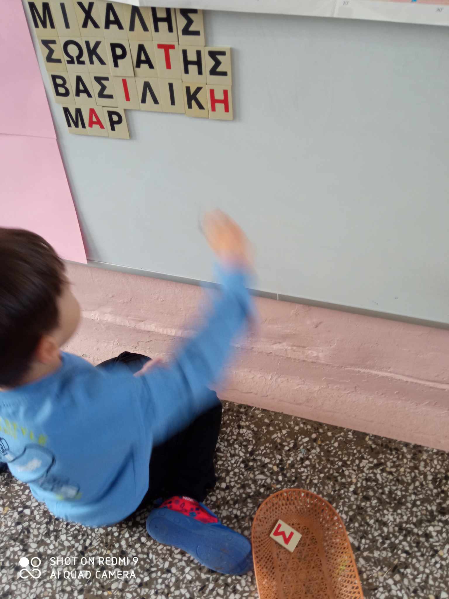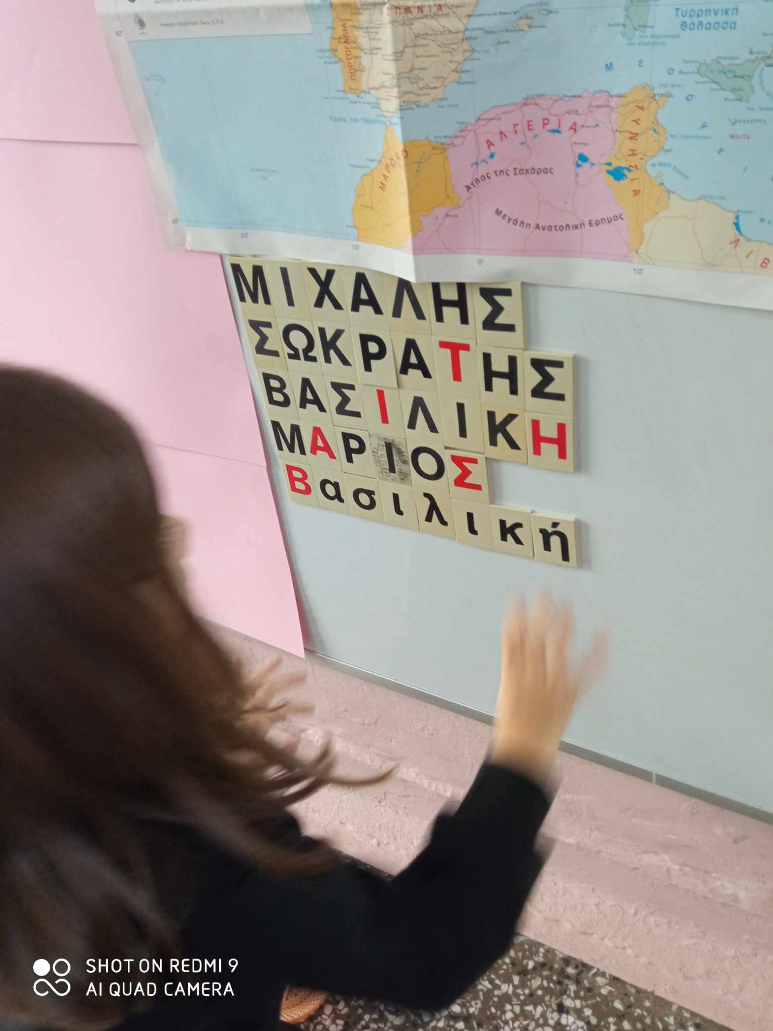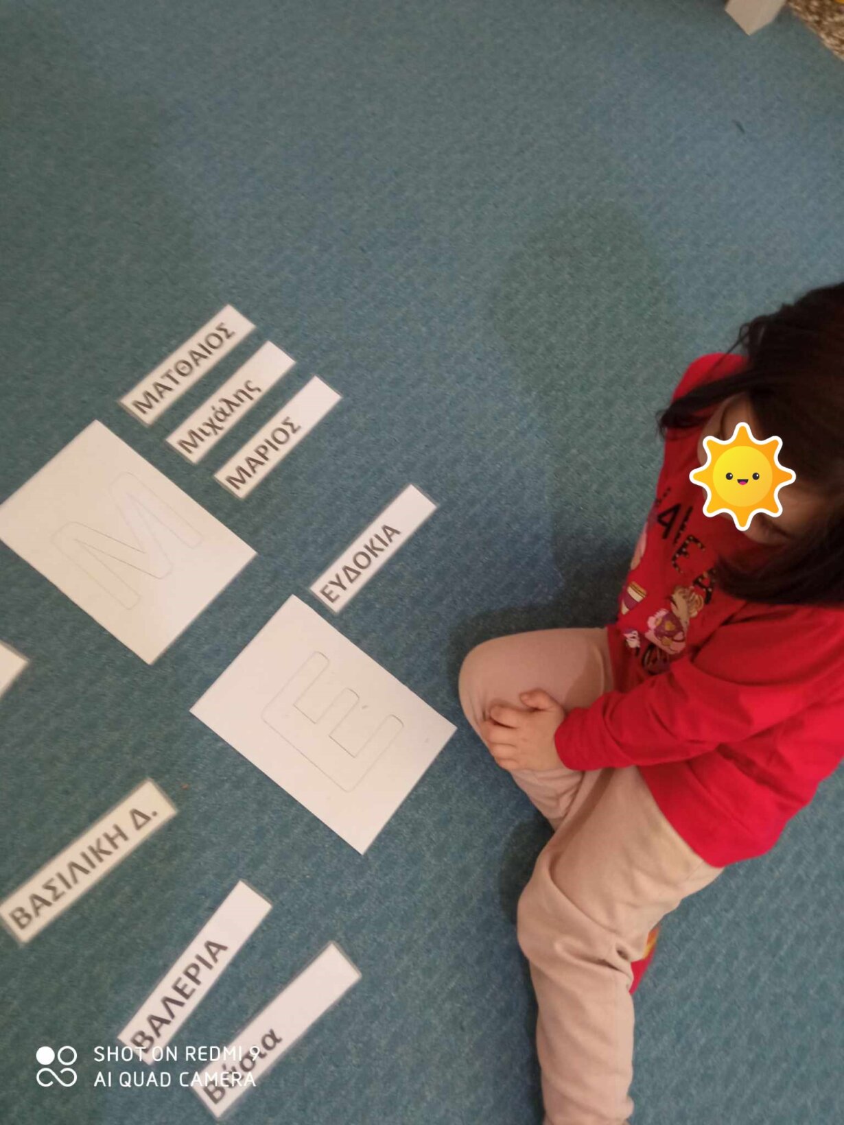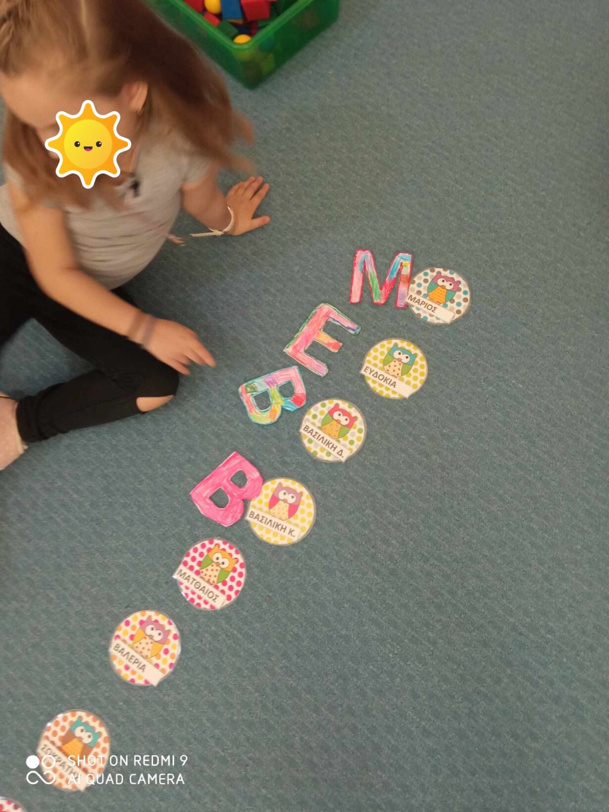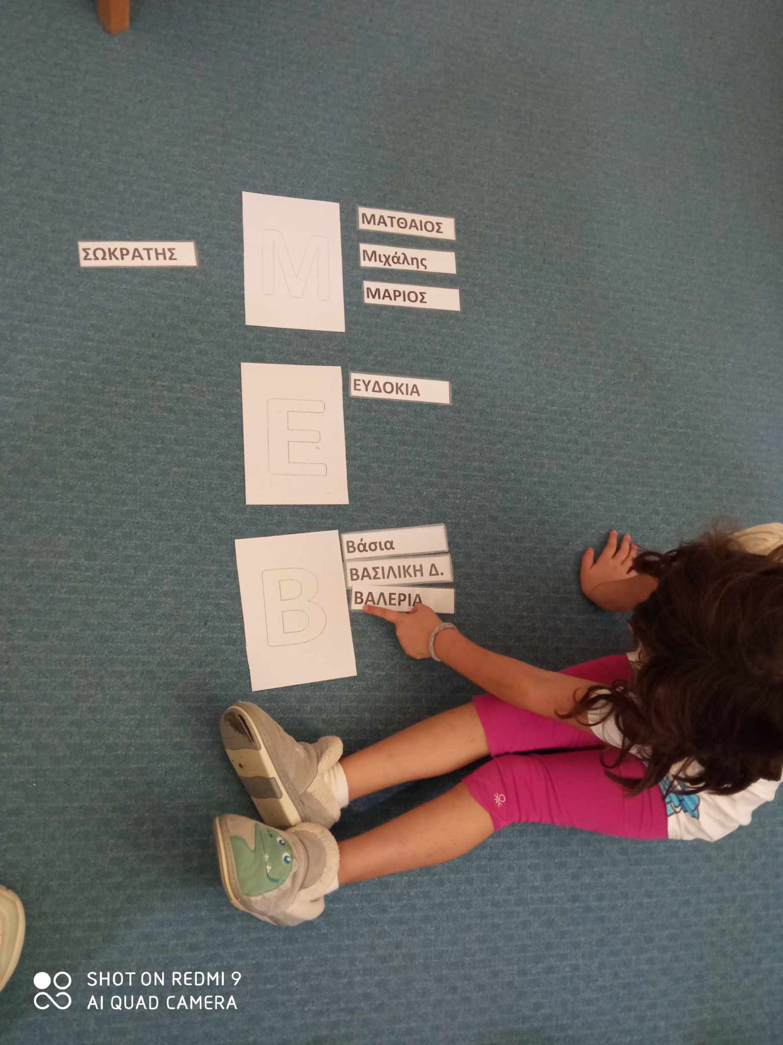 Από τις πρώτες μέρες στο σχολείο τα παιδιά μαθαίνουν να αναγνωρίζουν το όνομά τους χρησιμοποιώντας καρτελάκια, για το παρουσιολόγιο και τις γωνιές, για τις ομάδες υπηρείας και αλλόυ. Ξεχωρίζουν το αρχικό γράμμα του και σταδιακά μαθαίνουν και να γράφουν όπως μπορούν το όνομά τους στις εργασίες σους , στις ζωγραφιές τους κι όπου αλλού χρειάζεται.