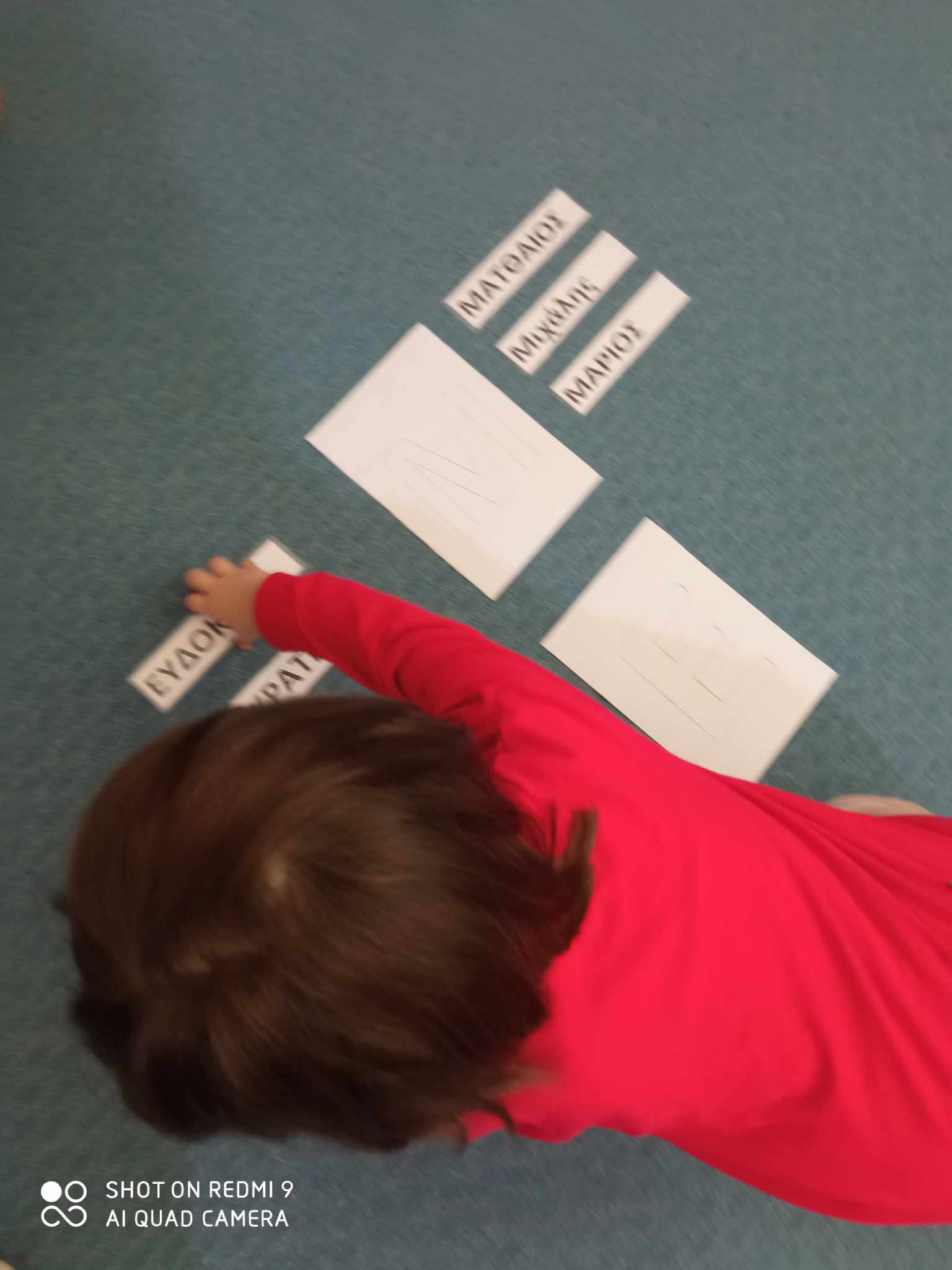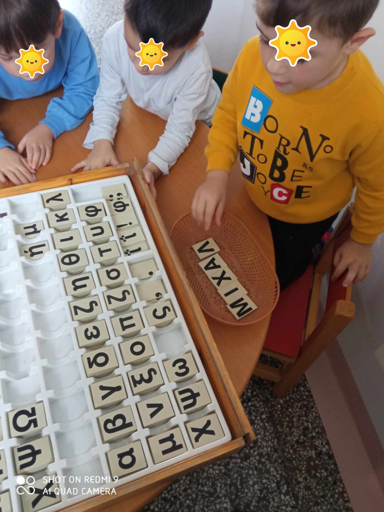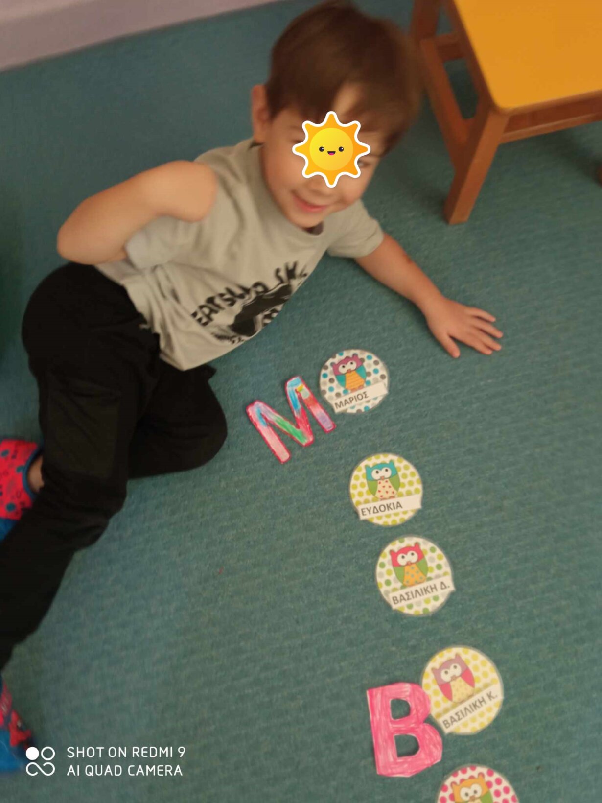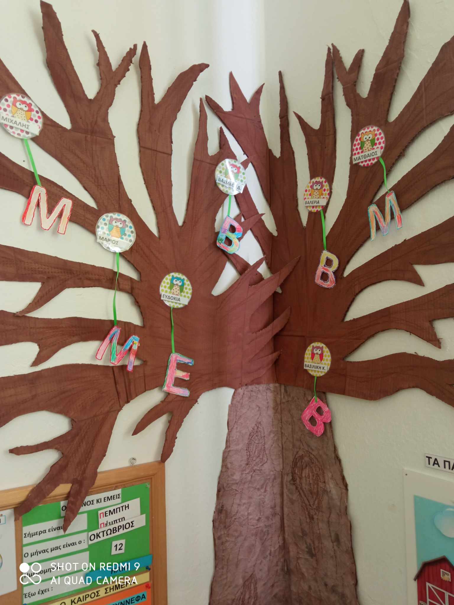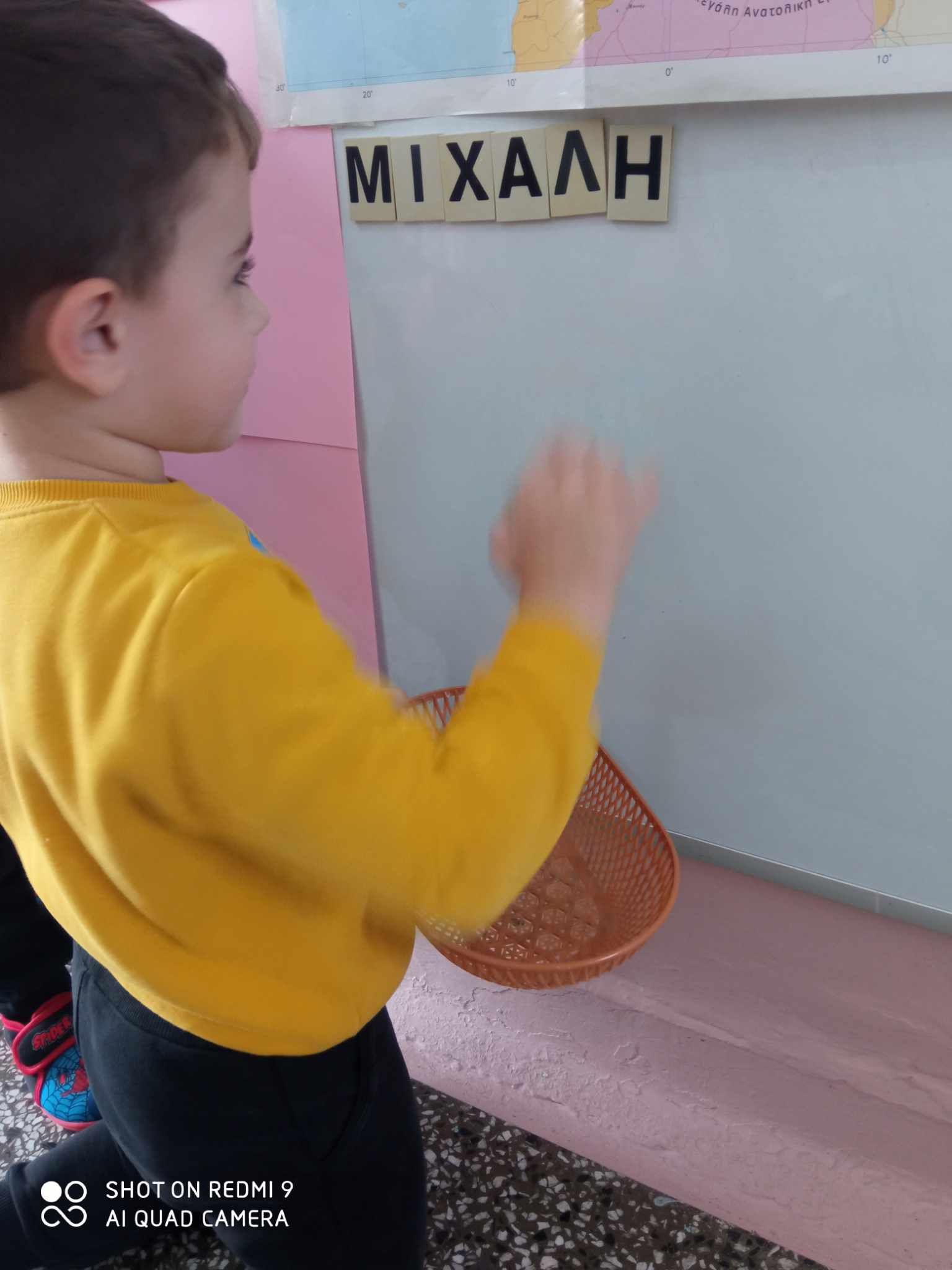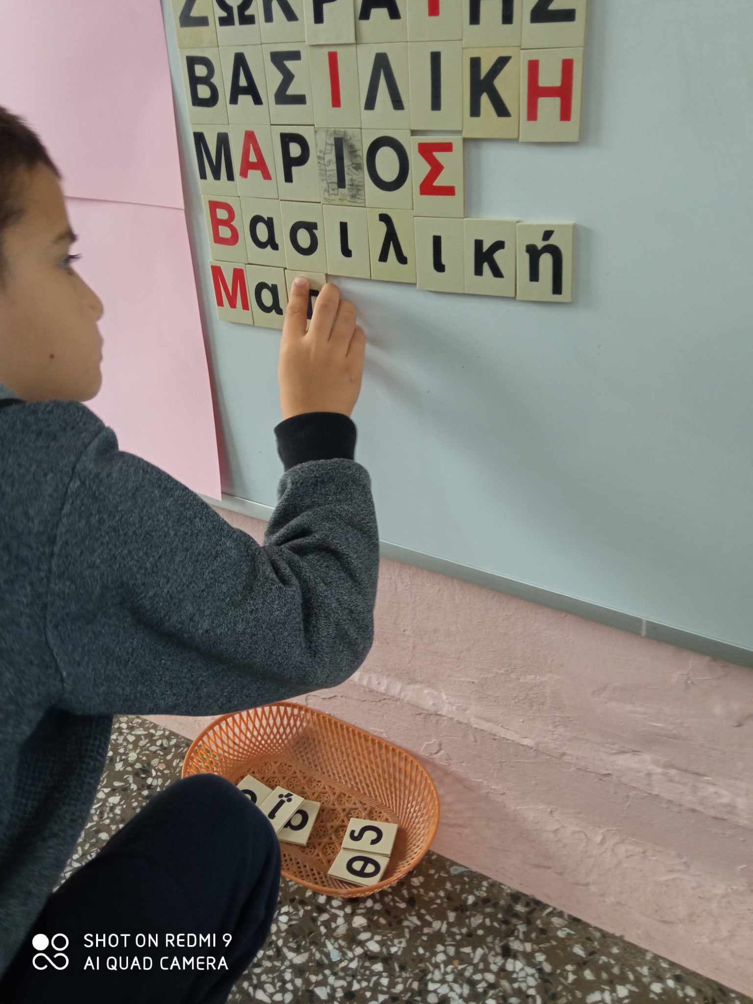 Από τις πρώτες μέρες στο σχολείο τα παιδιά μαθαίνουν να αναγνωρίζουν το όνομά τους χρησιμοποιώντας καρτελάκια, για το παρουσιολόγιο και τις γωνιές, για τις ομάδες υπηρείας και αλλόυ. Ξεχωρίζουν το αρχικό γράμμα του και σταδιακά μαθαίνουν και να γράφουν όπως μπορούν το όνομά τους στις εργασίες σους , στις ζωγραφιές τους κι όπου αλλού χρειάζεται.