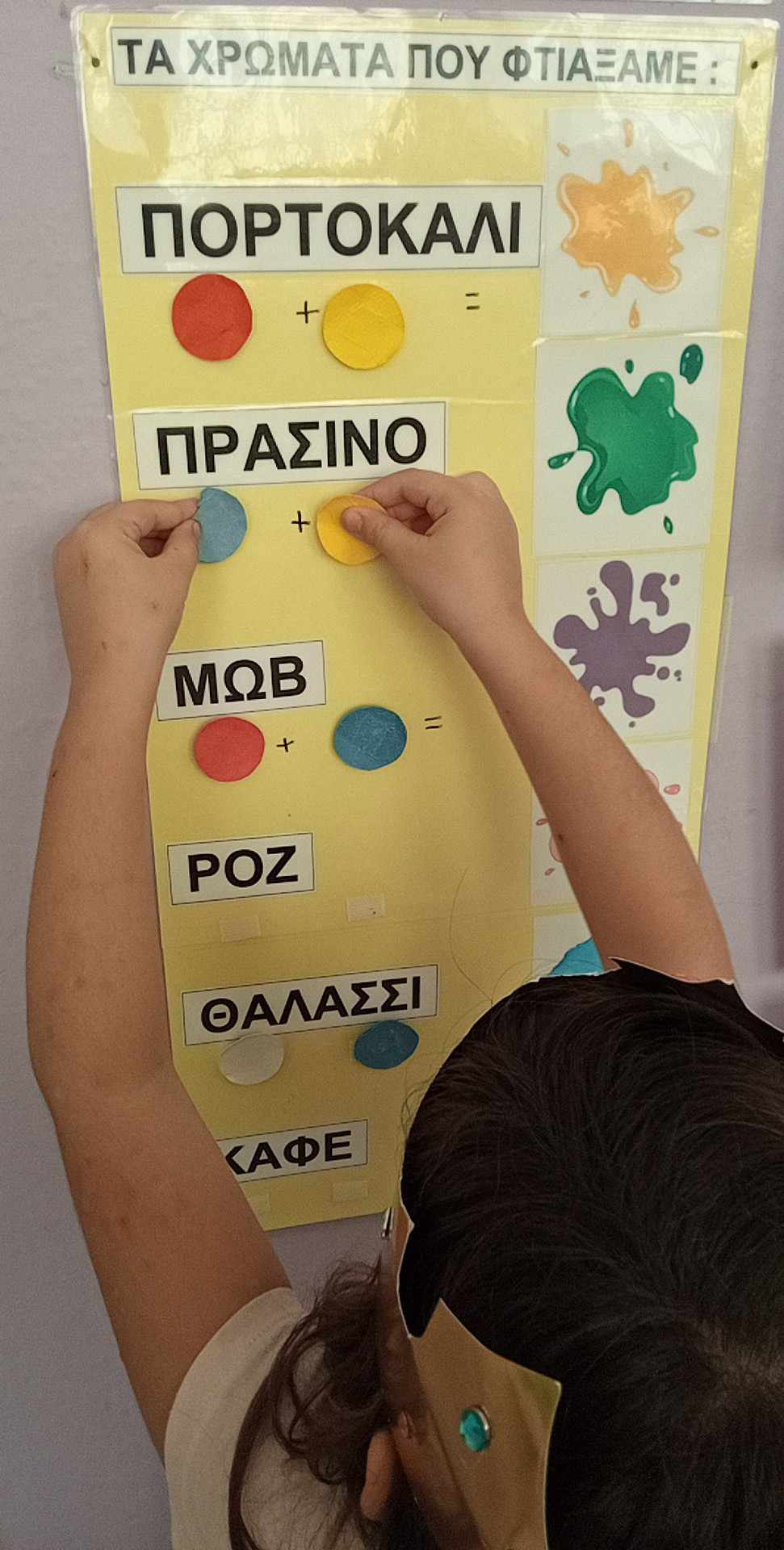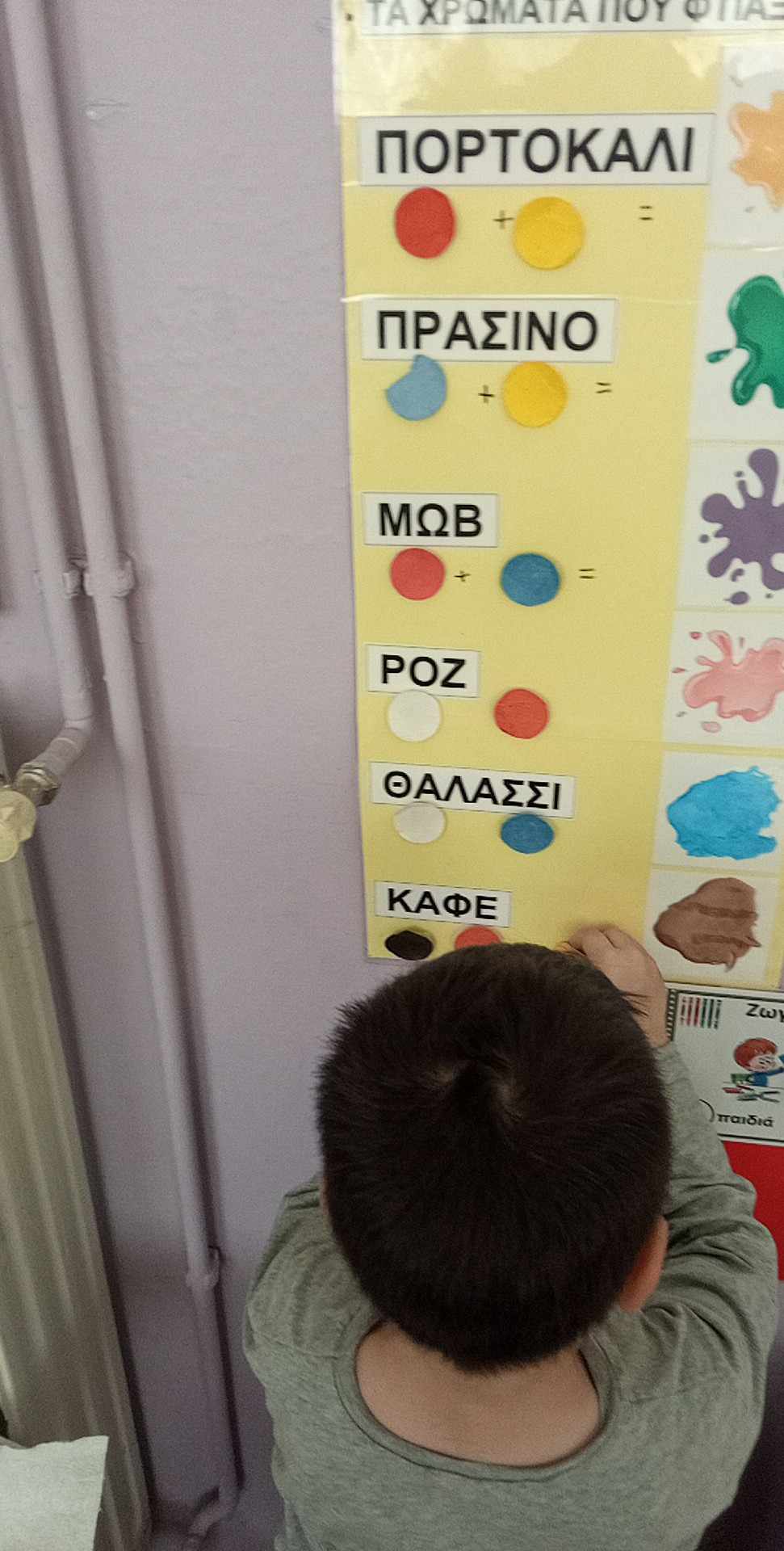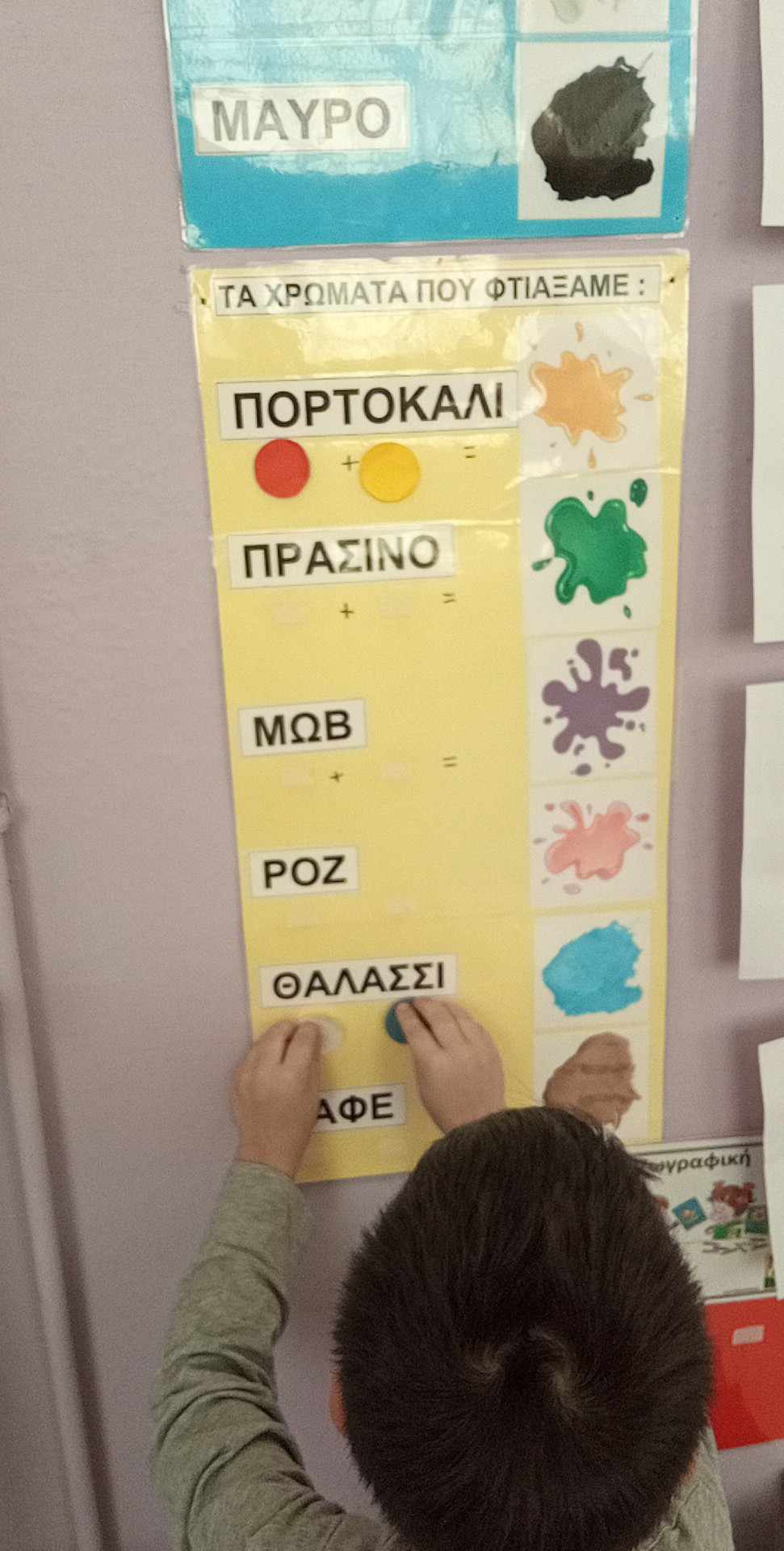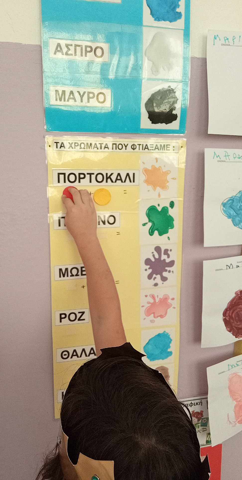 Με αφορμή το φθινόπωρο μαι τα φθινοπωρινά φύλλα, ασχοληθήκαμε με τα χρώματα, τόσο στην αυλή μας, στη φύση γύρω μας, όσο και στην τάξη μας !!! Παντού χρώματα !!! Τα παιδιά τα ονόμασαν, τα αναγνώρισαν μέσα στην τάξη μας, στα ρούχα τους, στην αυλή, παντού !!! Μιλήσαμε για τα “βασικά” χρώματα : το κόκκινο, το κίτρινο και το μπλε. Μάθαμε ποια είναι τα ουδέτερα χρώματα : το άσπρο και το μαύρο και μετά αναρωτηθήκαμε τι θα συμβεί αν ενώσουμε κάποια χρώματα μεταξύ τους !! Αυτά τα ανακαλύψαμε ….μόνοι μας !!! Δείτε πως ….