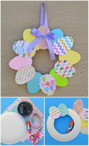 Φτιάχνουμε πρώτα ένα στρογγυλό στεφάνι ή κόβουμε το εσωτερικό μέρος ενός χάρτινου πιάτου και κρατάμε το υπόλοιπο. Πάνω σ’ αυτό κολλάμε τα χάρτινα αυγά, που έχουμε κόψει. Αν δεν έχετε χρωματιστά χαρτόνια, φτιάξτε τα αυγά σε λευκό χαρτόνι, το οποίο μπορούν να ζωγραφίσουν τα παιδιά. Για να το κρεμάσετε, βάλτε μια κορδέλα στο πάνω μέρος.