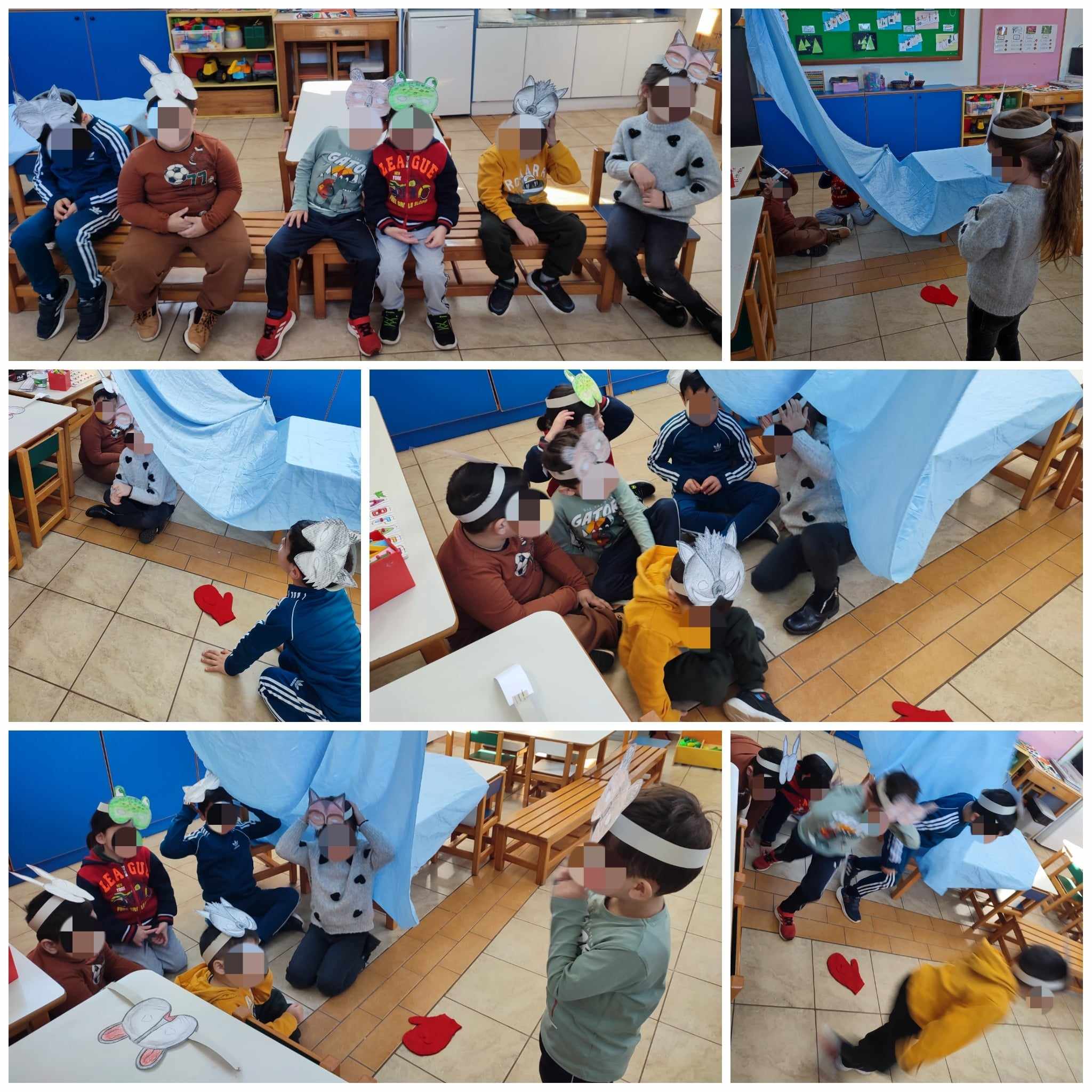 7 διαφορετικά ζώα, από το μικρότερο στο μεγαλύτερο (ή από το πιο αδύναμο στο πιο δυνατό), βρίσκουν καταφύγιο μέσα στο γάντι. Συζητήσαμε γιατί τα ζώα να κρύβονται μέσα στο γάντι (να προστατευτούν από το χιόνι, την παγωνιά), όμως καταλάβαμε ότι μέσα του, το “γάντι”, κρύβει και κάτι άλλο.. την αποδοχή του διαφορετικού, την αλληλεγγύη, την ευγένεια, την κατανόηση.