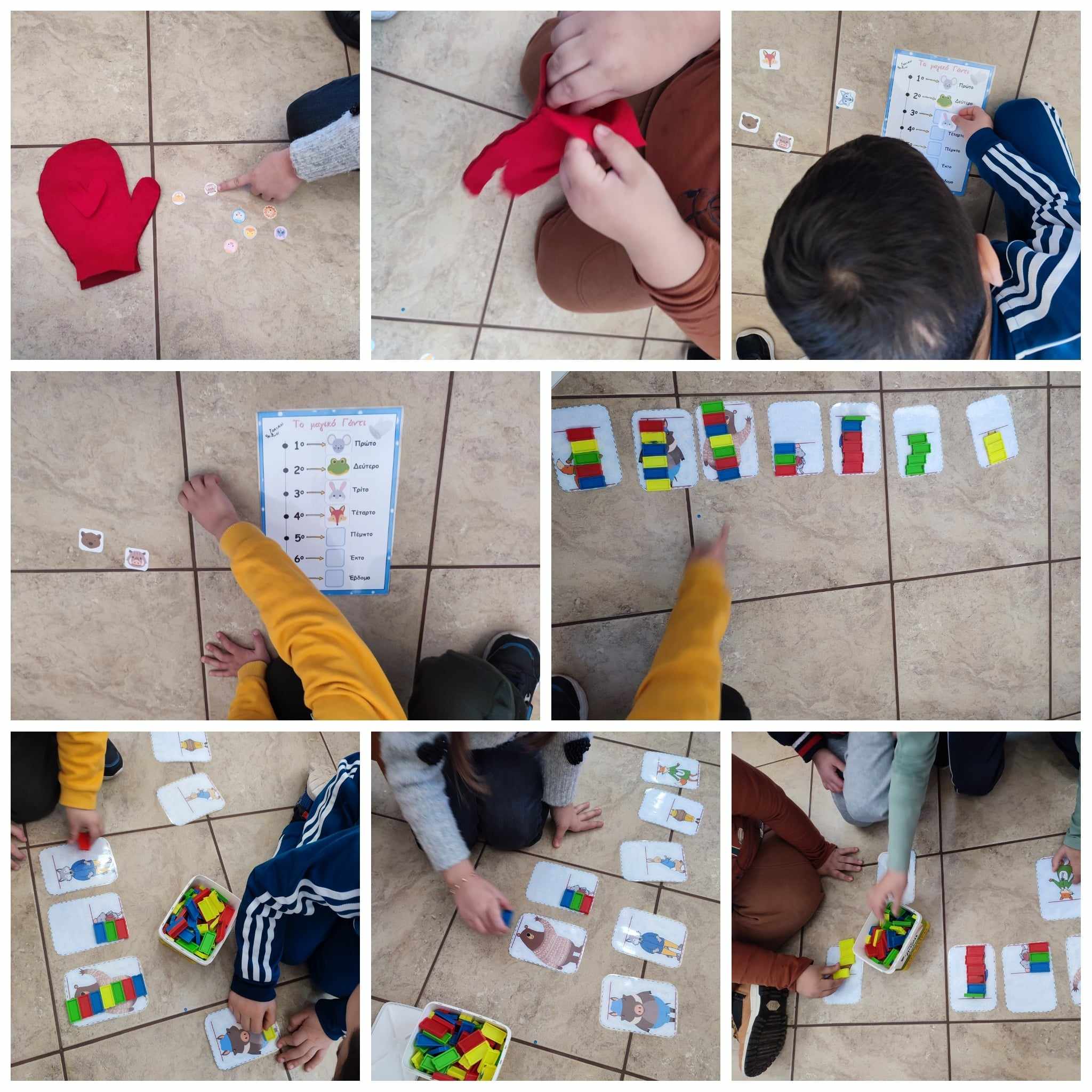 Βάλαμε τα ζώα μέσα στο γάντι, με τη σειρά που εμφανίστηκαν στην ιστορία. Έπειτα, ήρθαμε σε μια πρώτη επαφή με τους τακτικούς αριθμούς (πρώτος, δεύτερος κλπ). Προσπαθήσαμε να μετρήσουμε το ύψος των ζώων. Προβληματιστήκαμε για το πως θα το επιτύχουμε αυτό. Τελικά, μετά από συζήτηση καταλήξαμε πως ένας εύκολος τρόπος είναι χρησιμοποιώντας τουβλάκι. Σειροθετήσαμε τα ζώα από το μεγαλύτερο στο μικρότερο και το αντίστροφο.