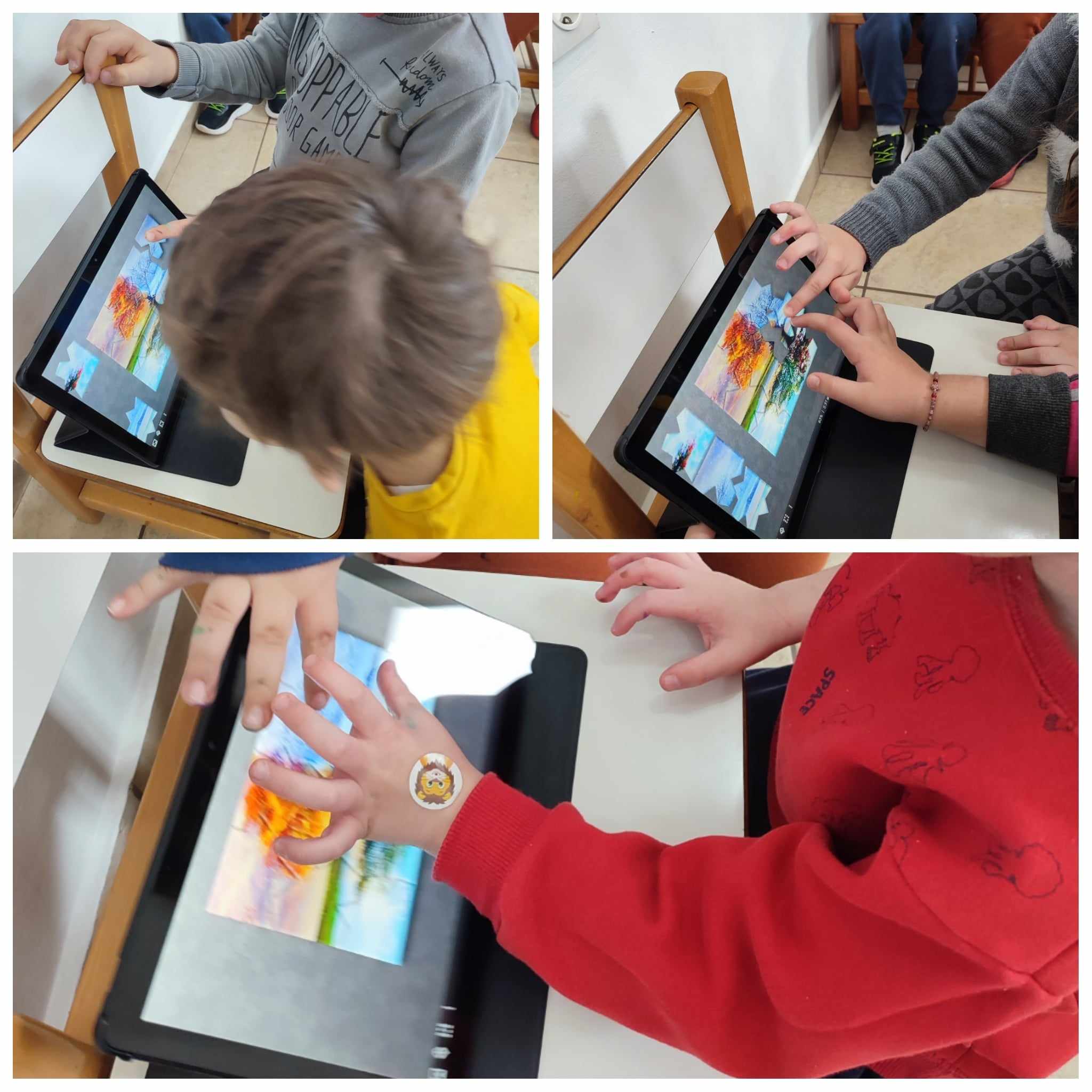 Η αλλαγή του έτους, μας έδωσε την αφορμή να συζητήσουμε εκτενώς για τους μήνες και τις 4 εποχές. Στο ταμπλετ βρήκαμε ένα ηλεκτρονικό παζλ που κίνησε το ενδιαφέρον μας. Όταν το φτιάξαμε, εμφανίστηκε μπροστά μας το δέντρο των εποχών.