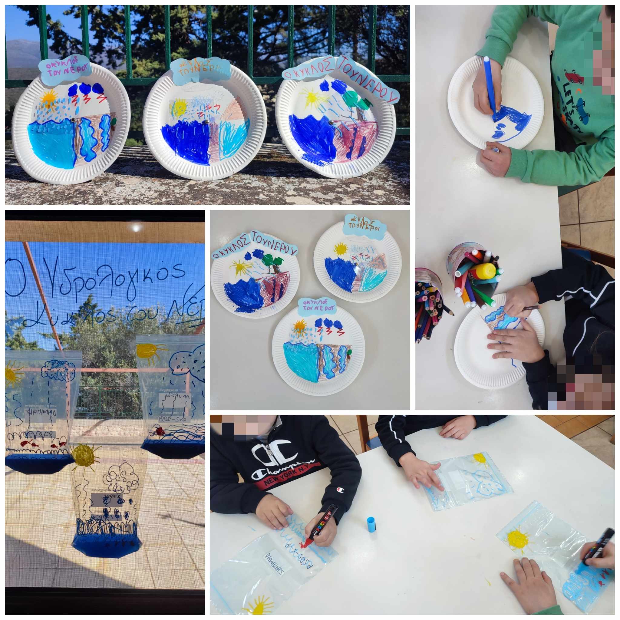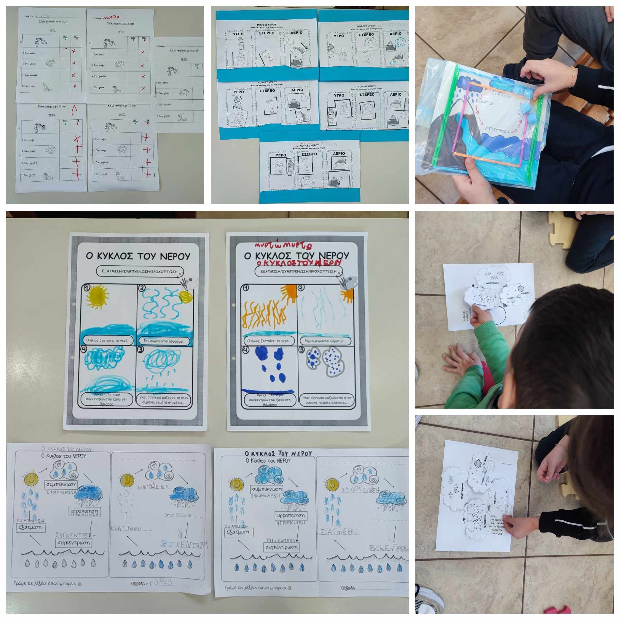 Μετά το πείραμα, μιλήσαμε για τις μορφές του νερού (στερεό, υγρό, αέριο) και μέσα από βιβλία κι εκπαιδευτικά βίντεο μάθαμε για τον κύκλο του νερού.