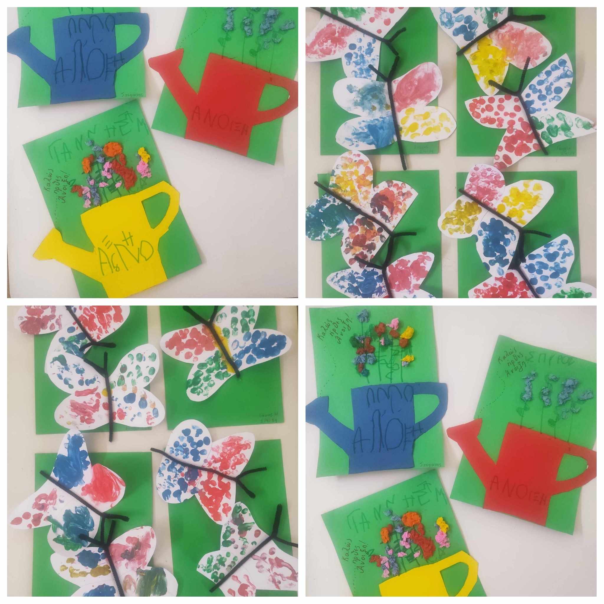 Φτιάξαμε πεταλούδες και λουλούδια που διακόσμησαν την τάξη μας.