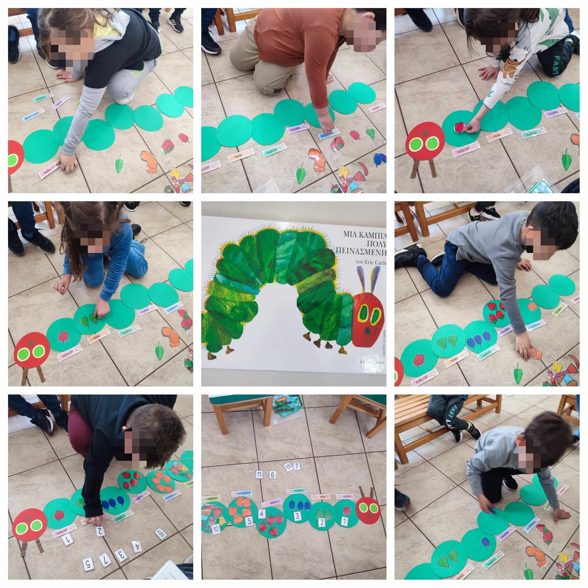 Αφού το διαβάσαμε, προσπαθήσαμε να θυμηθούμε τι έφαγε η κάμπια και με ποια σειρά. Ταυτίσαμε τα φαγητά που έφαγε με τις μέρες της εβδομάδας. Μετρήσαμε τι έφαγε κάθε μέρα η κάμπια κι αντιστοιχίσαμε με το σωστό αριθμό.
